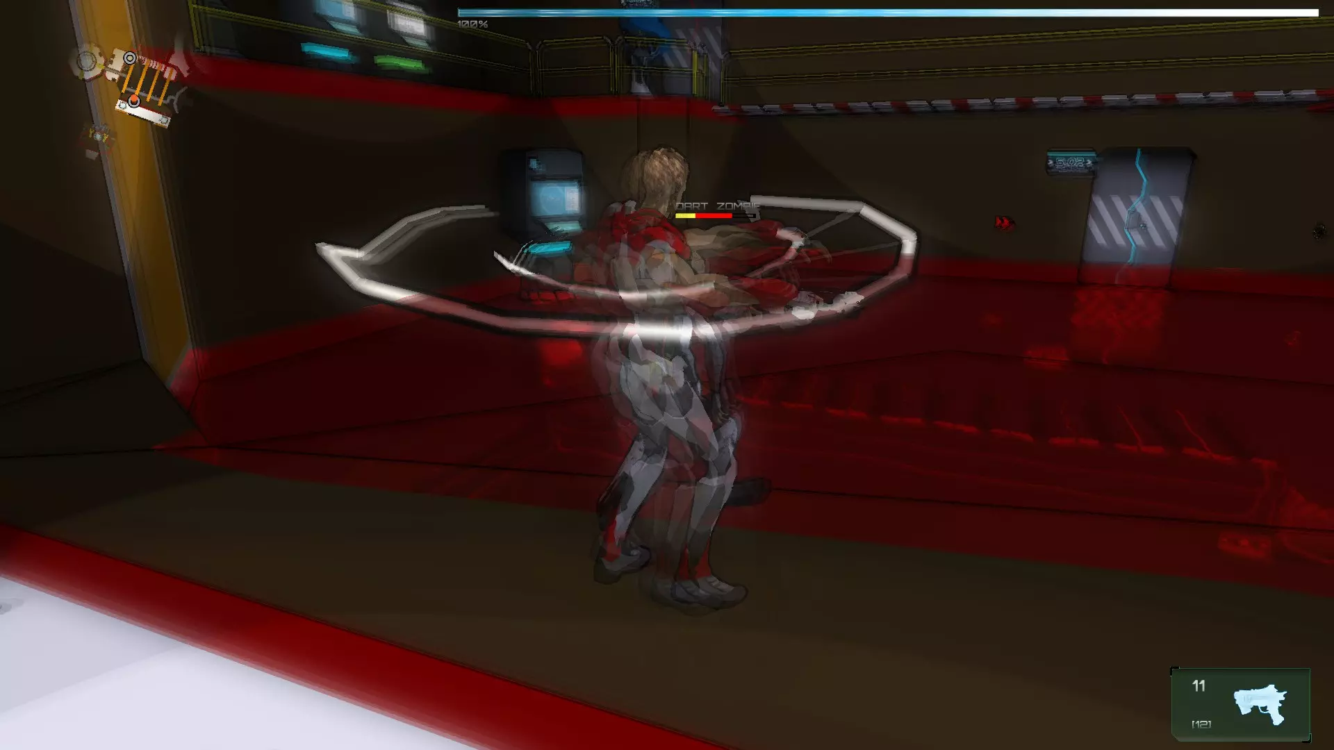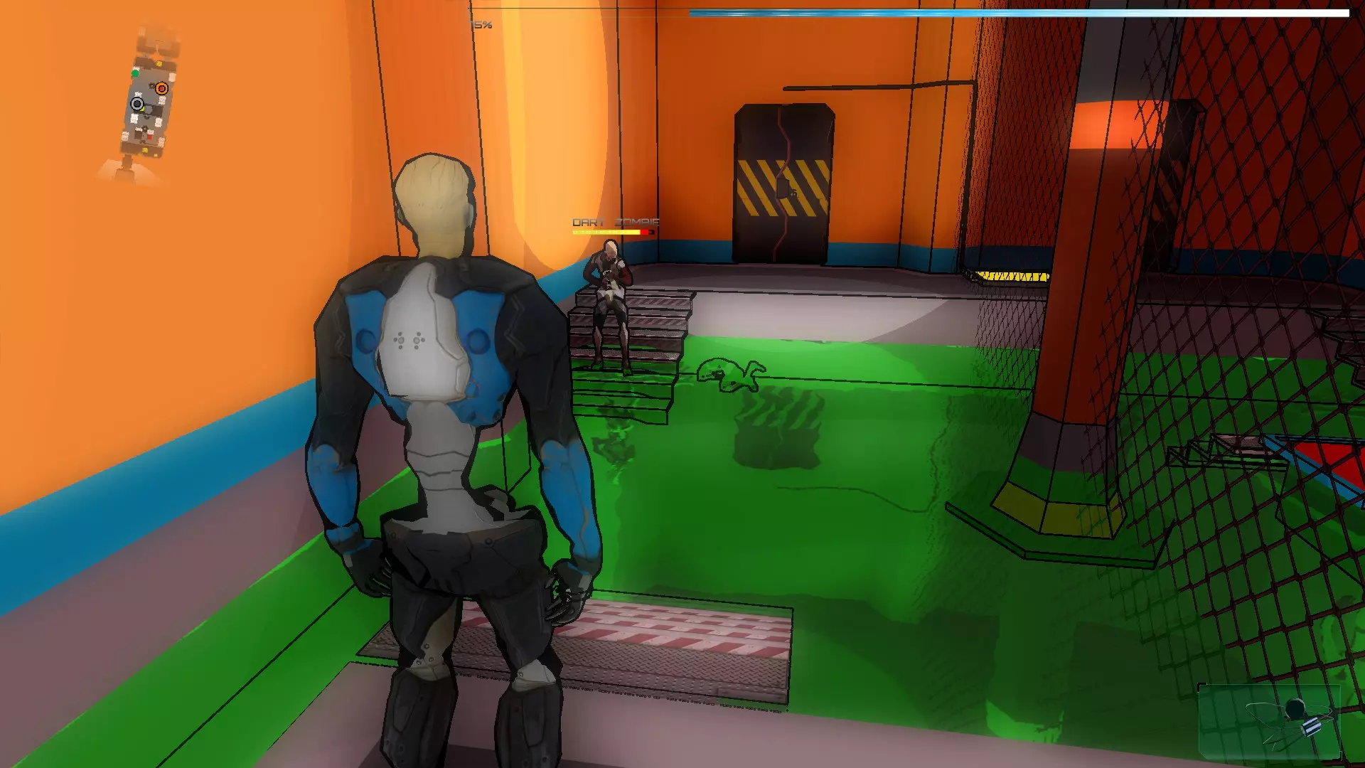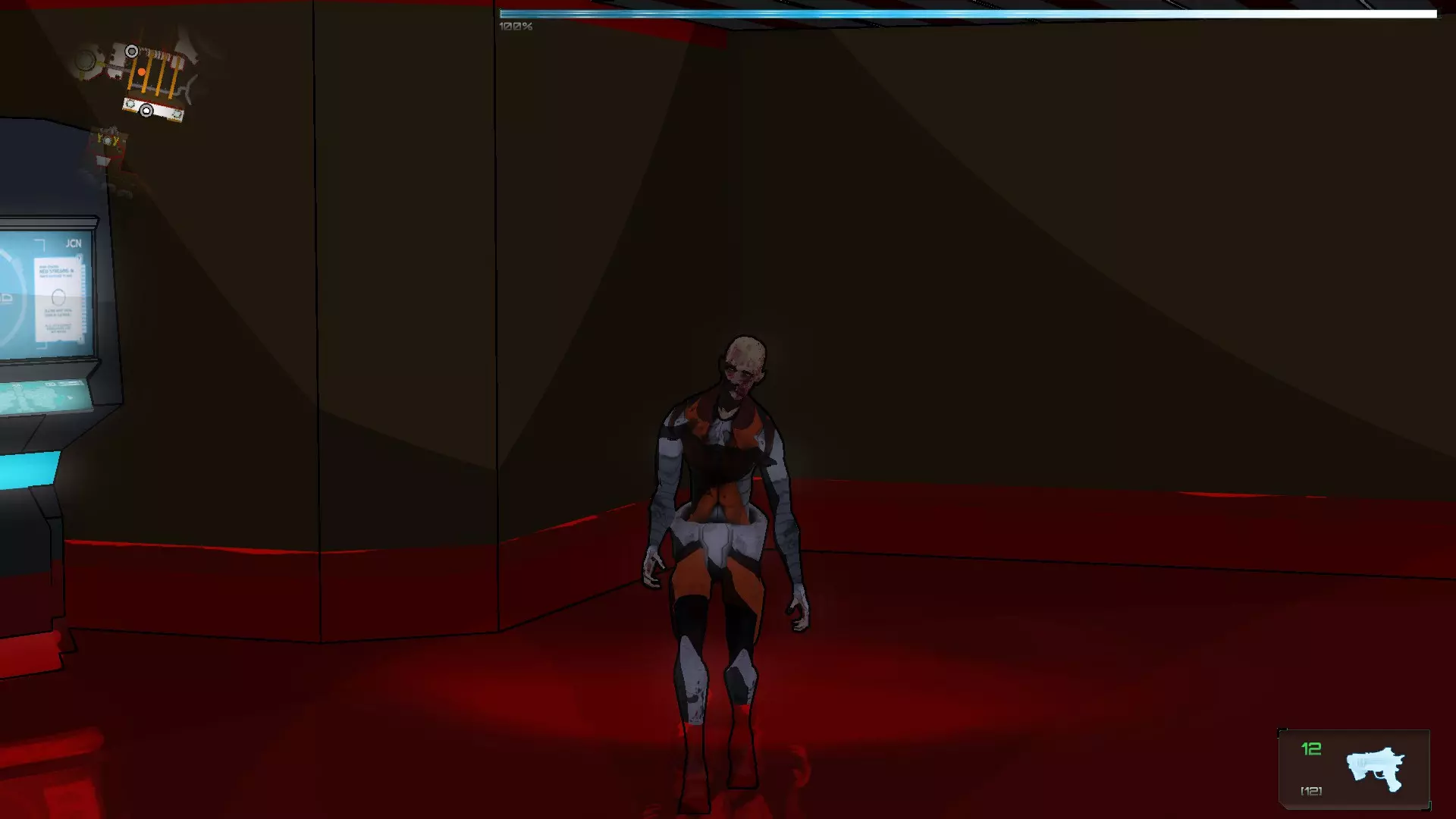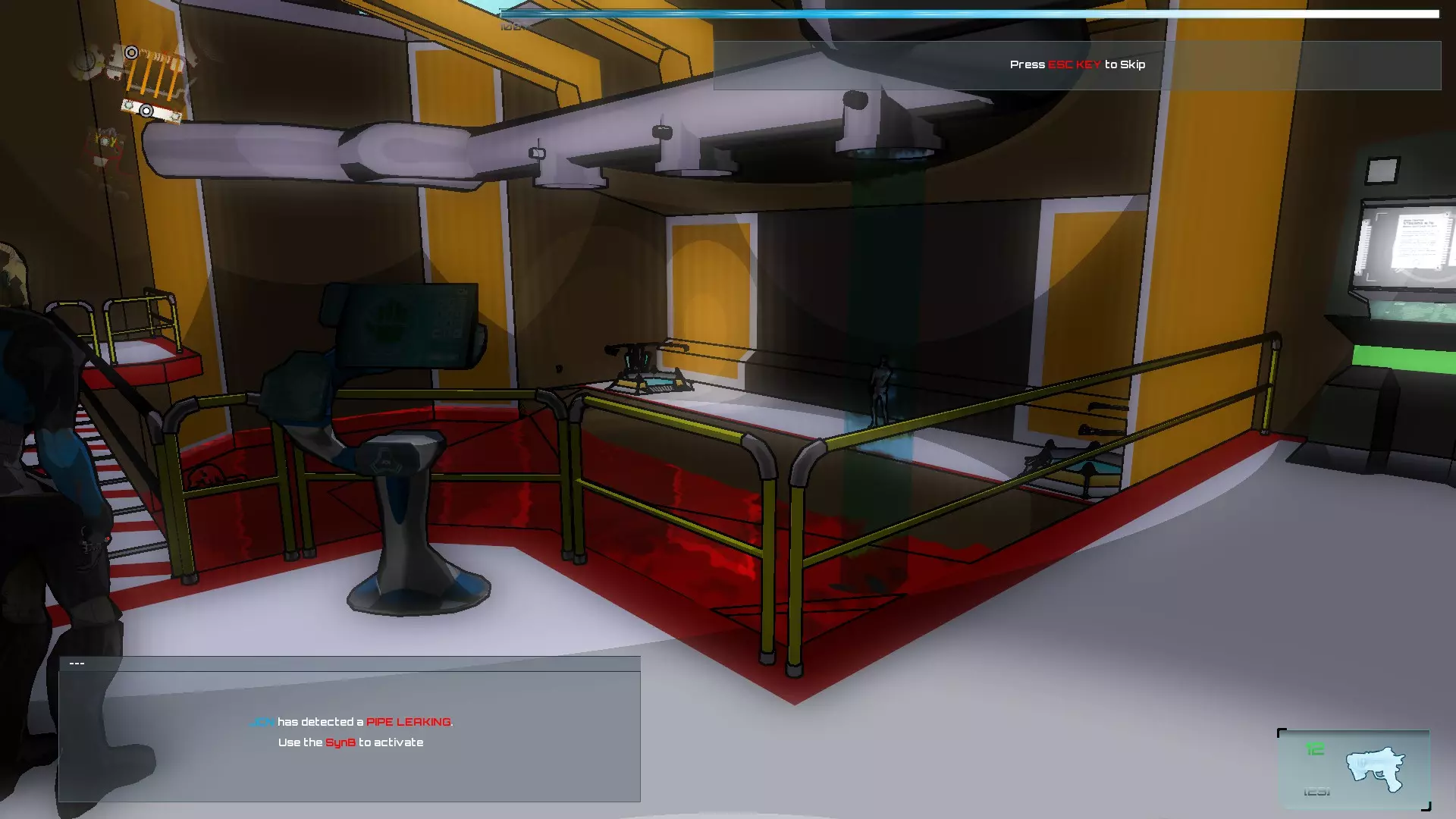进入后会开始一波敌人攻击,首先是僵尸。在这个房间里,我们可以激活中间的终端,然后使用我们的激光(武器的激光也可以作为激活器)激活左右两侧的每个面板,这样水会在一段时间内变成绿色。绿色的水会对被感染的SynBs造成伤害,但不会伤害到你。