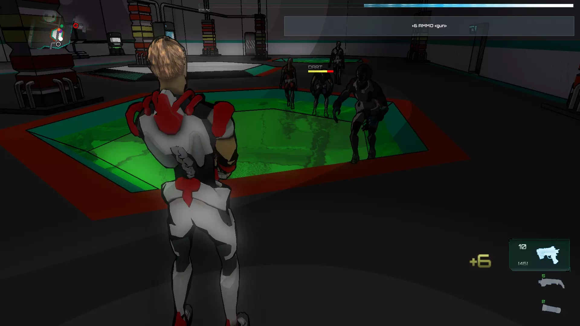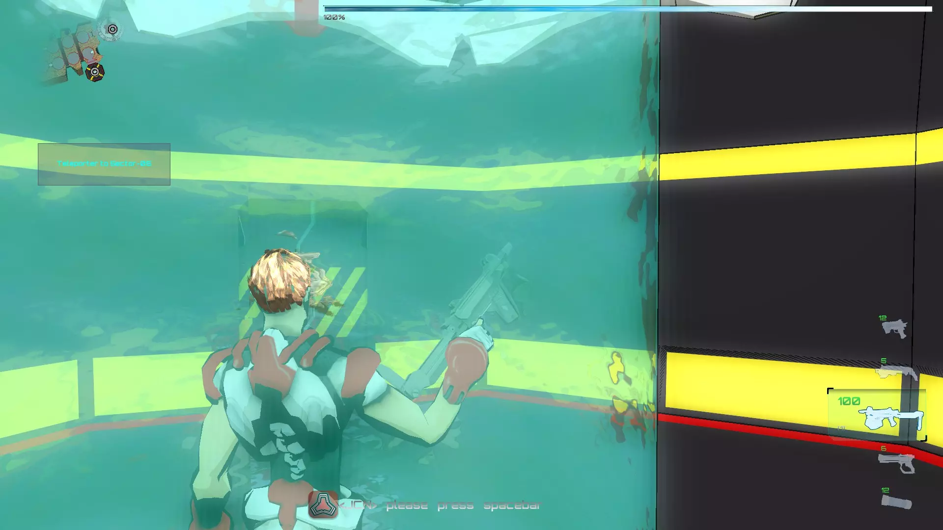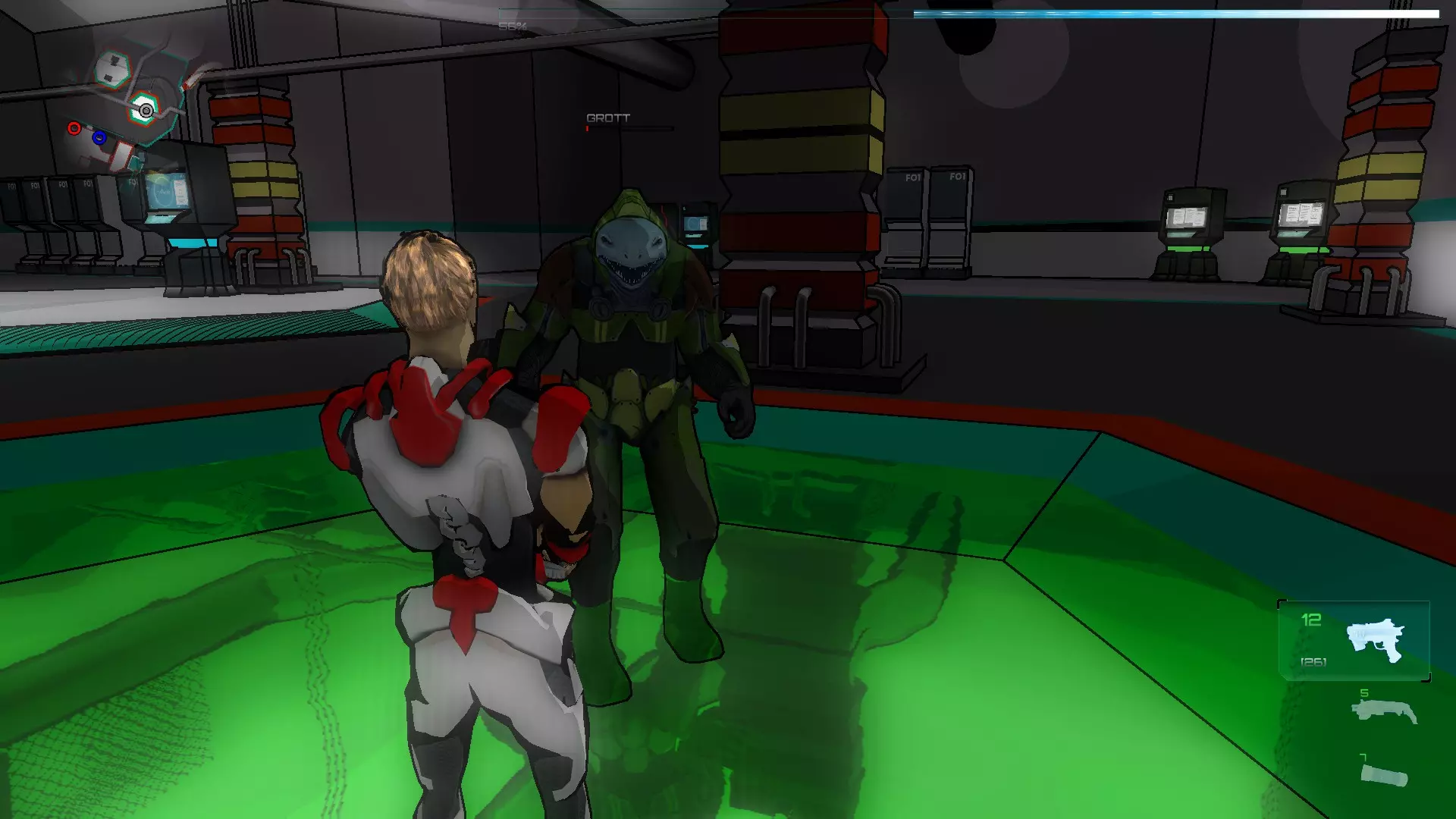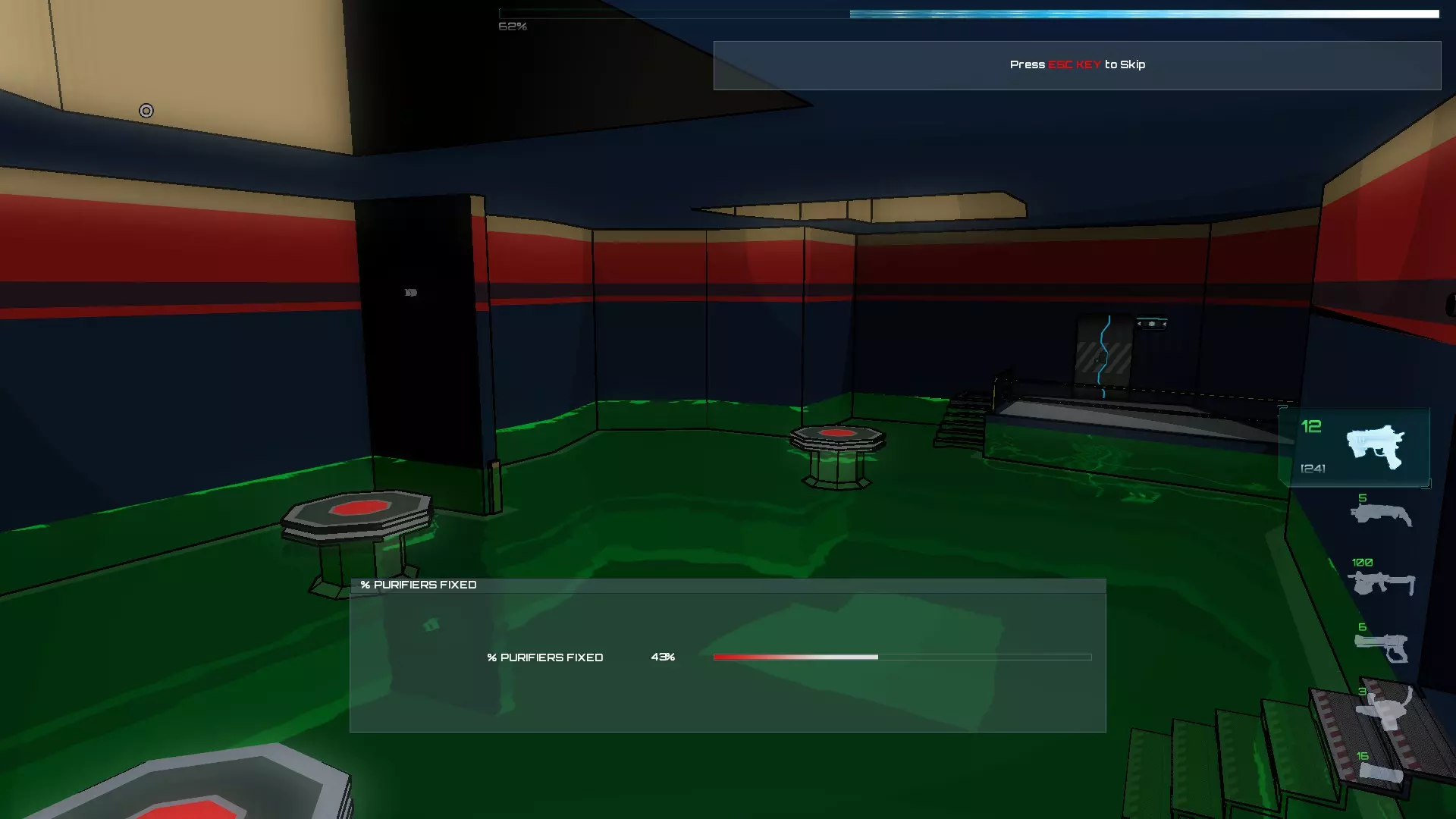 进入后会开始一波敌人攻击,首先是僵尸。在这个房间里,我们可以激活中间的终端,然后使用我们的激光(武器的激光也可以作为激活器)激活左右两侧的每个面板,这样水会在一段时间内变成绿色。绿色的水会对被感染的SynBs造成伤害,但不会伤害到你。