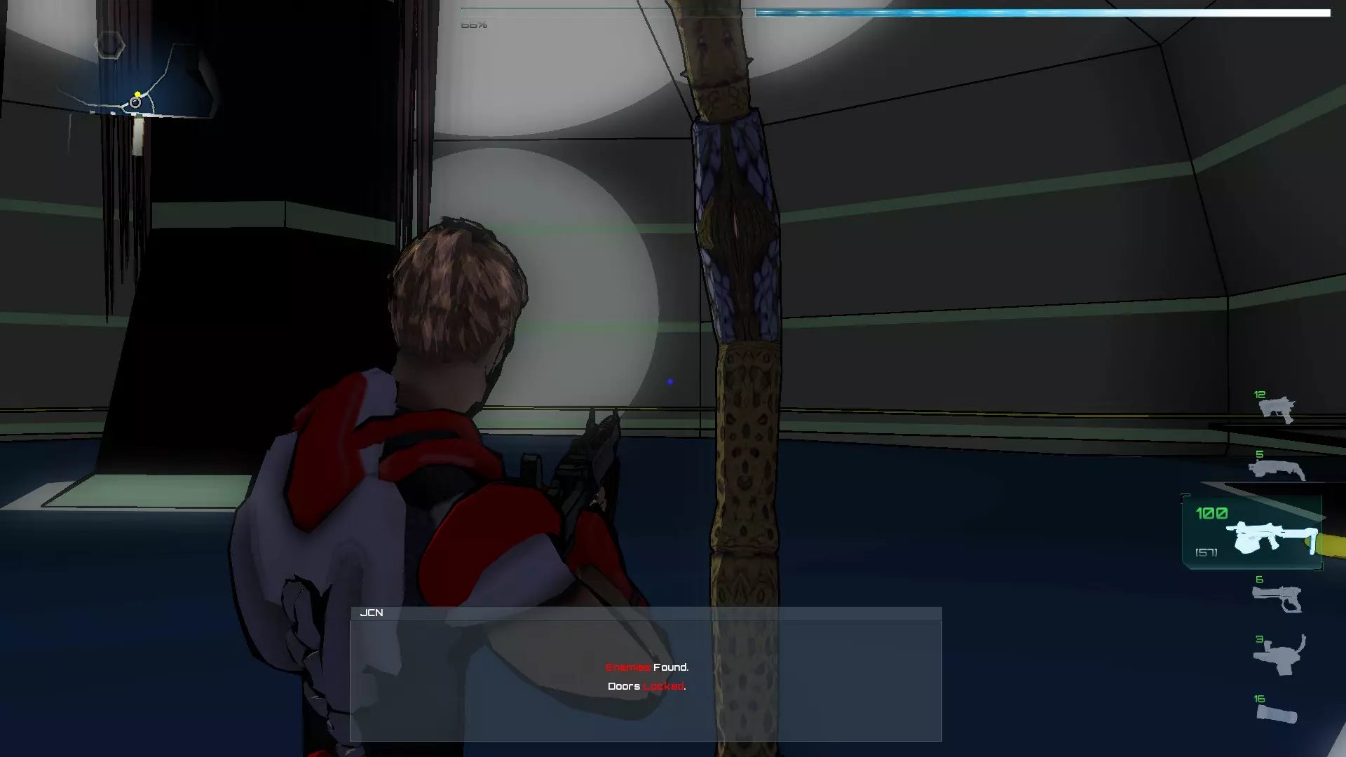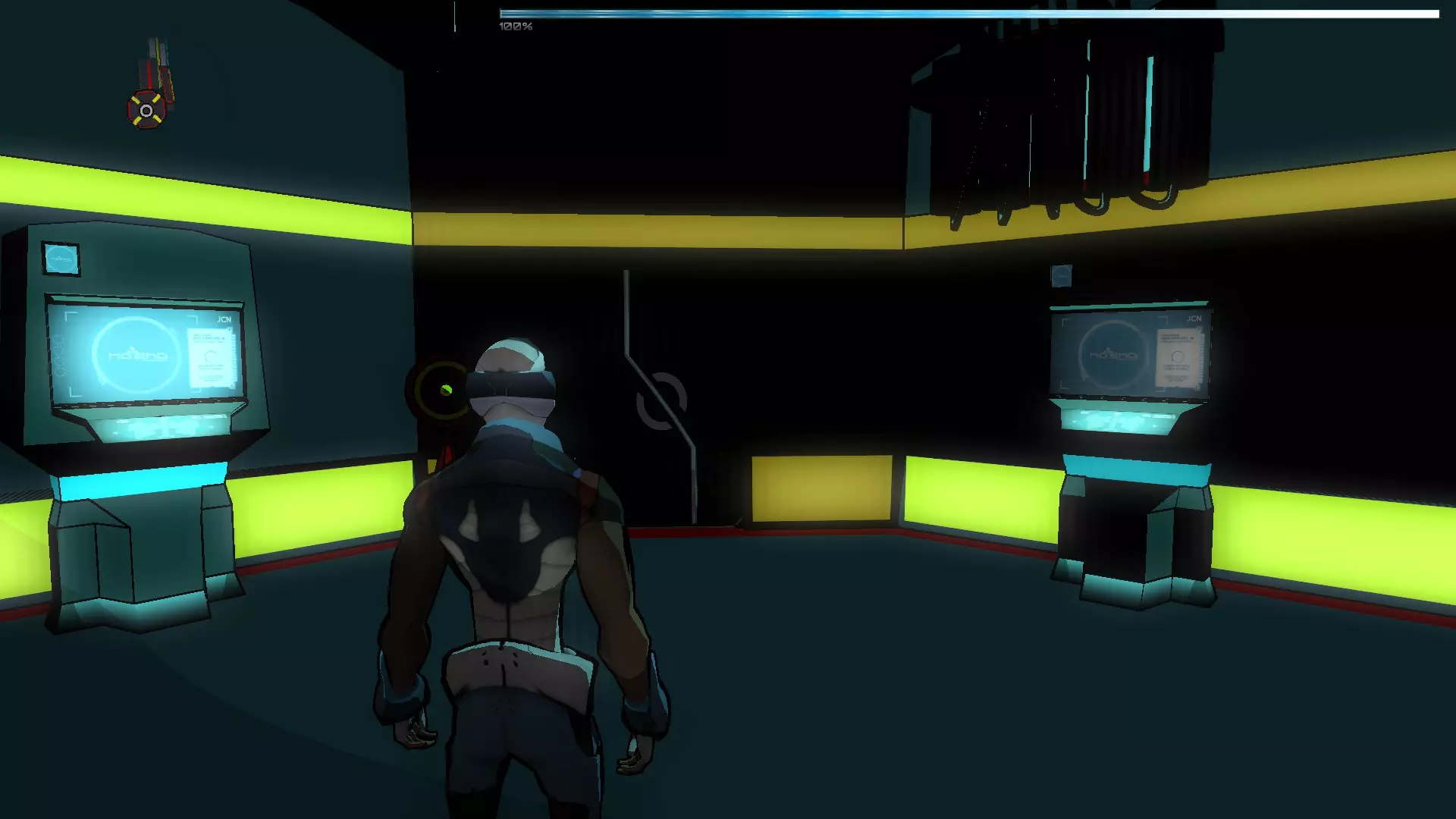 由于门是关着的,我们走左边的路并按下终端机,它会给我们一个密码,我们需要用这个密码来开门解锁,这些密码总是随机的,所以我们必须找到正确的密码。 下一个房间里有一个噪音发生器,这是一种会对与SynB的连接造成干扰的装置。