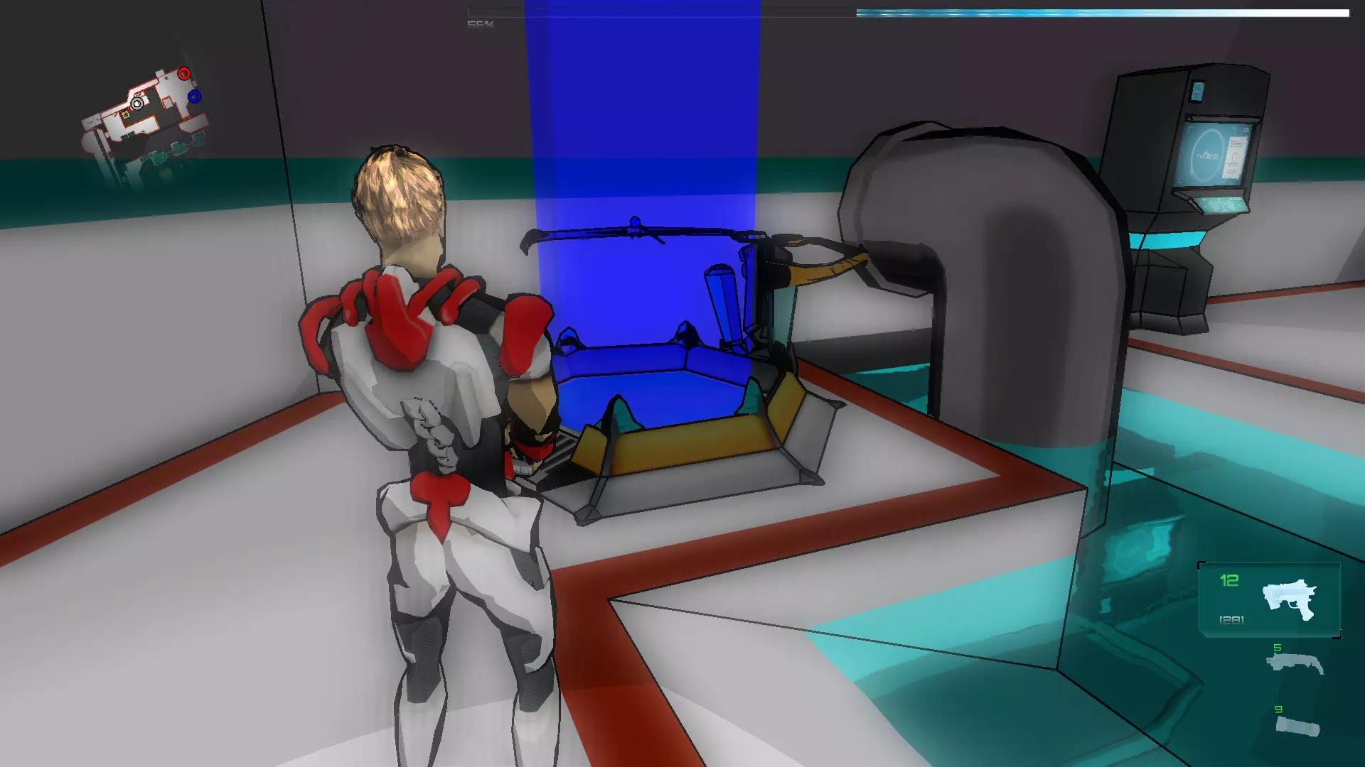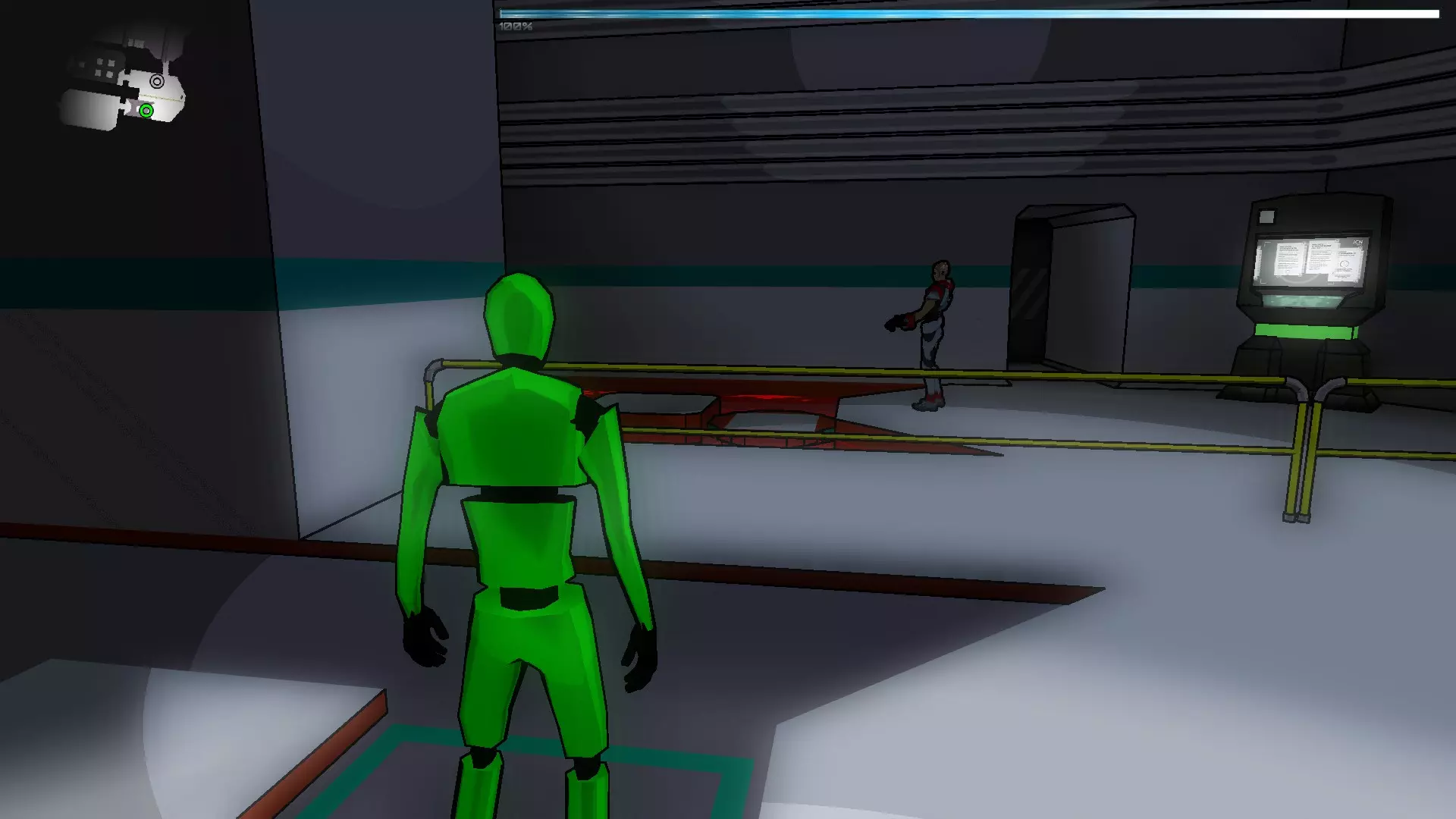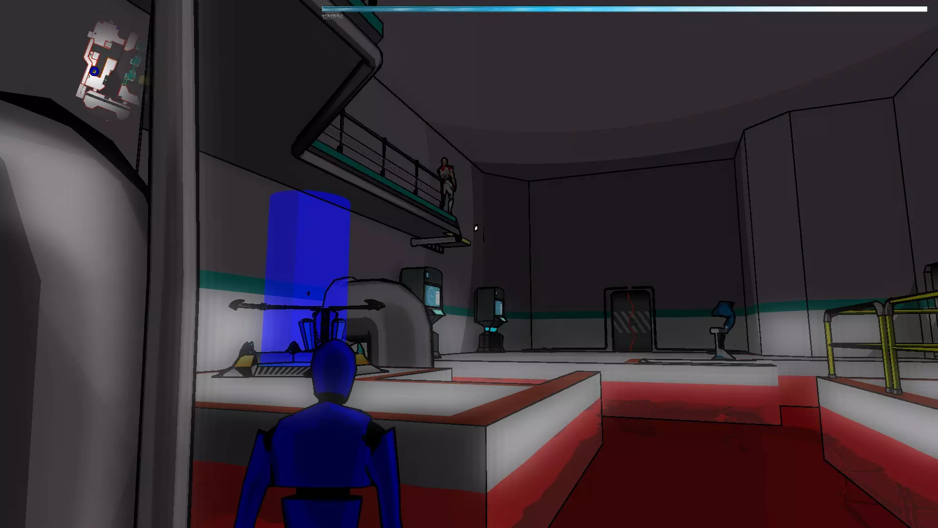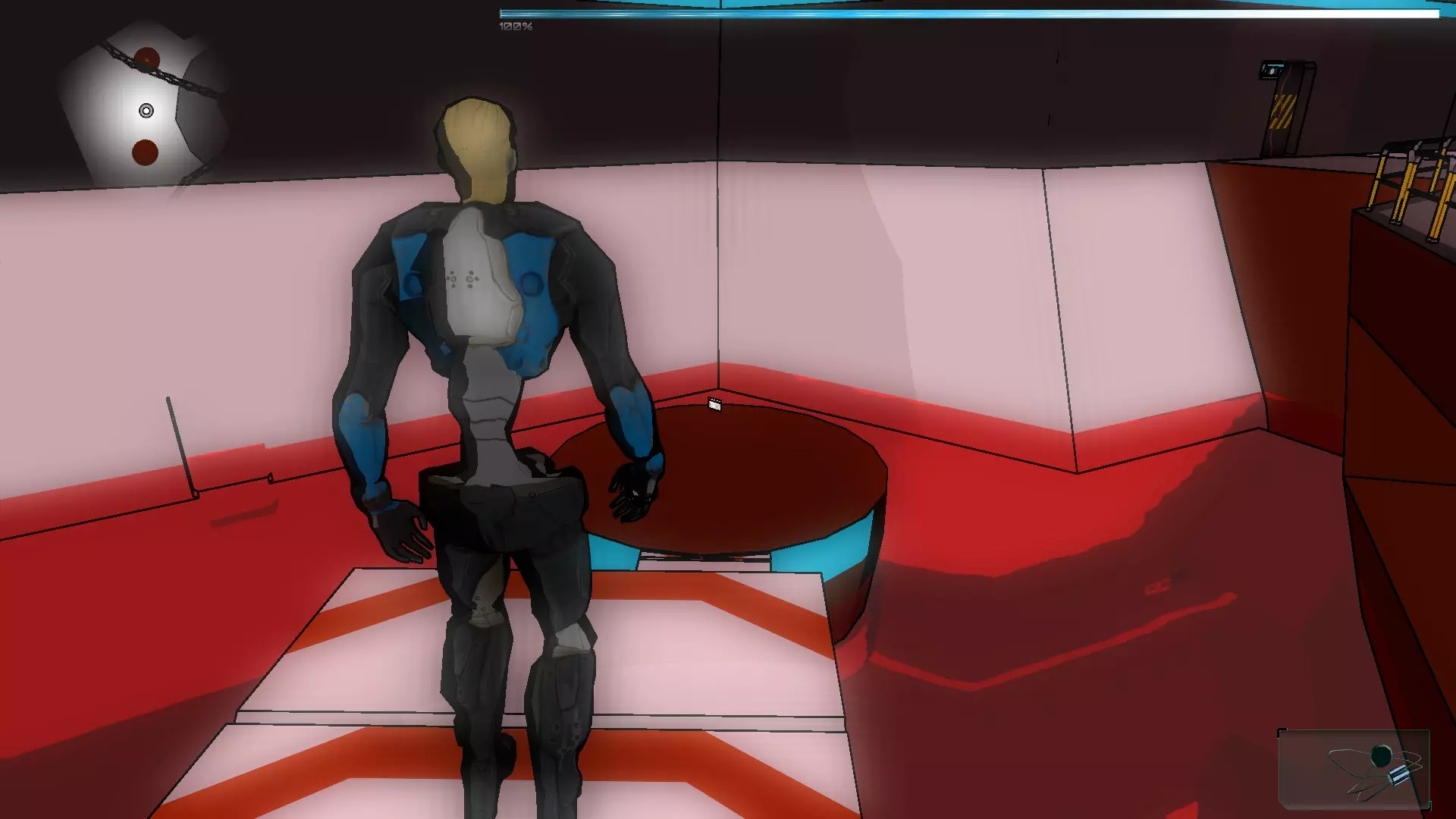 现在开始有趣的部分了,你们需要操控Nexus移动到立方体平台,然后操控绿色假人跑过去把立方体往前推,一直推到门口(注意:一开始可能会失败,所以让立方体正对门口并尽可能“击中”中心位置很重要)。 完成后进入门内,启动净化器,然后前往通往S-01的门,这会带我们到一个大房间,在那里启动绿色水源,之后回到红色假人所在的位置,拿起蓝色射线。