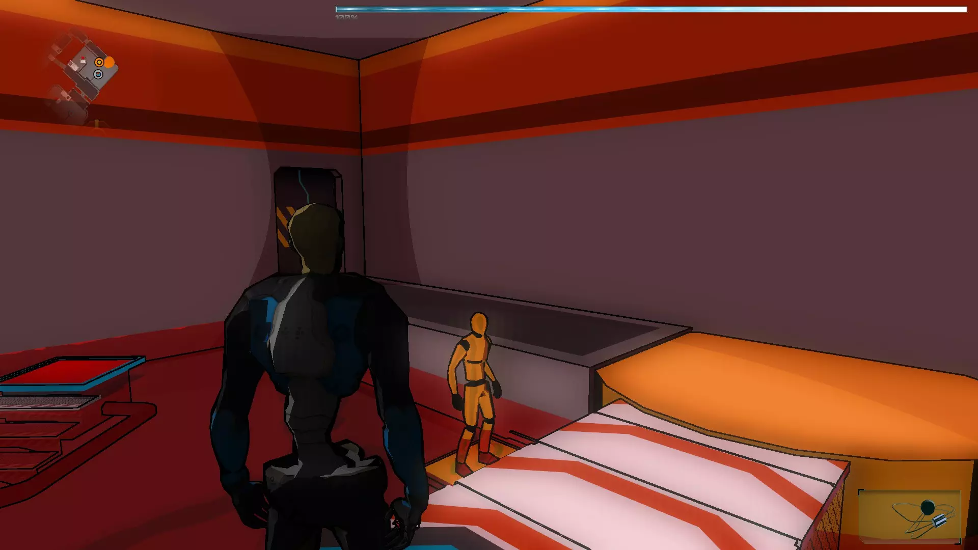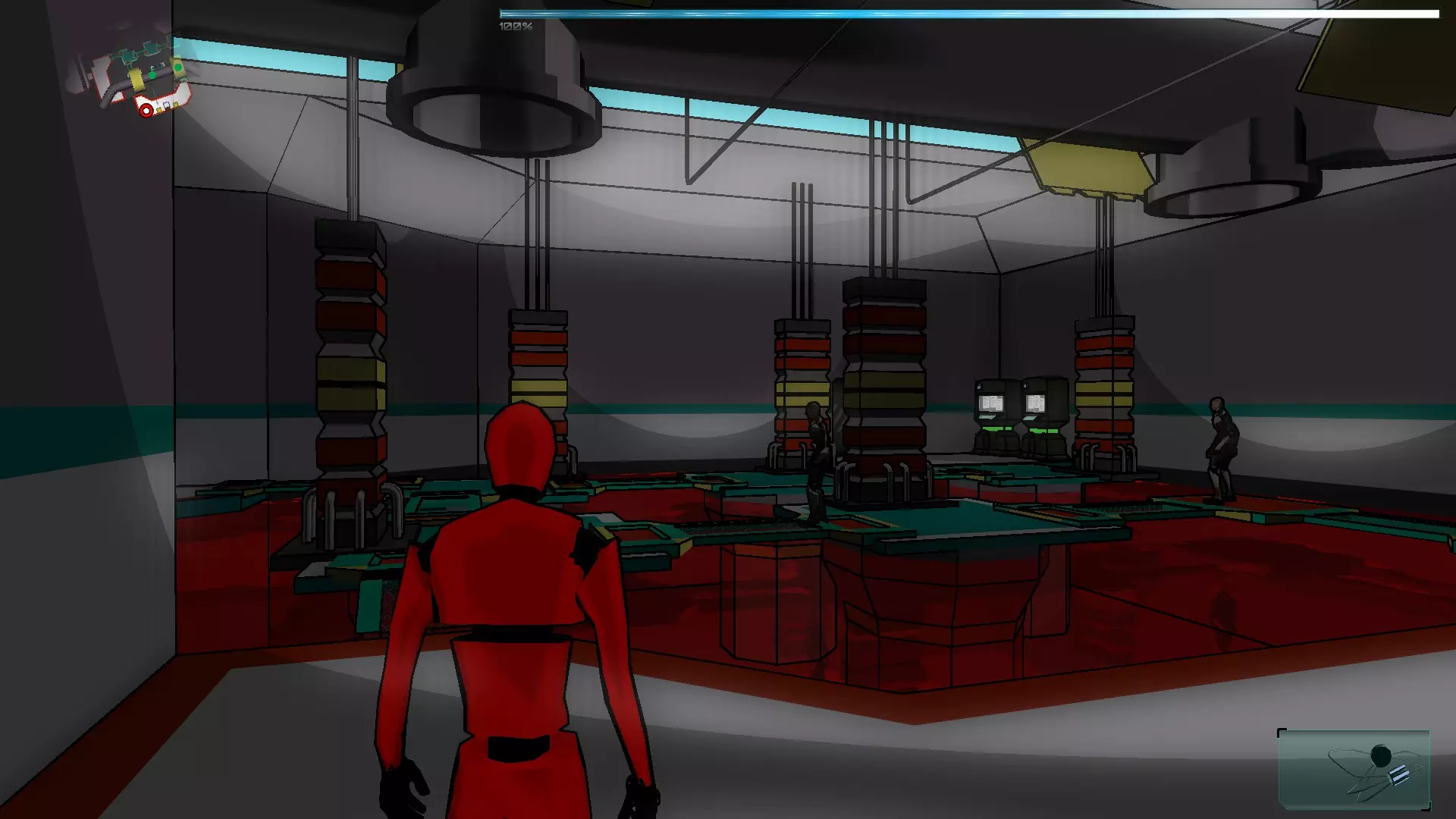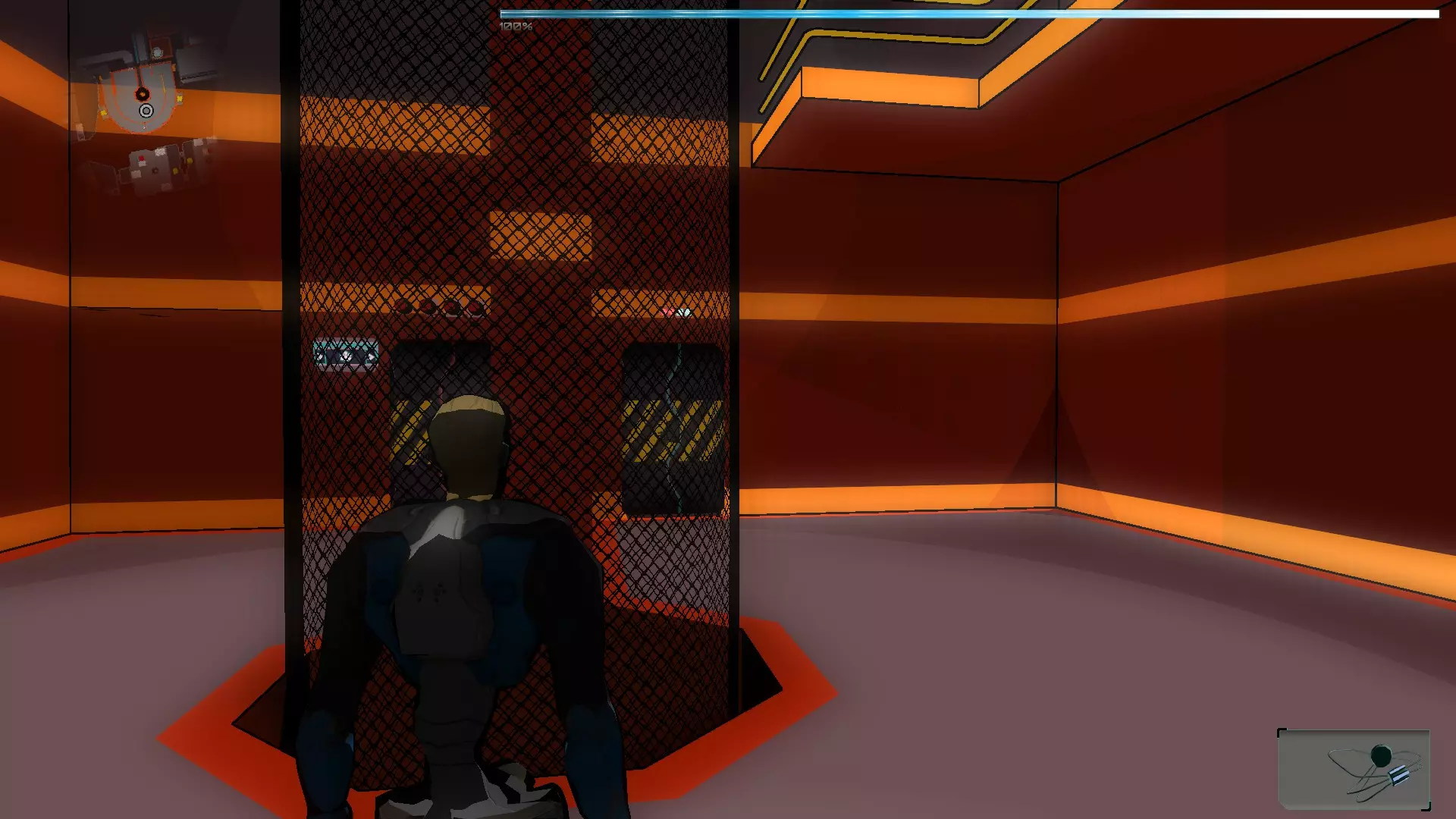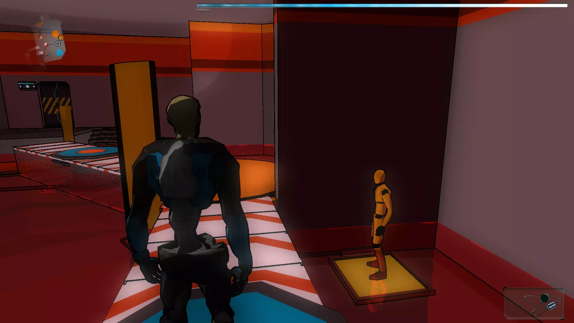 在接下来的场景中有2个终端,首先我们需要激活走廊尽头的那个,这样我们就能到达橙色假人处。拿到橙色假人后,我们将两个SynBs(同步体)带出房间,然后使用伊格尔(Ighel)激活另一个终端。现在我们需要关注橙色假人房间门旁边的那扇门。我们必须改变第一个终端的激光方向,因为如果激光相互碰撞,电路就无法闭合。完成后,我们带着橙色假人进入下一个房间。