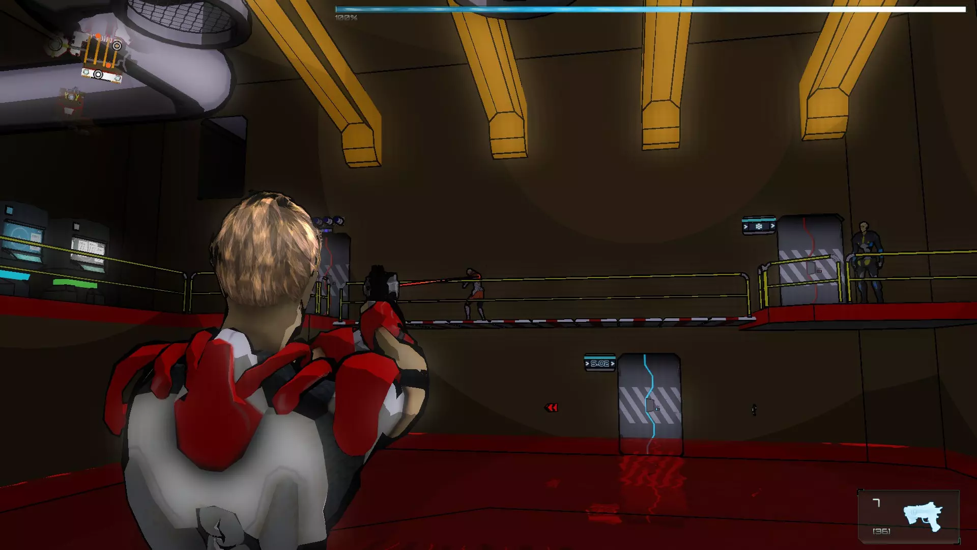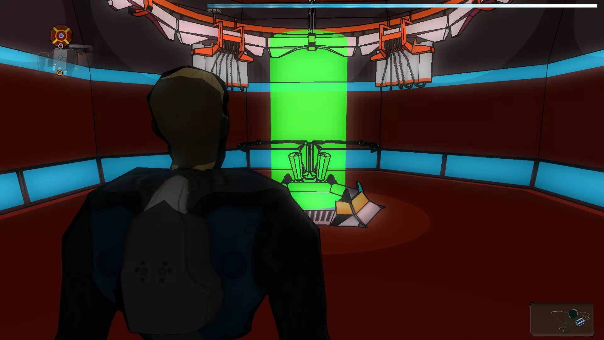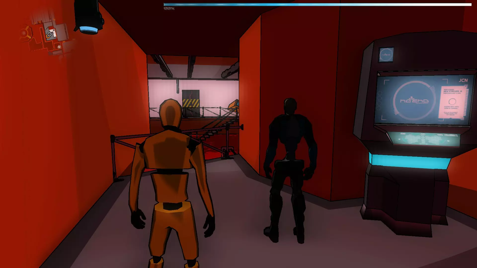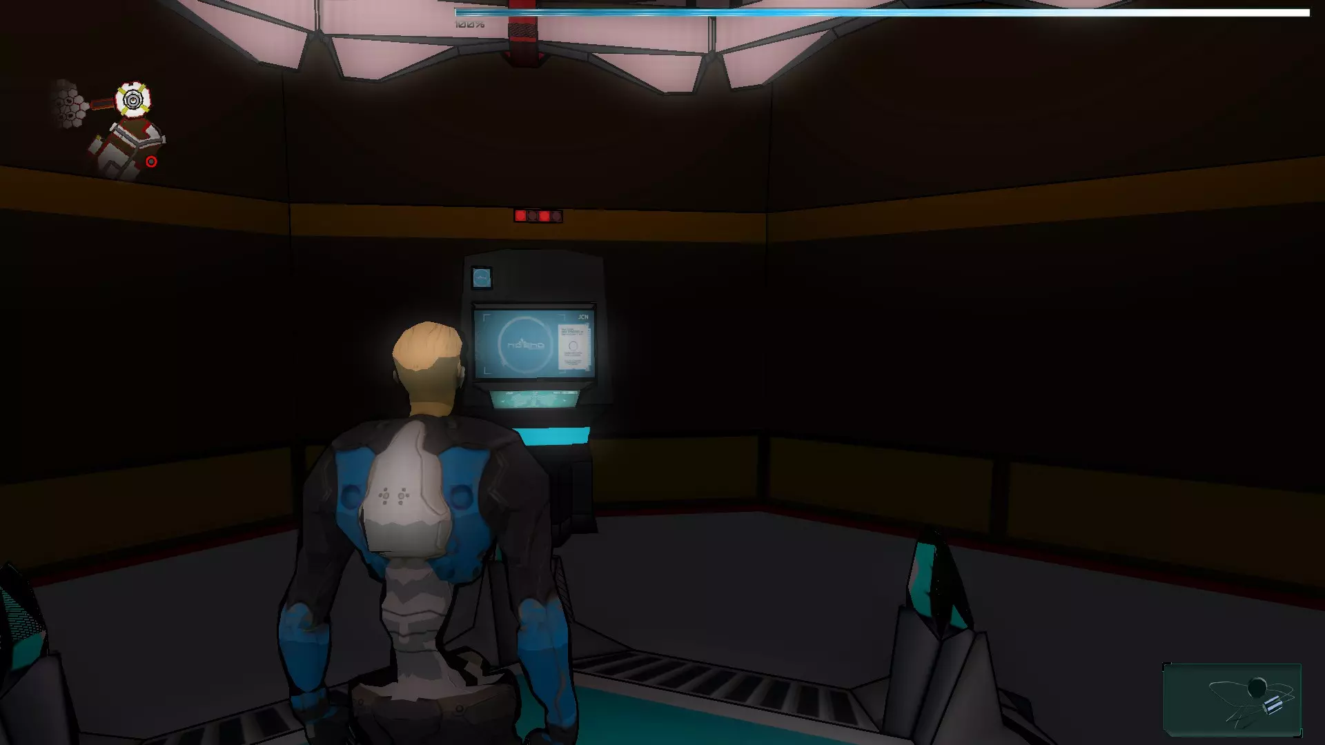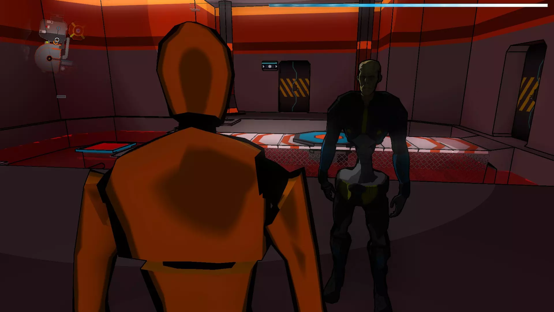 在接下来的场景中有2个终端,首先我们需要激活走廊尽头的那个,这样我们就能到达橙色假人处。拿到橙色假人后,我们将两个SynBs(同步体)带出房间,然后使用伊格尔(Ighel)激活另一个终端。现在我们需要关注橙色假人房间门旁边的那扇门。我们必须改变第一个终端的激光方向,因为如果激光相互碰撞,电路就无法闭合。完成后,我们带着橙色假人进入下一个房间。