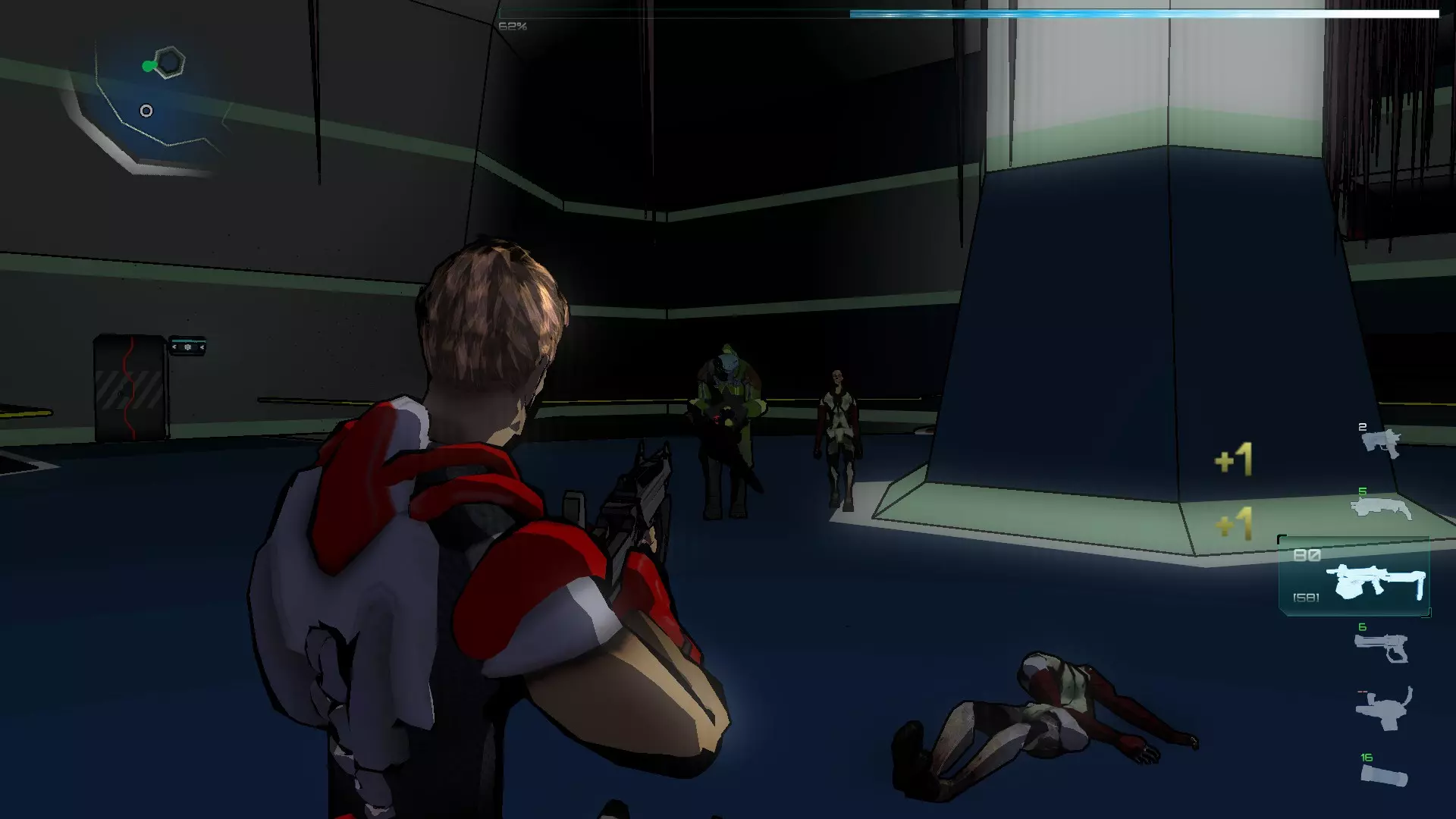 完成此操作后,切换到我们留在01区的枢纽,回到02区的大厅,会有几只红色飞镖怪发起攻击。它们非常难缠,而且我们不能使用绿色药水,所以要等它们靠近后用霰弹枪射击。如果它们进入“混乱”状态,就用V型 blade进行近战攻击。当它们倒地时,不要靠近,因为在它们起身之前你根本没时间使用V型 blade。