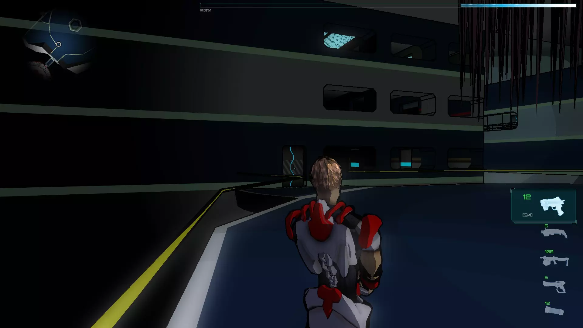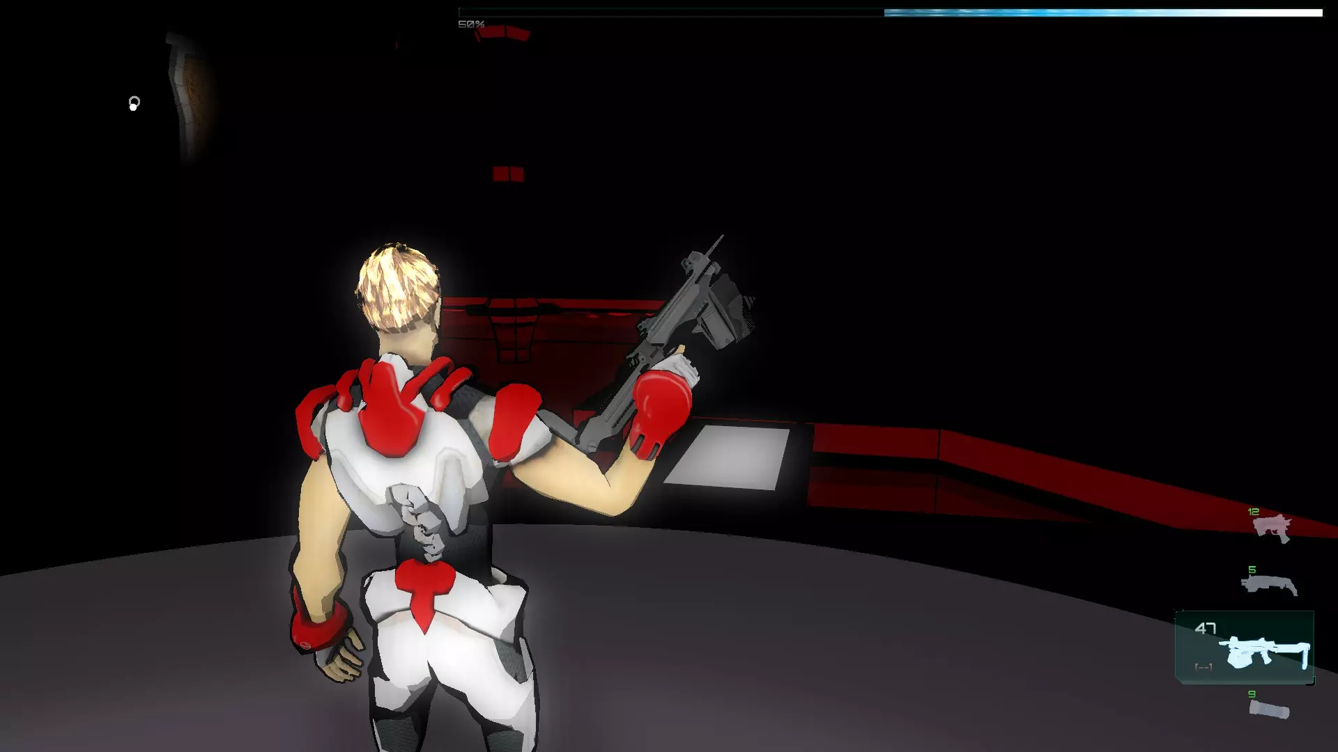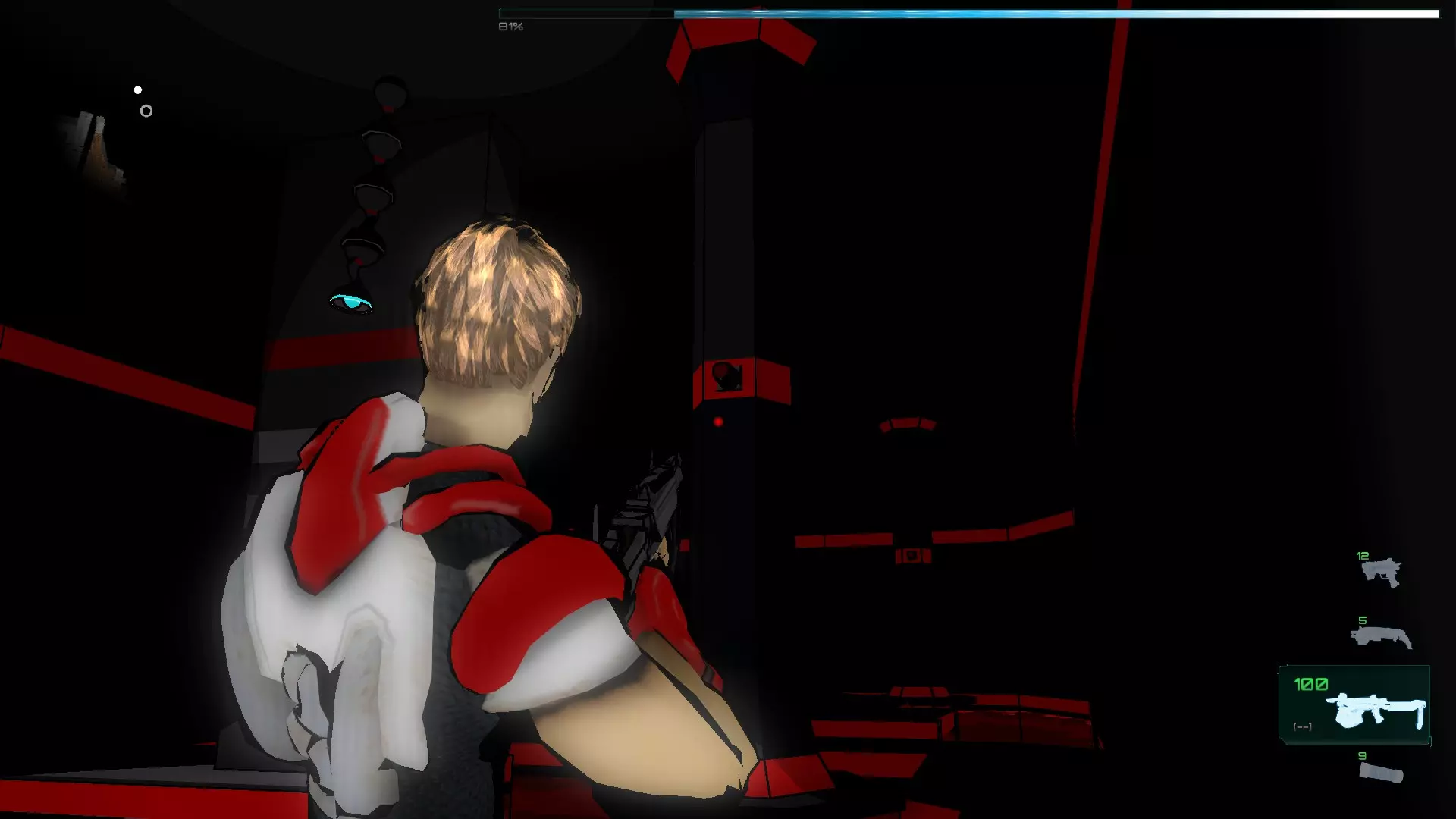 我们通过传送门进入暗室,拿起机枪(以及你们看到的物品),然后沿着唯一的路径前进。在这个房间里有红色激活器,我们需要启动它们,使平台暂时升起,以便我们到达终点。