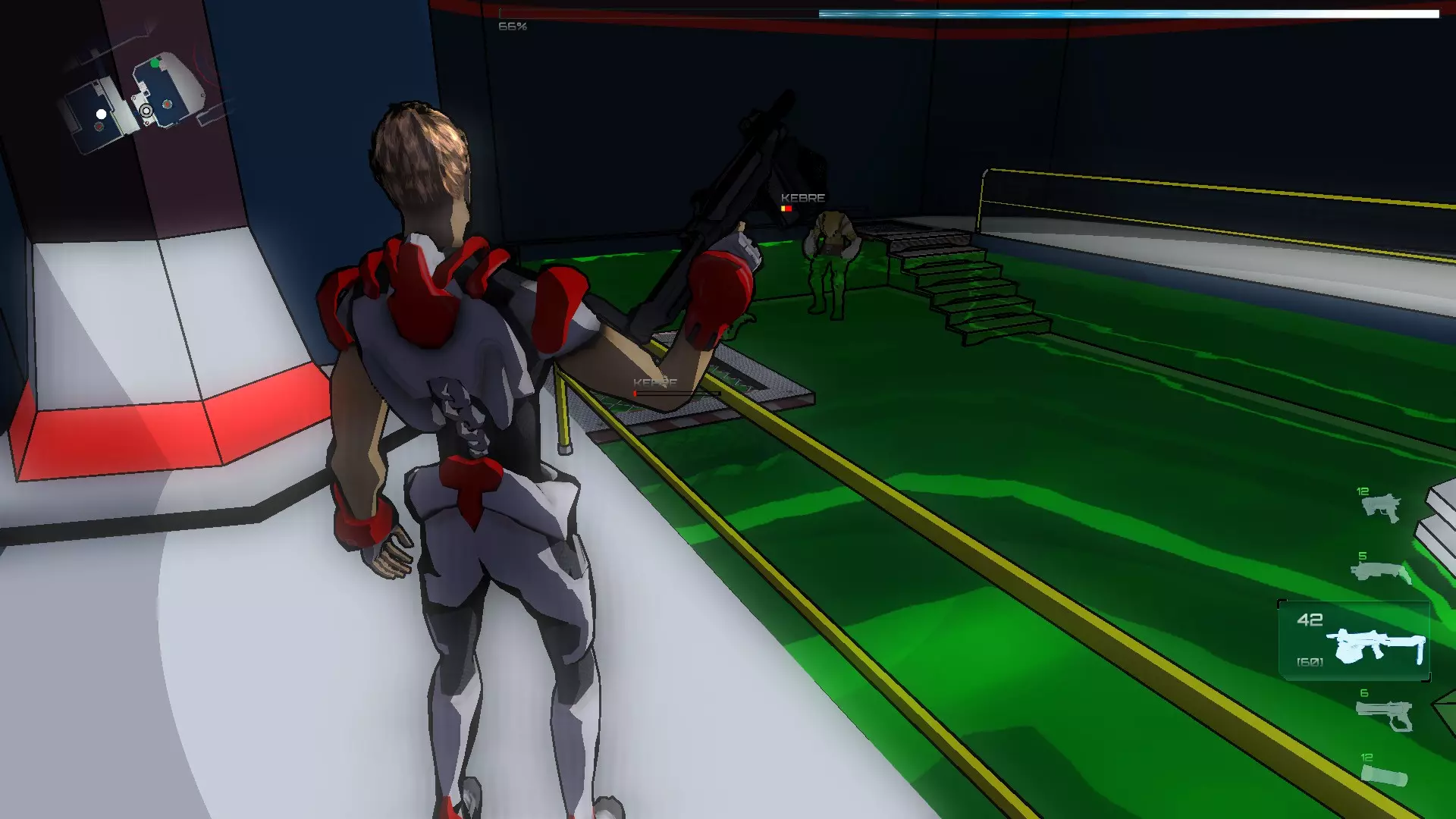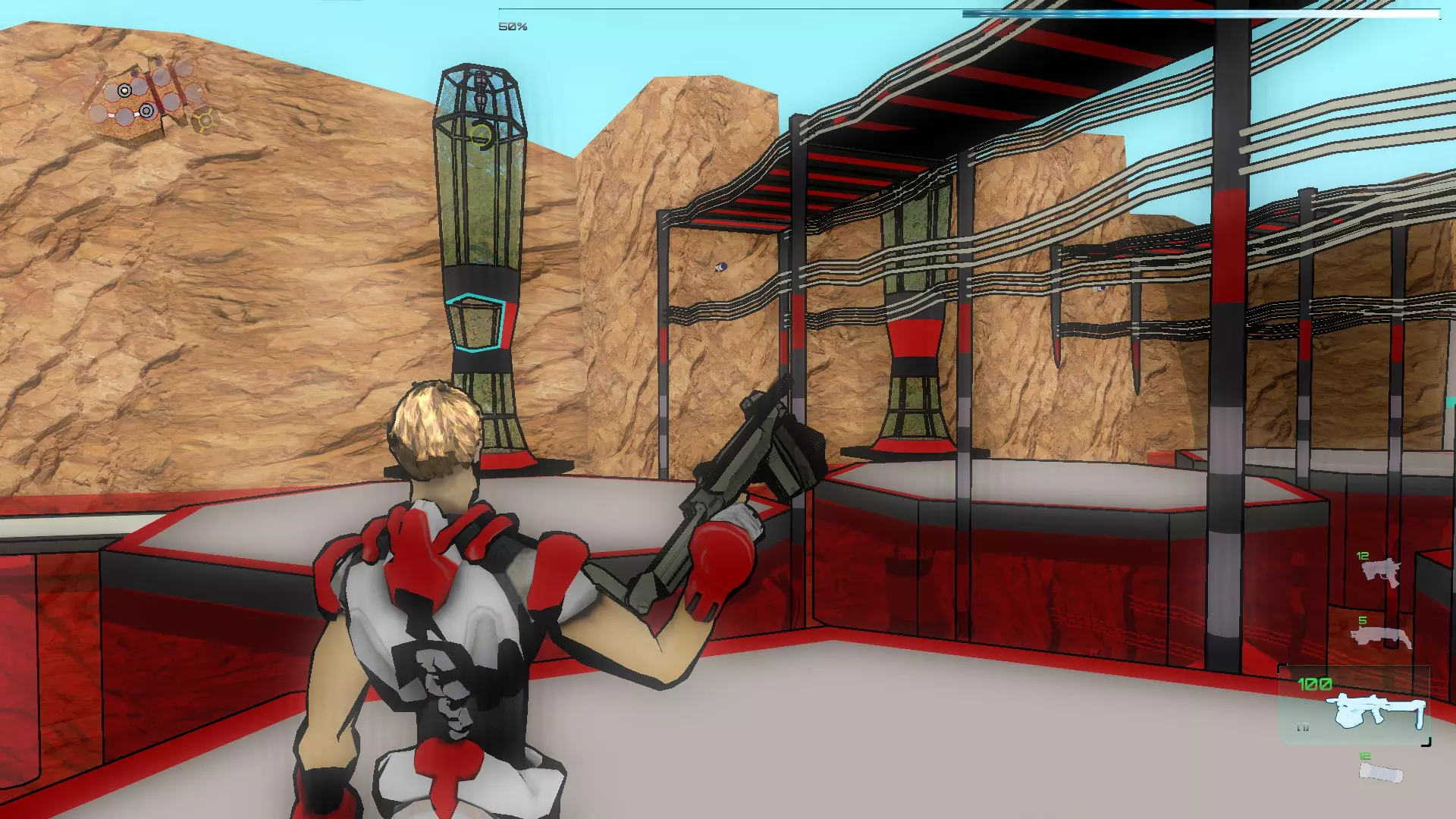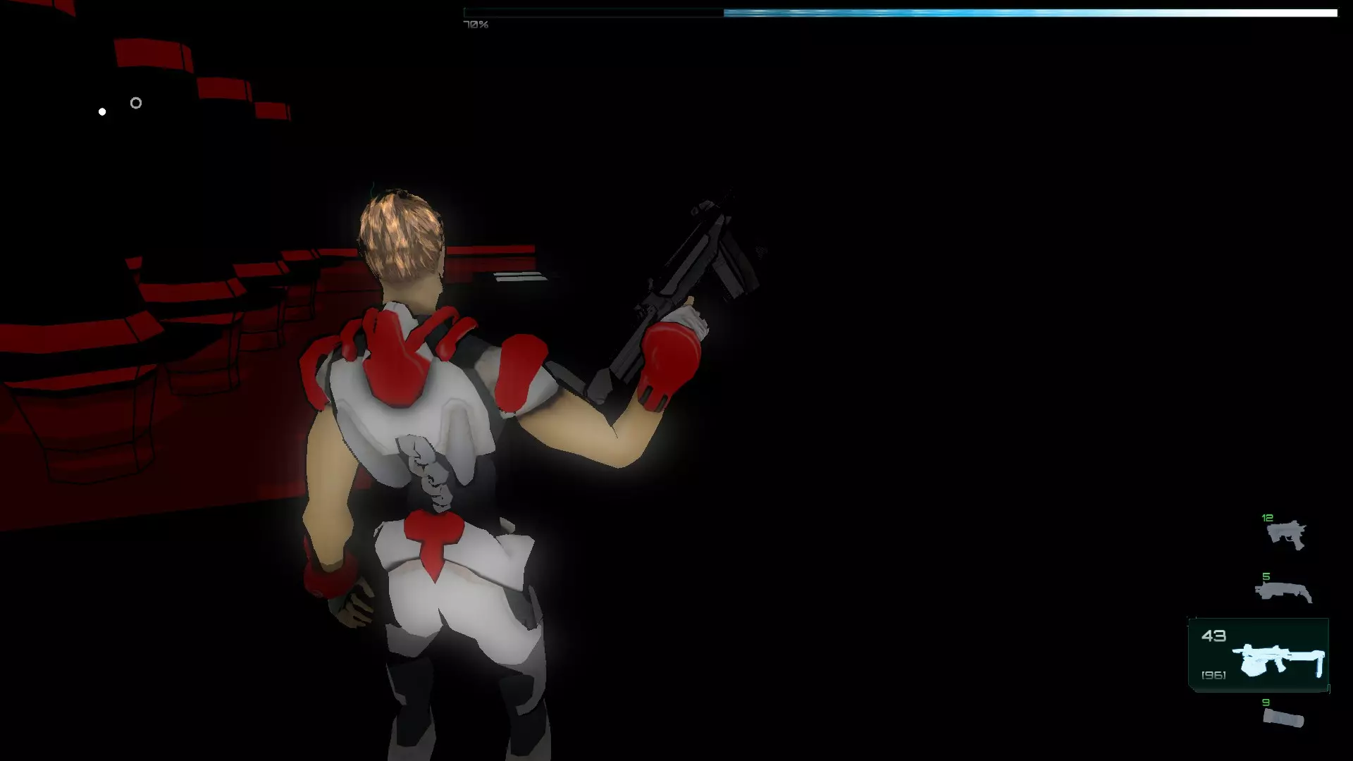 我们通过传送门进入暗室,拿起机枪(以及你们看到的物品),然后沿着唯一的路径前进。在这个房间里有红色激活器,我们需要启动它们,使平台暂时升起,以便我们到达终点。