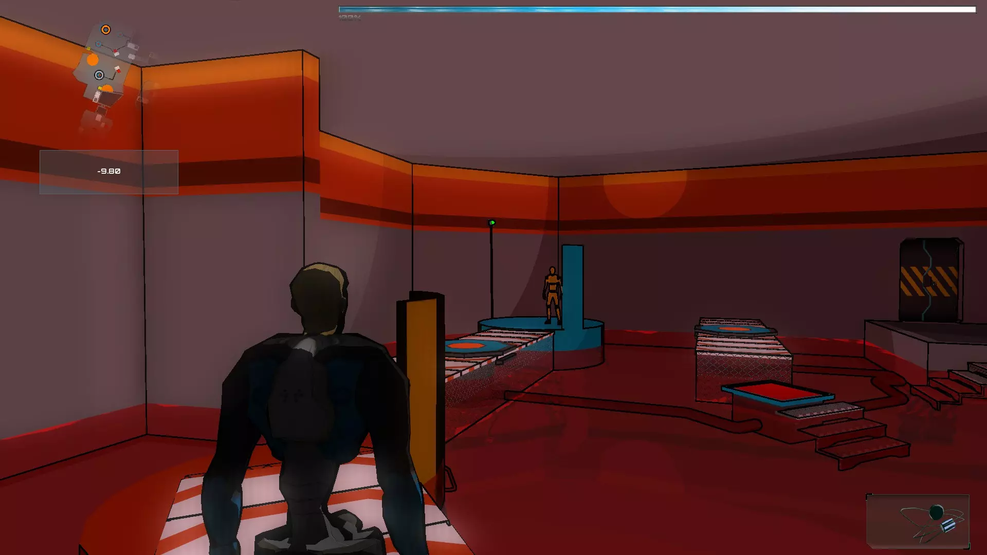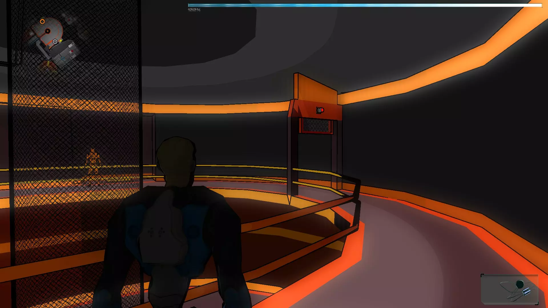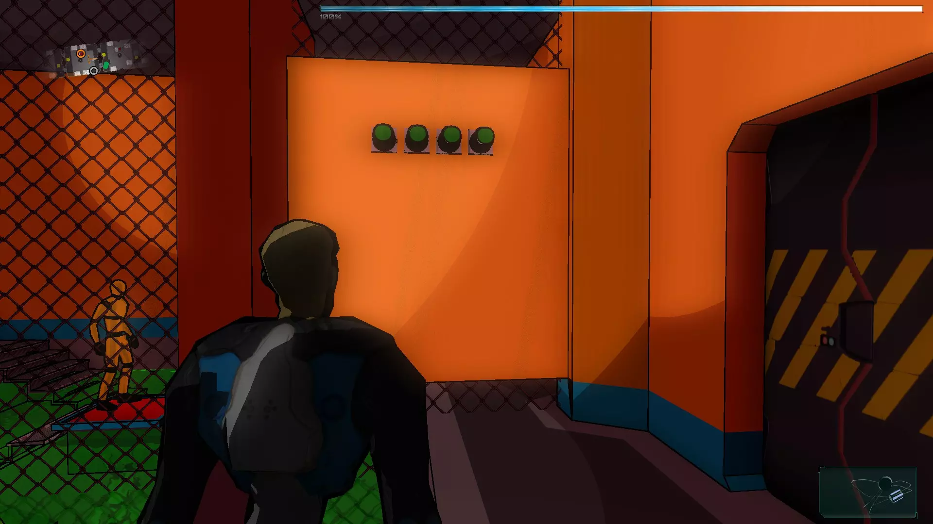 我们继续前往下一个房间,乘坐左侧的电梯。出来后选择橙色假人,将其从压力平台上降下。降下后,噪音器不会出现连接故障。之后我们返回伊格尔,激活栅栏旁的面板,在栅栏关闭前让橙色假人通过。