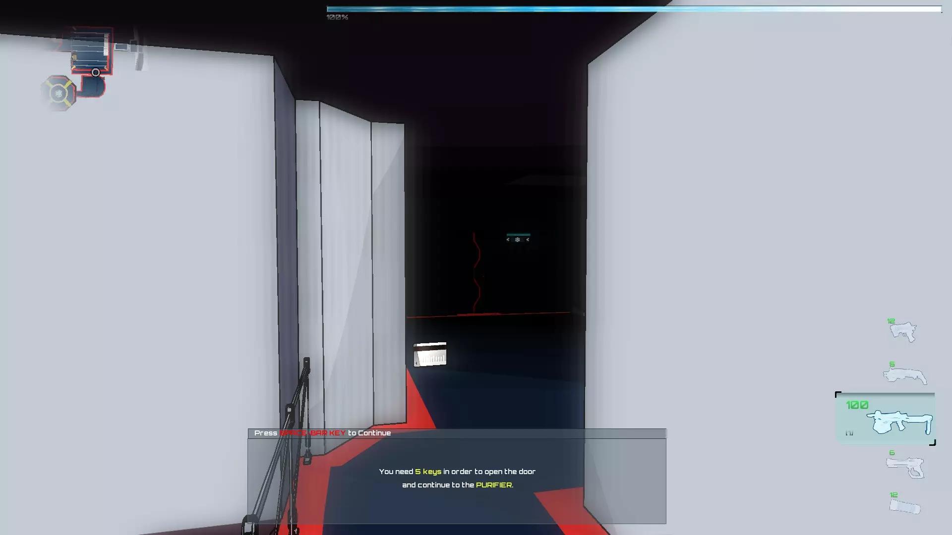 穿过最后一扇门,我们来到一个有两扇紧闭大门的大房间。如果我们走向净化器所在的那扇门,会被告知需要三张位于实验室的卡片,这些卡片将允许我们进入实验室一楼的入口。