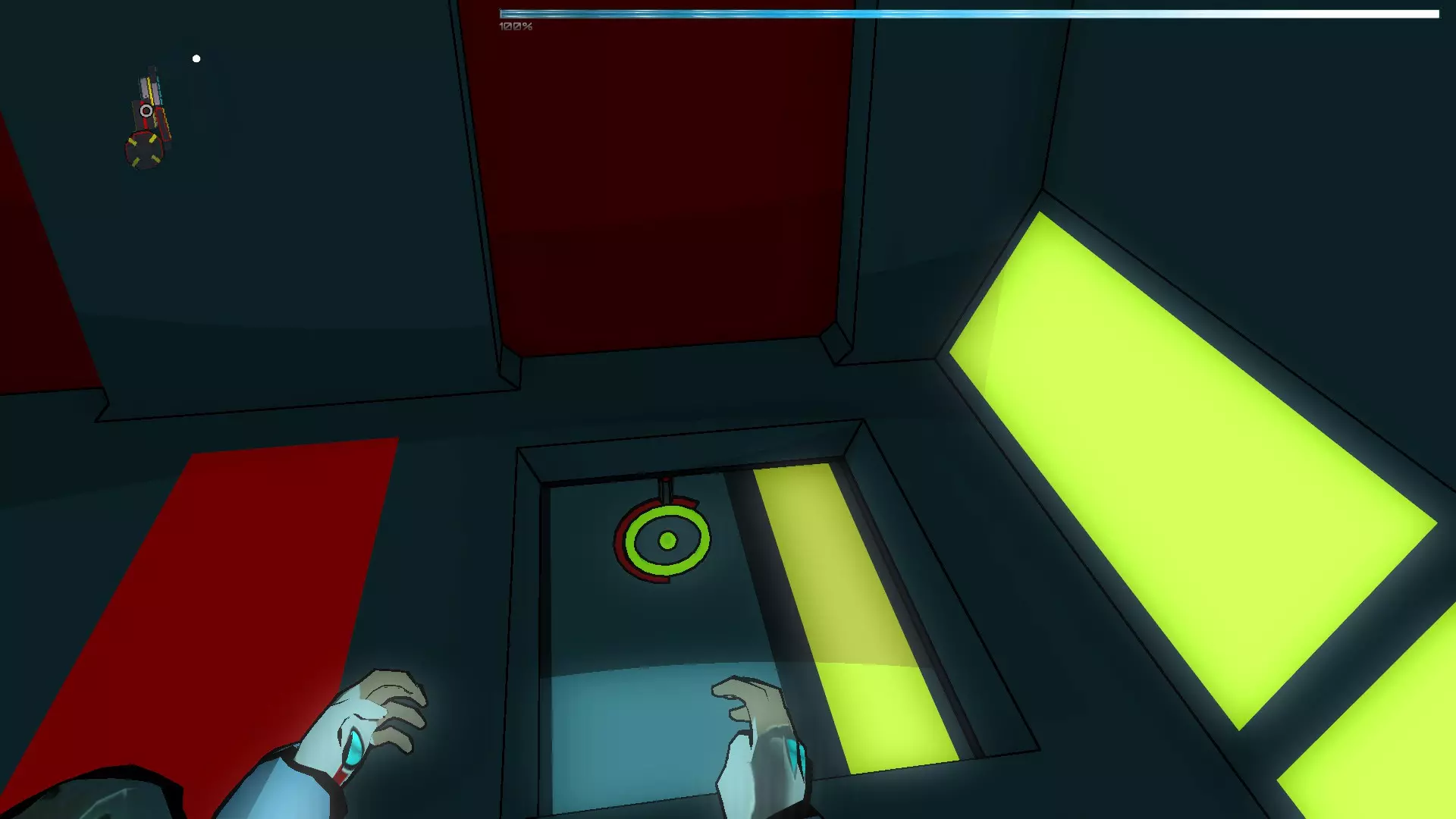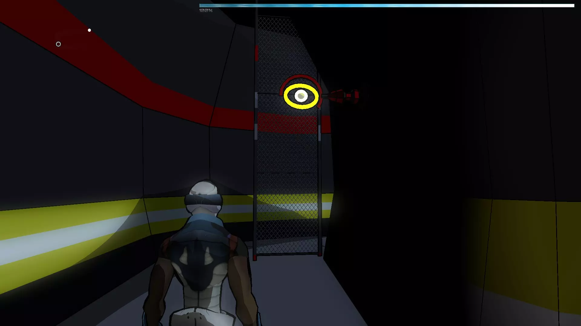 我们移动镜子,直到其中心与黄线重合,然后回到飞镖处,向入口面板射击,直到到达房间尽头。