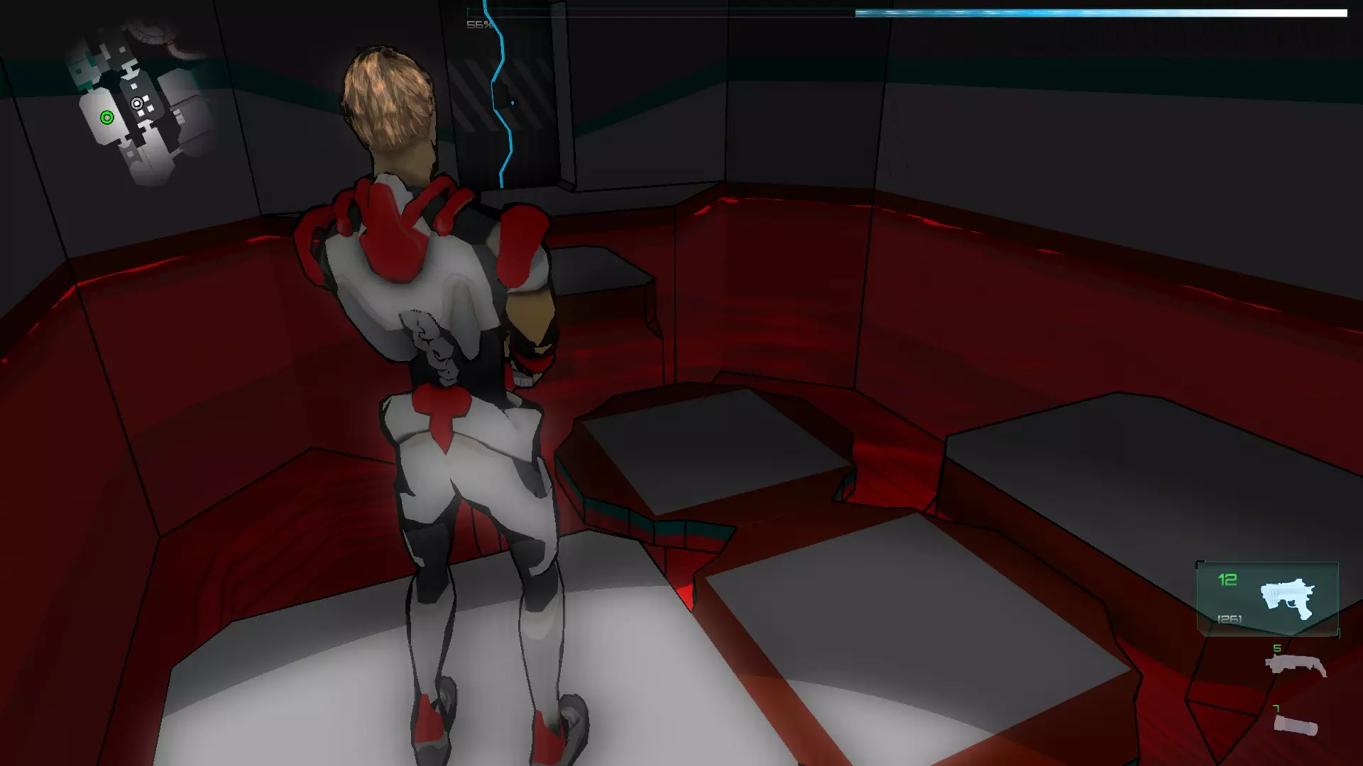 我们以最快的速度穿过受感染的水池,从另一边爬上去,然后切换到伊格尔形态,启动那个房间的激光终端,返回传送器大厅,从另一扇门进入,出来后必须改变远处激光的方向。