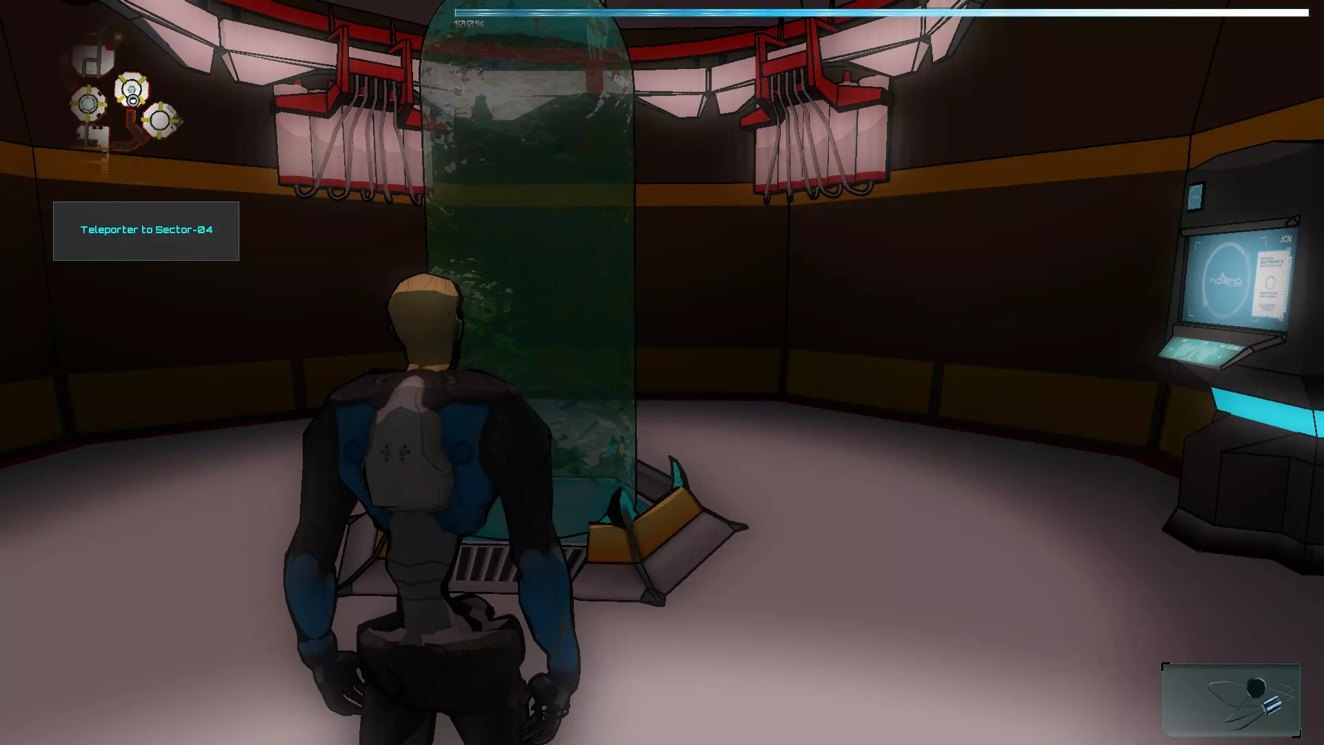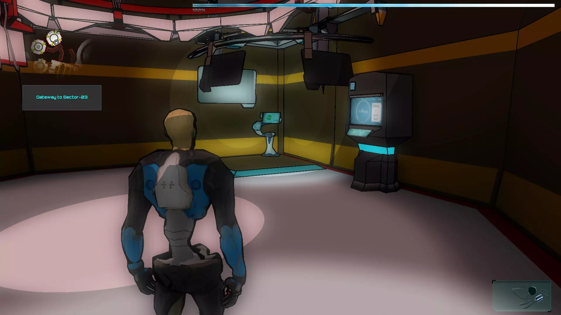 之后我们回到01区,用带闪电标志的蓝色面板激活门,然后让伊格尔进入,并激活03区SynB的远程终端。