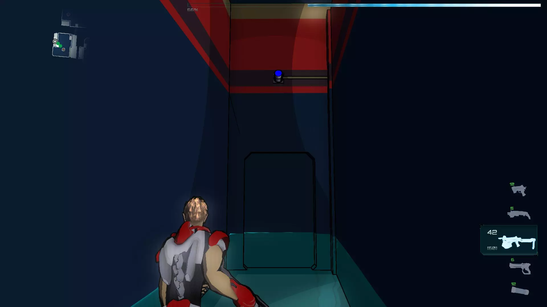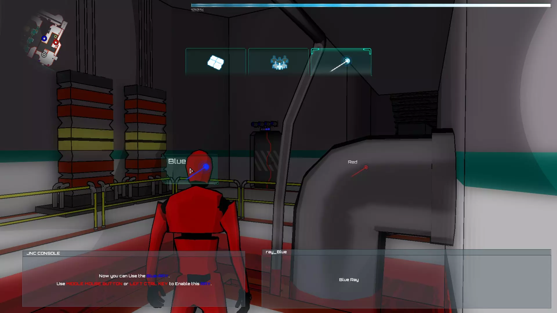 激活假人后切换到它,拿起激光激活器并进入蓝色光束中获取蓝色激光,我们身后有一扇带蓝色密码的门,使用物品栏将激光切换为蓝色,然后激活门。
