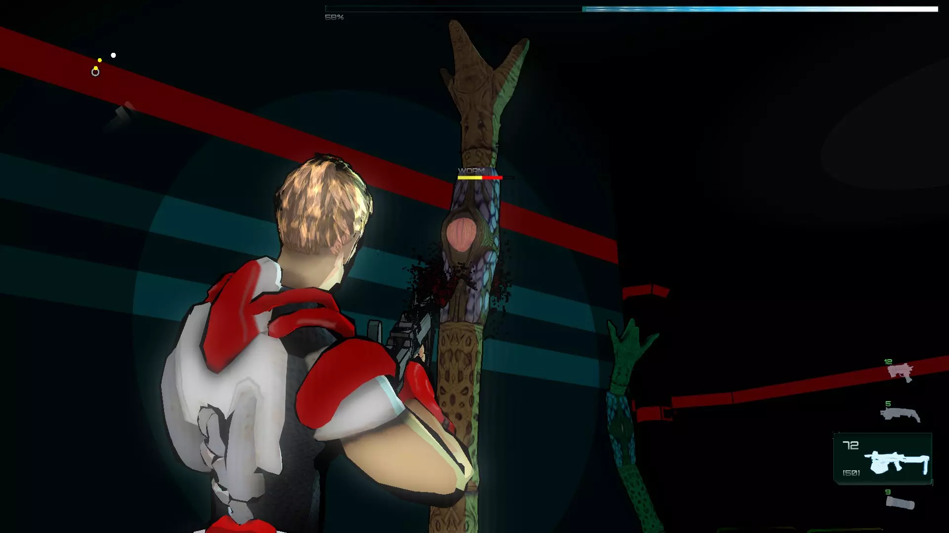 完成这一步后,我们解决掉剩余的敌人,然后在实验室里四处搜寻弹药,接着出去,有趣的部分就开始了。我们必须消灭一波特定数量的敌人,我的建议是把激光调成红色,因为蓝色激光瞄准起来有点困难,敌人如下:3只蠕虫,用机枪很容易就能消灭它们。