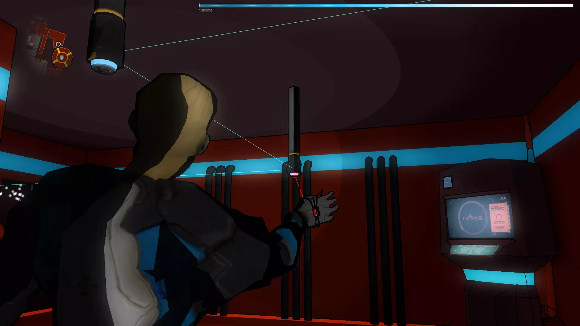 我们从面前的门出去并激活终端,看到天花板上启动了一些激光,我们需要用激光激活器发射激光来闭合电路,然后进入下一阶段。