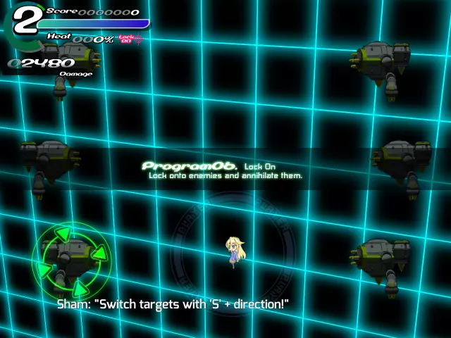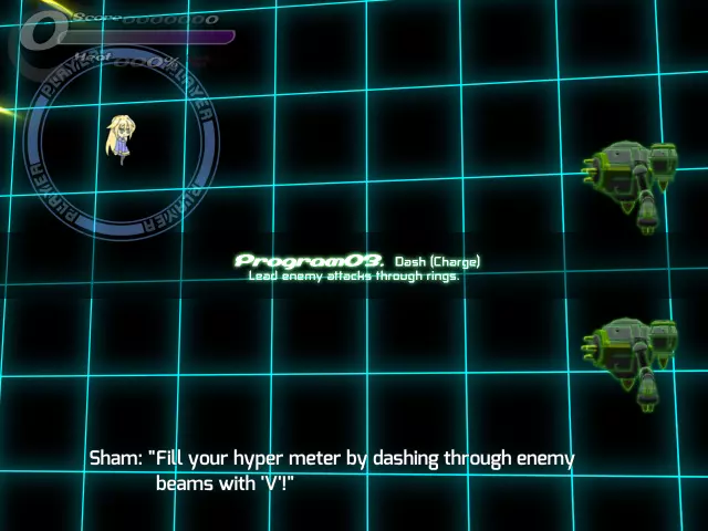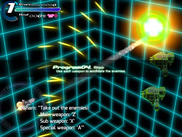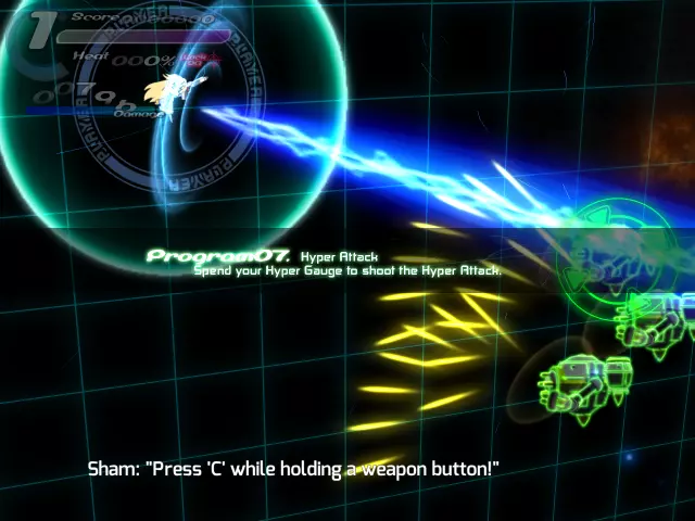 【程序03 冲刺(蓄力)】请引导敌人的攻击穿过圆环。 (通过冲刺躲避敌人的子弹,将左上角的超级能量条积攒到1格即可进入下一步。之前步骤中出现的绿色标记,就是能量条正在积攒的证明。) 【程序04 武器说明及攻击】 “既然你已经亲自尝试过了,相信你也意识到填充能量条花不了多长时间。” “生存的关键在于,在你陷入危险的瞬间使用超级攻击!” “我真希望能让你马上尝试,但现在还不是时候。”“我们稍后再进行操作,这样更方便。首先,让我们了解一下武器。” “基本上,武器可以分为三类:光束类、实弹类和特殊类。” “光束类攻击如果攻击力高于敌人的防御力,就能穿透敌人。” “例如,你可以用光束摧毁低防御的实弹,甚至对其后方的敌人造成伤害。” “如果遇到无法躲避的实弹,试着将其击落来开辟道路!” “实弹武器有防御值,当受到一定程度的伤害时就会被摧毁……” “但它们拥有一些光束武器所不具备的特性,比如造成大量伤害,或者追踪敌人。” “最后是特殊武器……”它们的特性差异很大,所以你可能需要查看每个武器的描述! …… 是的,我只是懒得解释。抱歉! 正如我刚才稍微提到的,你可以同时装备三种不同的武器。 分别有主武器按钮、副武器按钮和特殊武器按钮。 每个按钮对应你装备的其中一种武器。 你当前的装备是:主武器:光束步枪M(光束类型),副武器:火箭筒(实弹类型),特殊武器:剑(特殊类型)。 记住这一点:你不能将步枪或火箭筒设置到特殊武器按钮,因为该按钮是专门用于特殊武器的…… 同样,你也不能将剑设置到主武器或副武器按钮。“部分武器在冲刺或锁定敌人时会展现出不同的性能。试着找出这些差异吧!” “此外,一些特殊操作也会使特定武器触发不同效果。” “你可以在各武器的描述中找到详细说明。一定要仔细查看哦。” “好了!现在是攻击时间!” “我已经为你设置好了目标。选择任意武器,将它们击败吧!” “你尝试充能后应该就能明白,超级计量条其实很容易充能。” “遇到危险就立刻使用超级技能!这是生存下去的诀窍哦!”「那么接下来本想实际演示一下HYPER……」 「不过还是之后再进行比较方便,所以先来讲讲武器吧。」 「武器大致可以分为光束系、实弹系、特殊系三大类哦。」 「光束系武器的攻击力如果超过敌人的耐久值,就能贯穿该敌人。」 「比如说,可以一边破坏耐久值较低的实弹,一边对后面的敌人本体造成伤害。」 「对于无法通过闪避躲开的实弹,就破坏它们来开辟道路吧!」「实弹系武器有耐久值,受到一定程度以上的攻击就会损坏……」 「不过相应地,它们威力更高,还能追踪敌人,有着光束系武器没有的特点哦。」 「特殊系武器的话……不同武器的特点差异很大,建议你查看武器说明界面!」 「……」 「好啦,解释起来太麻烦了。抱歉啦。」 「对了,刚才简单提过,Sora可以同时携带3种武器。」 「分别是主武器(以下简称Main)、副武器(以下简称Sub)和特殊武器(以下简称SP)。」 「可以通过各个按钮来分别使用它们哦!」顺便说一下,目前的武装配置如下: 主武器:光束步枪M(光束系) 副武器:火箭筒(实弹系) 特殊武器:剑(特殊系) 要注意的是,特殊武器按钮是专门用于特殊武器的,所以不能在特殊武器栏装备步枪或火箭筒。 反过来,主武器栏和副武器栏也不能装备剑,这点要留意。 不同武器在冲刺中或锁定状态下性能会有所变化,建议多尝试各种情况! 另外,部分武器通过特殊操作也能改变性能。 这些内容在武器说明画面都有介绍,记得仔细阅读哦。 久等了! 终于到攻击时间了!“我已经准备好了,用你喜欢的武器尽情破坏吧!”