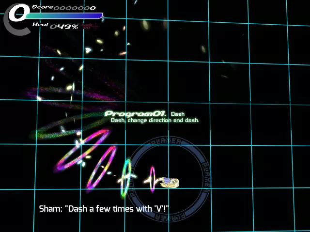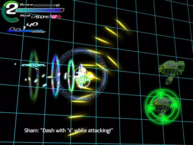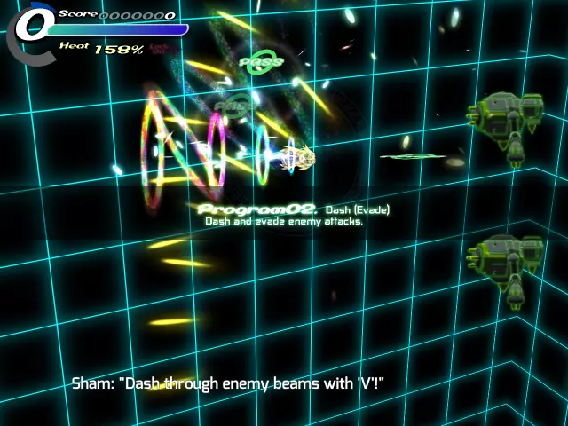 【程序01 冲刺】请重复进行冲刺→转向→冲刺的操作。 (进行一定次数的冲刺后即可进入下一步) 【程序02 冲刺(回避)】 好的!干得不错! 对了,你有没有注意到冲刺时百分比计量条在填充? 那是你的热量值。 当你频繁冲刺、急转弯或使用特定武器时,它就会填充。 计量条的值越高,你受到敌人攻击的伤害就越大。 好了。 那么,既然你已经体验过这个速度了,你可能会想“我控制不了这个速度!”或者“这么快的速度怎么躲避攻击啊!?”,对吧? 嗯…… 哦?对你来说没那么难吗?“好吧,先不说那个了。” “冲刺操作起来可能有点难,但在躲避方面确实非常实用。” “如果你了解冲刺最突出的特性,就会明白我的意思了。” “这正是冲刺如此好用的原因!” “即使你的视野完全被弹幕覆盖,你也能毫发无伤地闯过去!” “但是冲刺不能让你穿过实弹,比如导弹。要小心那些!” “而且就像我之前说的,冲刺会增加热量值。” “当你在冲刺时接触到能量攻击,虽然不会受到伤害,但热量值会大幅上升。” “如果你在冲刺穿过光束后被击中,会受到很重的伤害!还是老样子。” “战场上一步错,就可能丧命。”“这件事非常重要,所以你一定要勤加练习,明白吗?” “明白。” “好,那我们开始吧!” “试着用冲刺穿过能量攻击,用普通移动或冲刺躲避导弹。” “好!你做得相当不错嘛!” “话说回来,你有没有注意到冲刺时,屏幕左上角量表下方的百分比在增加?” “那个叫做热量值。” “持续冲刺、紧急转向,还有使用部分武器时,这个值就会上升。” “这个数值越大,受到攻击时受到的伤害值就越高,所以要小心哦。” “好的。” “不过实际操作起来,这种速度根本控制不了啊!”“你是不是觉得‘这么快的攻击速度根本躲不开嘛!’之类的?” “呃……” “啊?难道不是吗?” “嘛,先不说这个。” “虽然冲刺操作起来有点别扭,但其实在躲避攻击时非常有用哦。” “要说为什么,这就是冲刺最大的特点!” “它可以穿透敌人的光束类攻击!” “就是因为这个啦!” “即使是布满整个视野的光束弹幕,只要持续冲刺,就能毫发无伤地通过哦!” “不过,像导弹那样的实弹类攻击,就算冲刺也无法穿透,所以要小心。”“还有,刚才也说过了,冲刺的时候热量值会持续上升。” “冲刺时接触到光束类攻击,虽然不会受到伤害,但热量值会一下子上升很多哦。” “用冲刺躲开了光束是不错,但结果直接撞上导弹受到重创,这种情况很常见。” “战场上,一瞬间的疏忽就可能致命。” “这方面真的很重要,一定要好好练习。” “好的。” “那么,实际来试试吧!” 试着用冲刺穿过光束类攻击,导弹来了的话,要通过冲刺或普通移动来避开,别被击中哦。