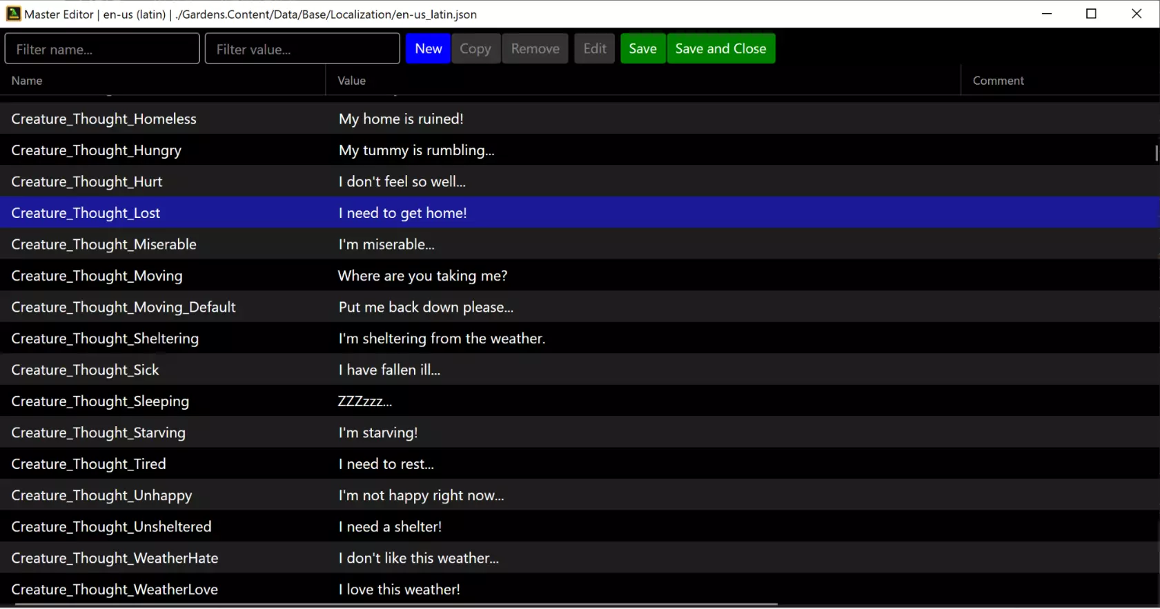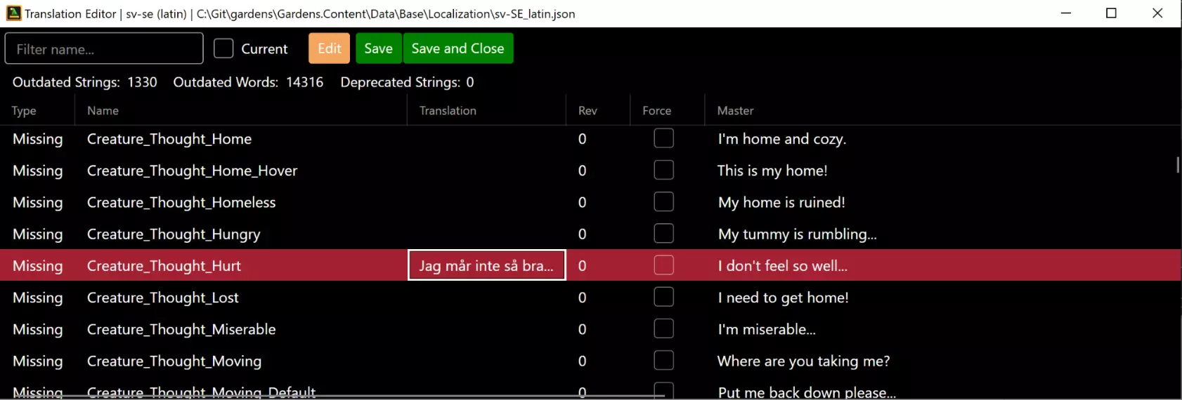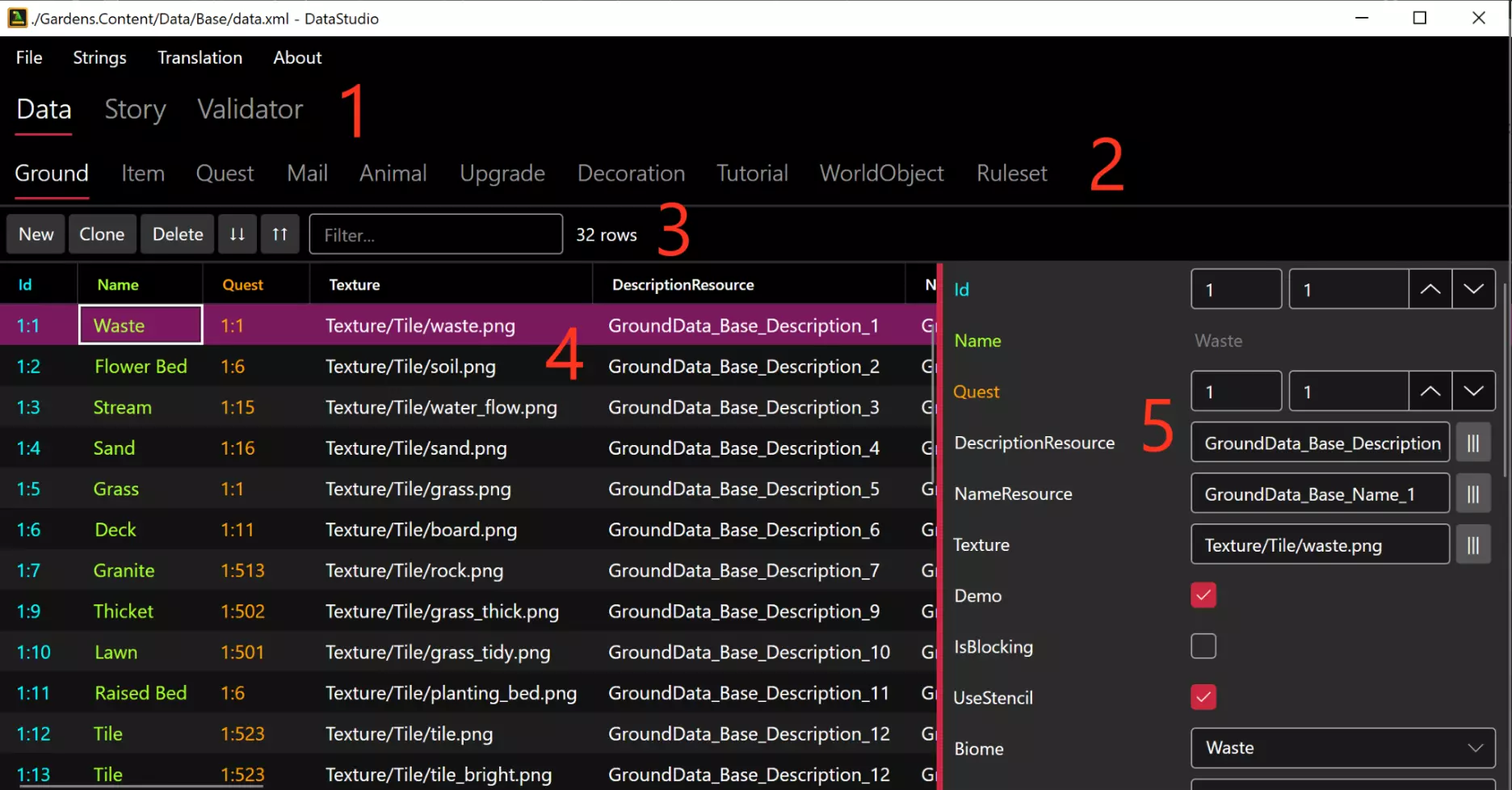 1. 功能选择:数据部分用于查看和修改条目。故事和验证器在单独的部分中介绍。 2. 数据类型:选择你想要更改的数据类型。 3. 条目操作:添加新条目;复制所选条目;删除所选条目;向上/向下移动所选ID(同时移动所有冲突条目);按包含指定字符串的列筛选视图。 4. 条目行:这些是所选数据类型的条目。点击其中一个可将其选中进行编辑,不过某些属性可直接在行中修改。 5. 条目详情:显示所选条目的所有属性,包括可编辑和不可编辑的。这是你对游戏进行主要调整的地方。由于每种类型都具有许多独特属性,因此这里不会涵盖个体值。不过,你会注意到一些常见的属性: ● 条目的唯一ID以蓝色显示在顶部,允许你分别修改模块和编号。记住,添加内容时应使用模块0(参见数据条目部分)。 ● 名称以绿色显示。它们不可编辑,但会显示其将具有的字符串值。实际的键/名称在特定的字符串资源属性中指定。某些条目对于描述或其他文本也有类似的机制。 注意:你必须从“字符串”菜单加载字符串文件,才能显示实际值(参见字符串编辑)。● 其他条目的引用(无论类型是否相同)均以橙色标注,其输入方式与唯一ID相同。若被引用条目的ID发生变化且位于同一数据文件中,此值将自动更新。 故事标签:这是一个用于可视化任务及其关联路径的工具。每个方框都可悬停查看详情,也可选中以显示前后关联的任务。 验证器标签:此工具用于检查条目引用是否正确,例如确保所有信件都已关联到任务。运行该工具可提示可能存在的问题,但部分合理情况(如外部模块)可忽略。目前对模组的支持效果欠佳。在【字符串】选项卡中,你可以加载主字符串文件以及该主文件的任何翻译文件。主编辑器适用于为你的模组创建新字符串,而翻译功能则适用于创建新的翻译内容。