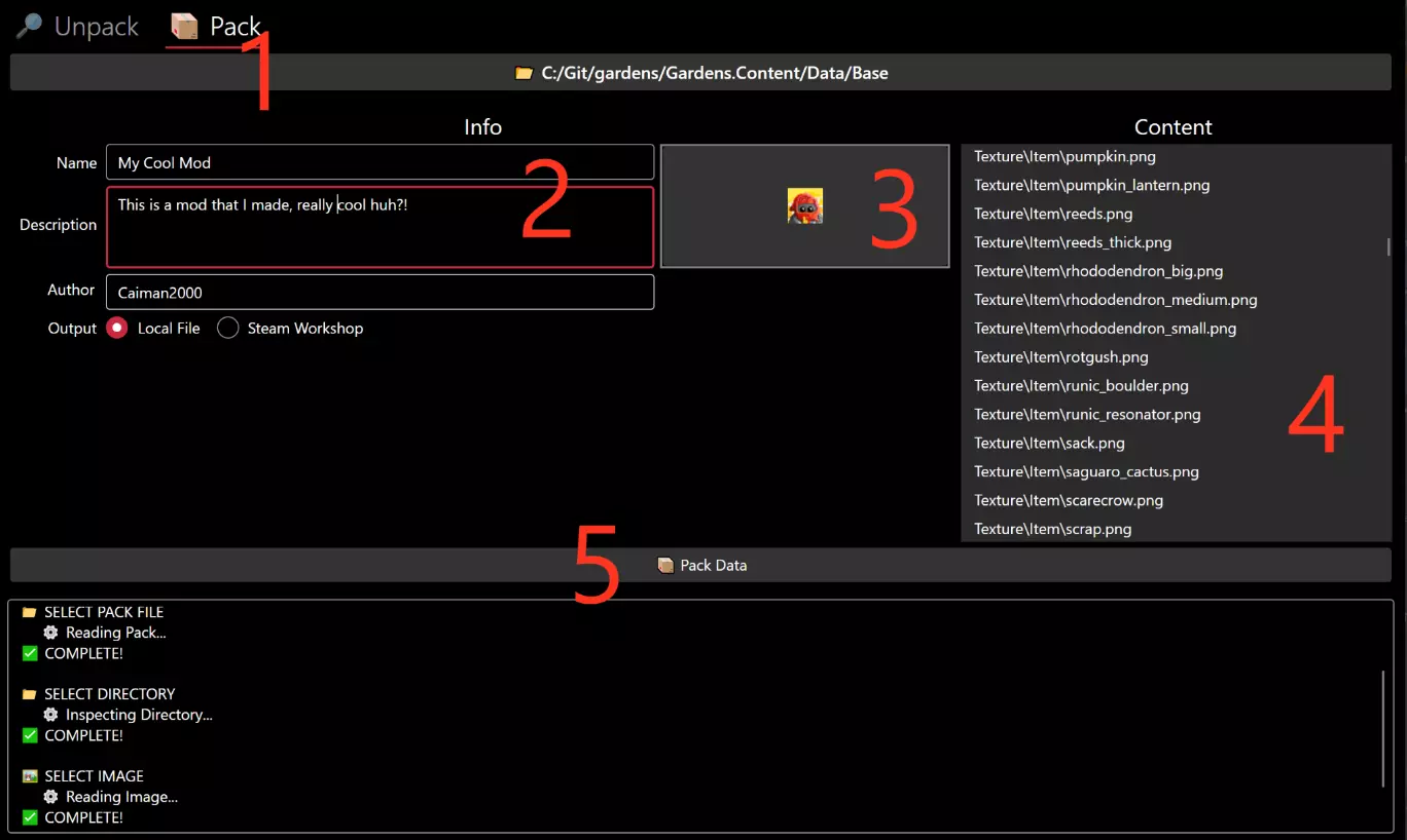 1. 压缩包文件选择器。点击此按钮可选择要打开的压缩包文件。打开后,该按钮会显示文件路径,但仍可点击以选择新文件。 2. 压缩包信息。显示压缩包的元数据,包括任何包含的图像。 3. 压缩包内容。列出压缩包中包含的所有文件。 4. 解压缩。点击此按钮可将文件解压缩到目录结构中。 打包功能:您可能已经猜到了:此视图将指定目录打包成压缩包文件,可供作为模组使用。