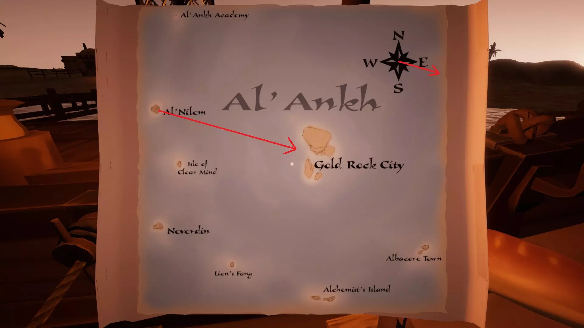 阿尔安克是一串沙漠群岛,由8座岛屿和6处定居点组成。对于我们这些刚接触航海、对海上导航一无所知的新手来说,幸运的是,中心岛屿非常大,从其他任何岛屿都能轻松看到(即使在夜晚也能看到!) 前方有剧透内容,如果你想首次亲自探索这些岛屿,请谨慎阅读! 内弗丁