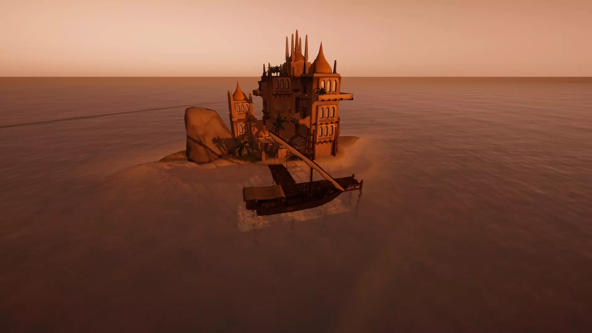 哦,没错,就是首都,那座大城市。如果你航行到那座巨大岛屿的中央,就能在岛的内侧找到一个港口。要小心浅水区的标记,否则你会搁浅。这座岛上有一座城堡和许多城墙。这里有各种各样很棒的商店,几乎什么都卖(除了灵药和蛇油)。有家具、烤架、渔具、各种食物、各种饮料,还有地图和导航工具。岛的一侧甚至还有一家商店,你可能得稍微找一找,那里出售非常昂贵的画作。此外,这里也是你可以购买更大船只的岛屿。有机会一定要去看看,它可能会激励你在游戏中投入更多时间,最终买下它。最后,金岩城是你可以雇佣大部分国际联系人的地方。关于浅滩的重要提示
