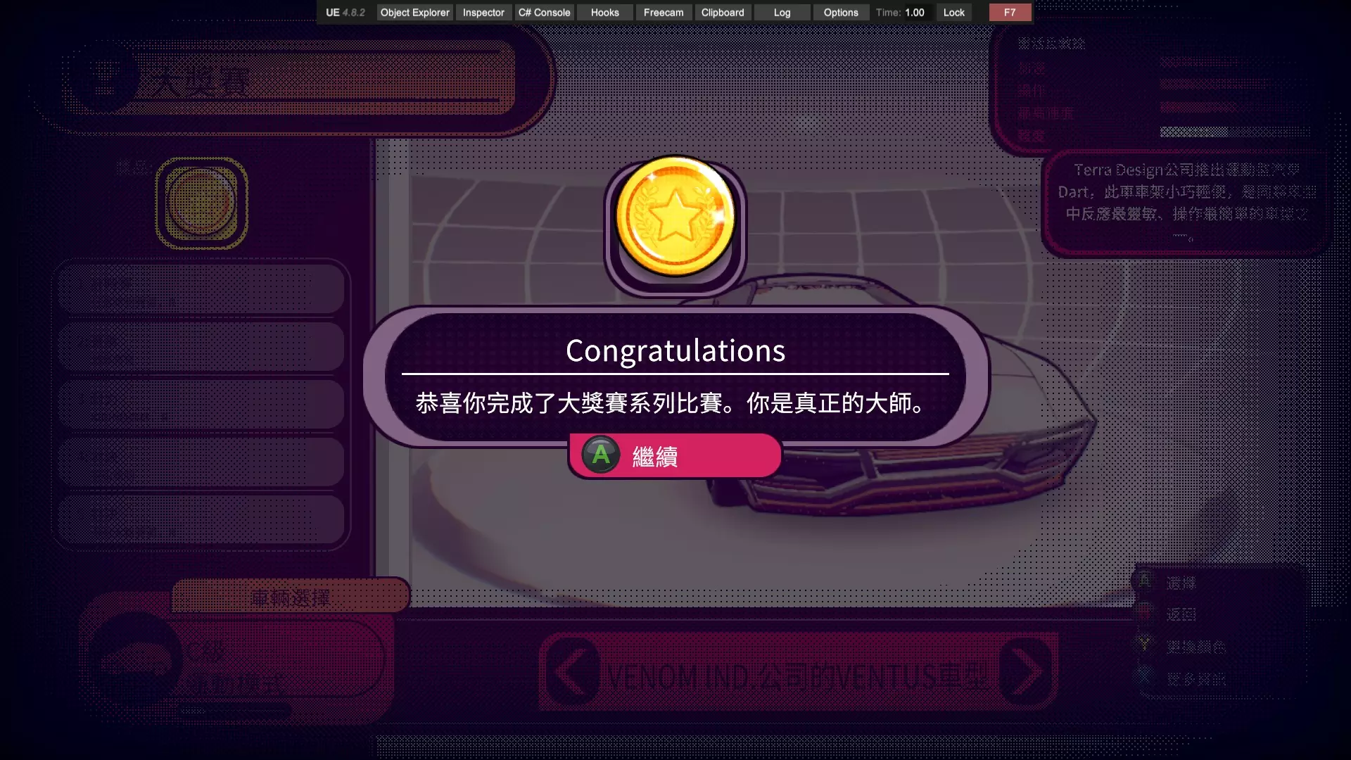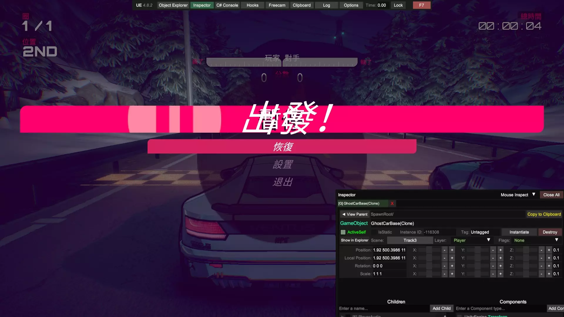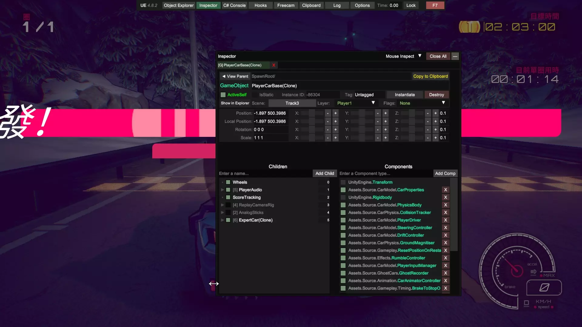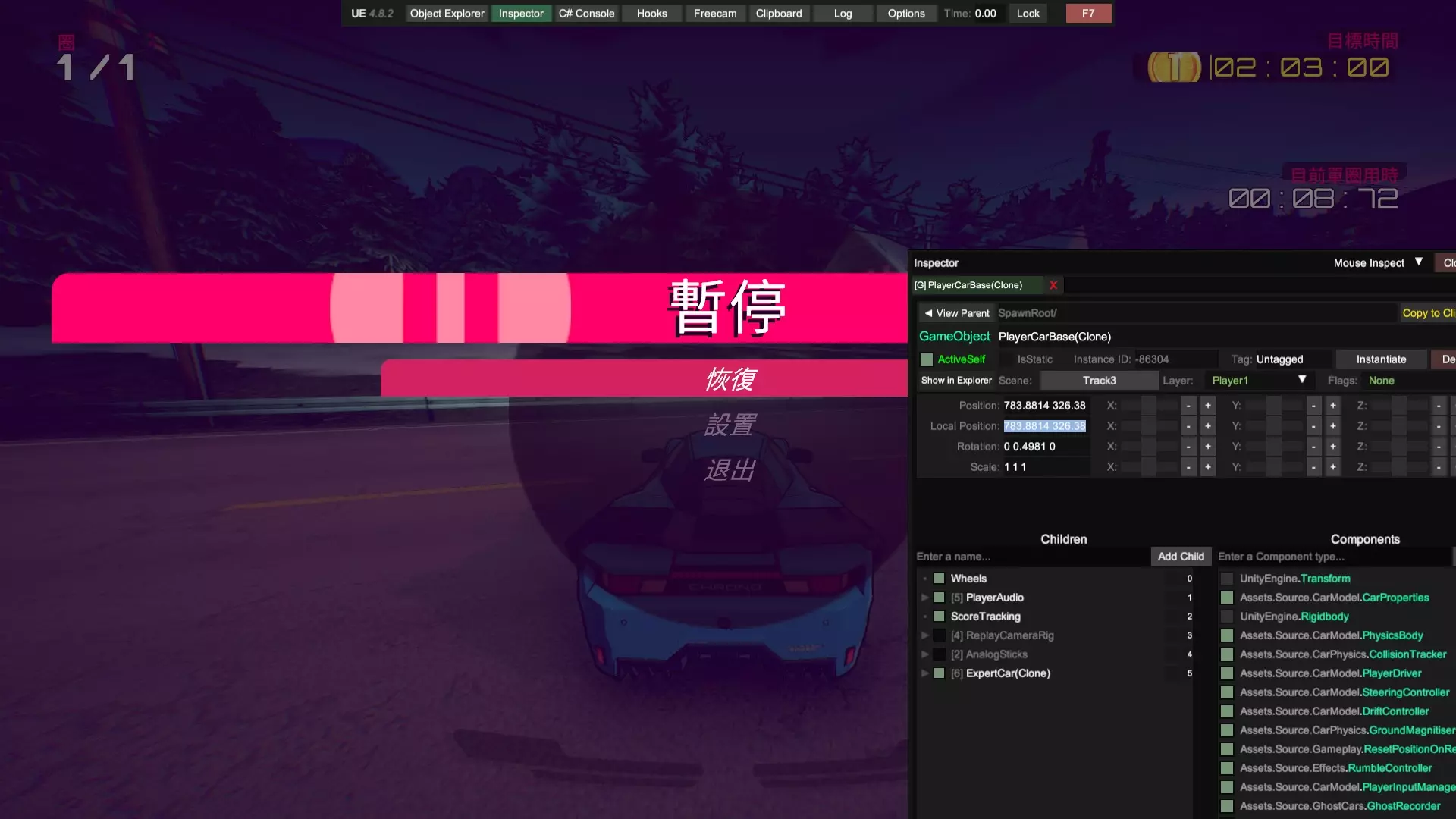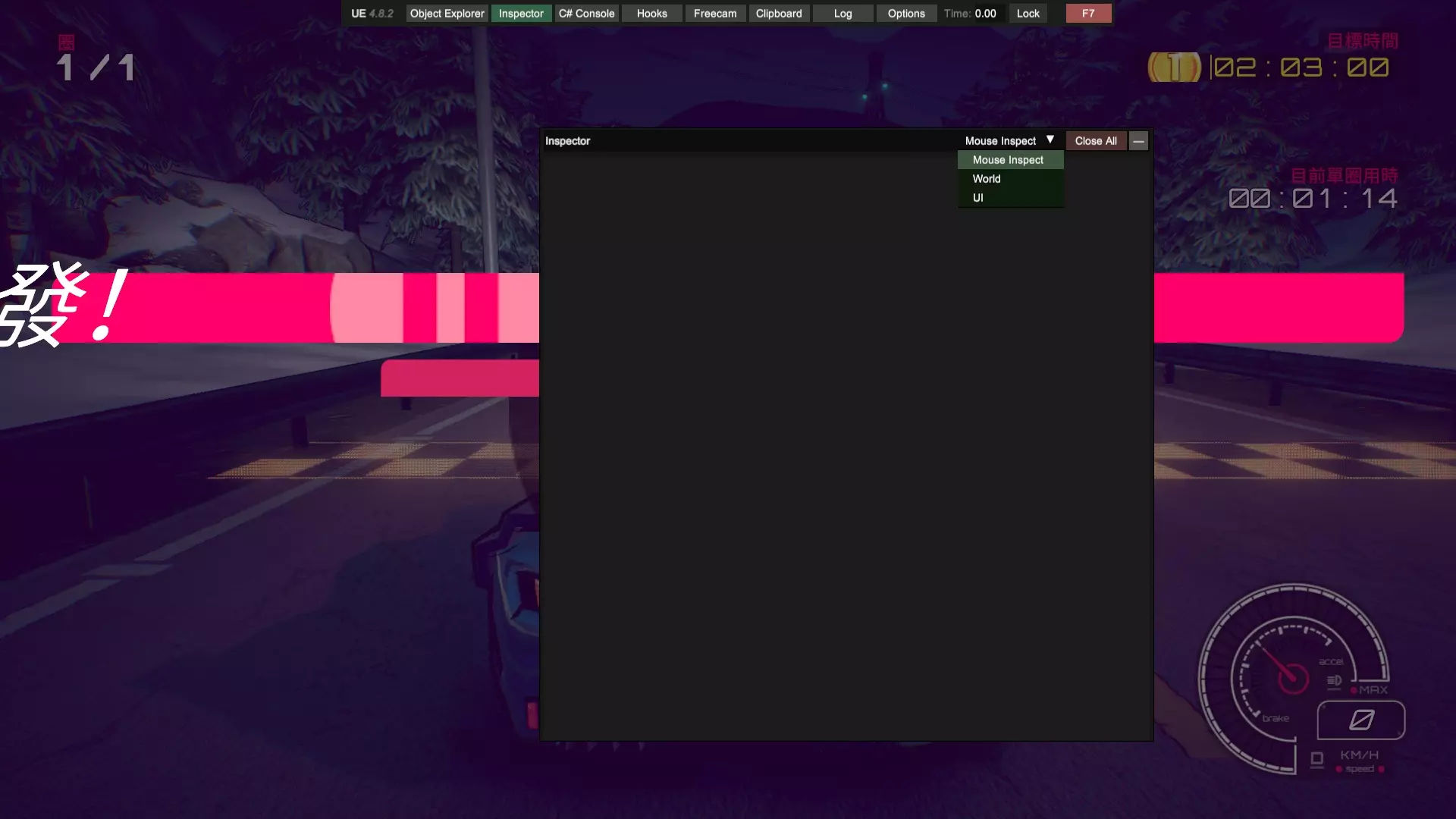 通过本指南,你将学会如何用Unity Explorer软件对本游戏进行改善,使你可以更容易地完成游戏中的一些困难要求,包括但不限于:Viv的计时赛,全游戏本体(不含DLC)车辆的大奖赛。 !!!警告!!!本指南禁止用于所有联机用途!!! !!!警告!!!本指南禁止用于所有联机用途!!! !!!警告!!!本指南禁止用于所有联机用途!!! 前言 需要你操作的部分我会特别标注以示重点,比如这样,其余部分为解释说明,直奔重点的可以直接下拉找相关说明。相信很多玩家在通过剧情模式时对前两台车的操纵性比较满意,但到了第三台车体验感急转直下,这台操纵性酷似中里毅的车给普通玩家造成了困扰,不过还在接受范围以内。毕竟只要能在非对决模式混个铜牌,对决时哪怕跑得再慢,完成后也能拿到第二,推完剧情没什么难度。真正阻碍玩家的是第四台车,客观来说这台车的操纵性比第三台好,能在高速行驶时实现大角度漂移过弯,缺点是加速慢,因此需要玩家竭尽所能减少碰撞。薇芙的剧情和前三个不同,她没有XC(困难)模式,同时她的计时赛只要求金牌,正是这个要求让玩家痛苦不已。这个游戏缺点包括没有实时小地图,你不知道你现在在跑道的哪个位置;同时各种车辆操纵性能天差地别,就算是同一个弯道一台车可能蹭一下就过去了,另一台车需要提前降速刹车准备漂移,所以需要大量的背板。在我看来凡是需要过度背板的游戏都失去了娱乐的本质,这使得游戏枯燥乏味。因此,在我自己看了一些相关资料后,决定给你们介绍一种基于UnityExplorer的通关方法。 软件的准备:BepInEx,UnityExplorer 在一切开始之前,你需要适应性改造你的游戏,先得下载两个东西:BepInEx,UnityExplorer,你可以在相关平台上或者你想的到的其他渠道找到这两样东西。记住,这两个软件的版本号要相符,就这个游戏目前版本来说,bepinex5.4.23.2和unityexplorer4.8.2拟合的不错,也是我目前用的版本。在你下载好后,先把bepinex中的文件(通常包含一个文件夹bepinex和包括winhttp、doorstop在内几个文件)除了changelog外放到游戏根目录,游戏根目录的位置你在Steam中点击属性文件所在位置应该就能看到。接着,启动一次【惯性漂移】(可以跳过开场动画),等待游戏主菜单页面完整显示后退出,此时你的bepinex文件夹中会生成一些文件。把你下载好的unityexplorer文件夹(通常包含几个dll和其他文件)直接放到plugins文件夹中。注意,你要把整个文件夹放进去而不是那些零碎的文件。此时,再打开游戏,你的页面应该类似于这样: