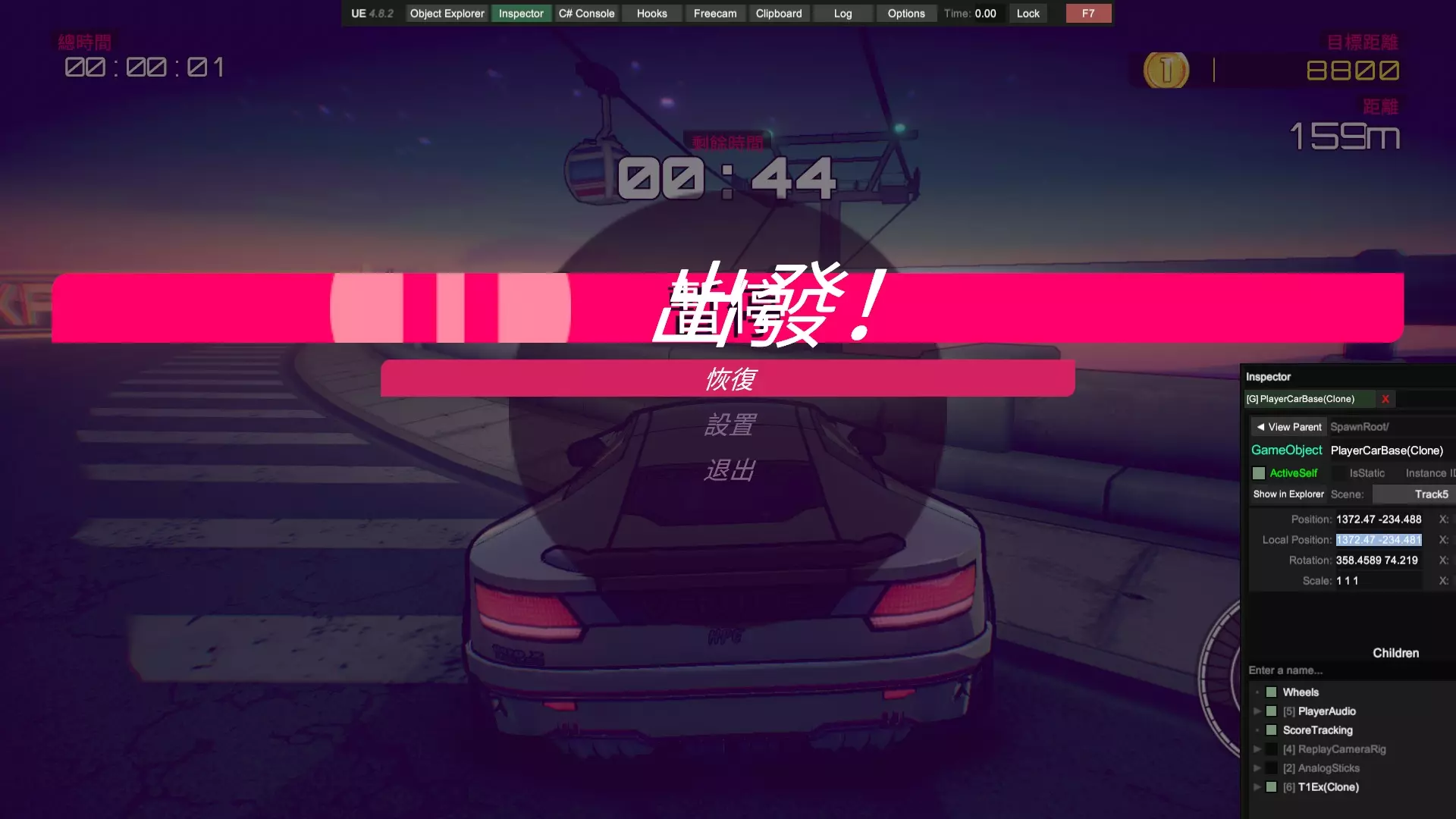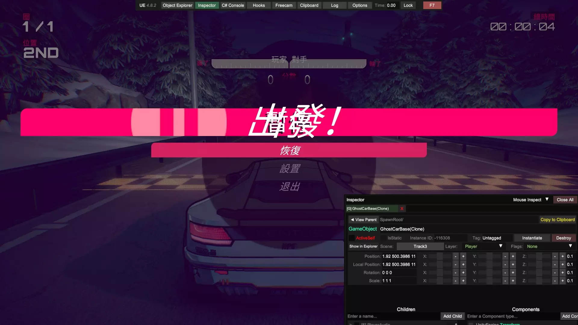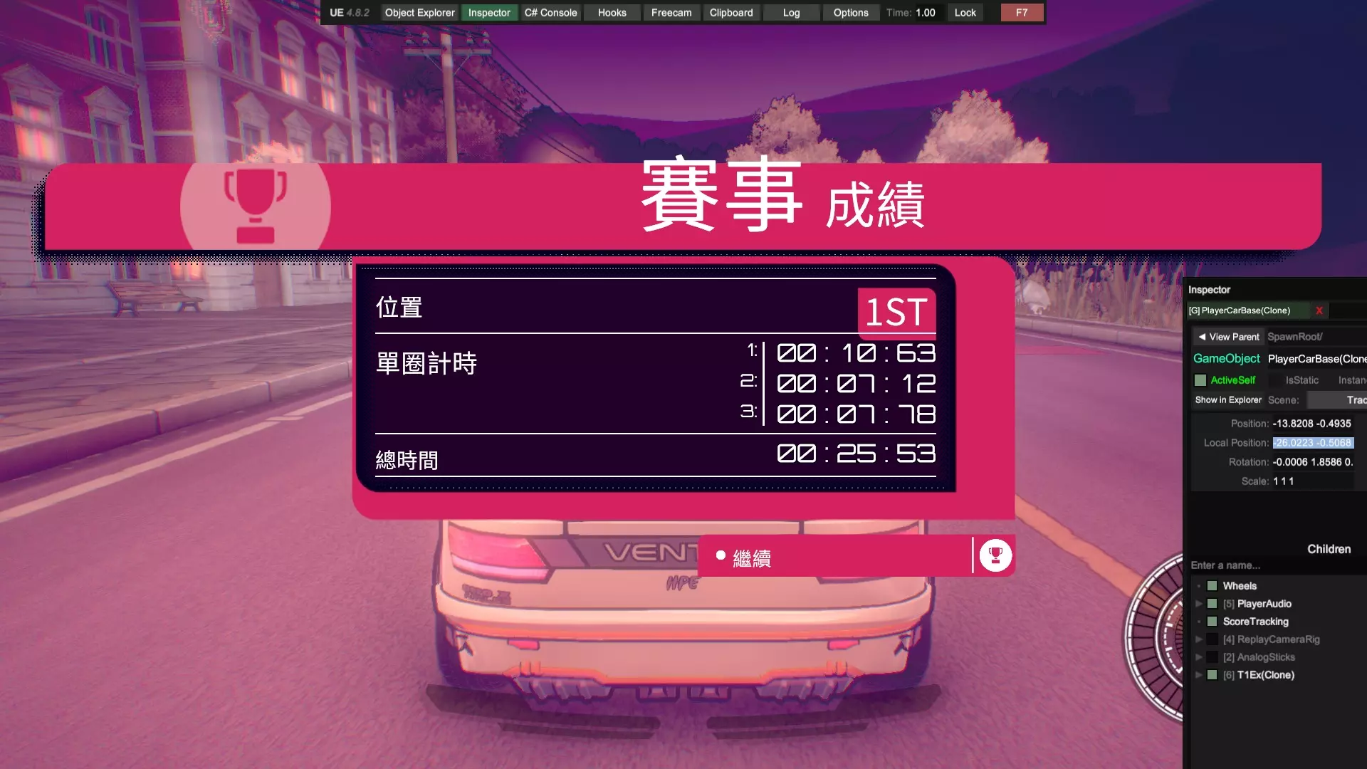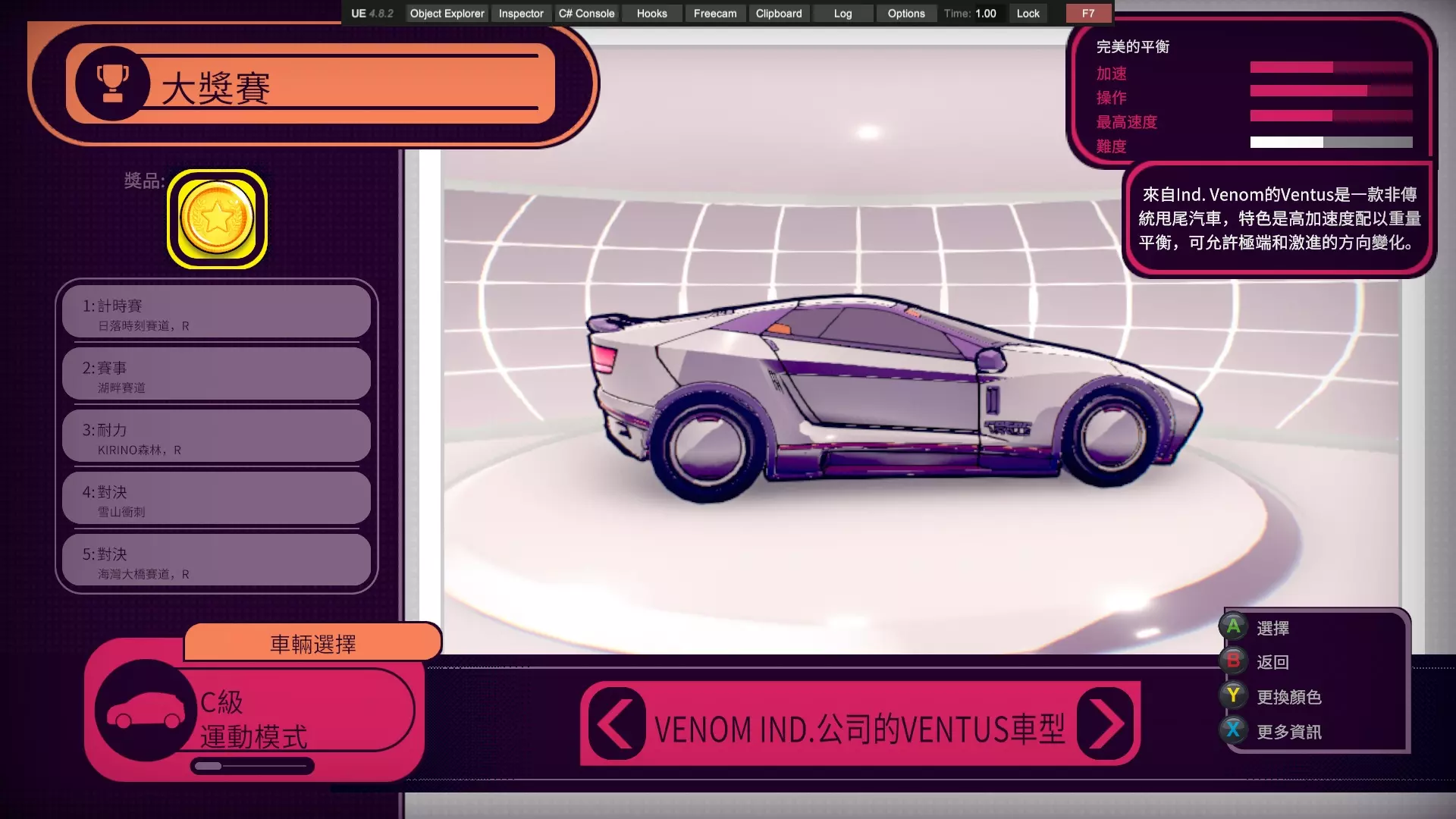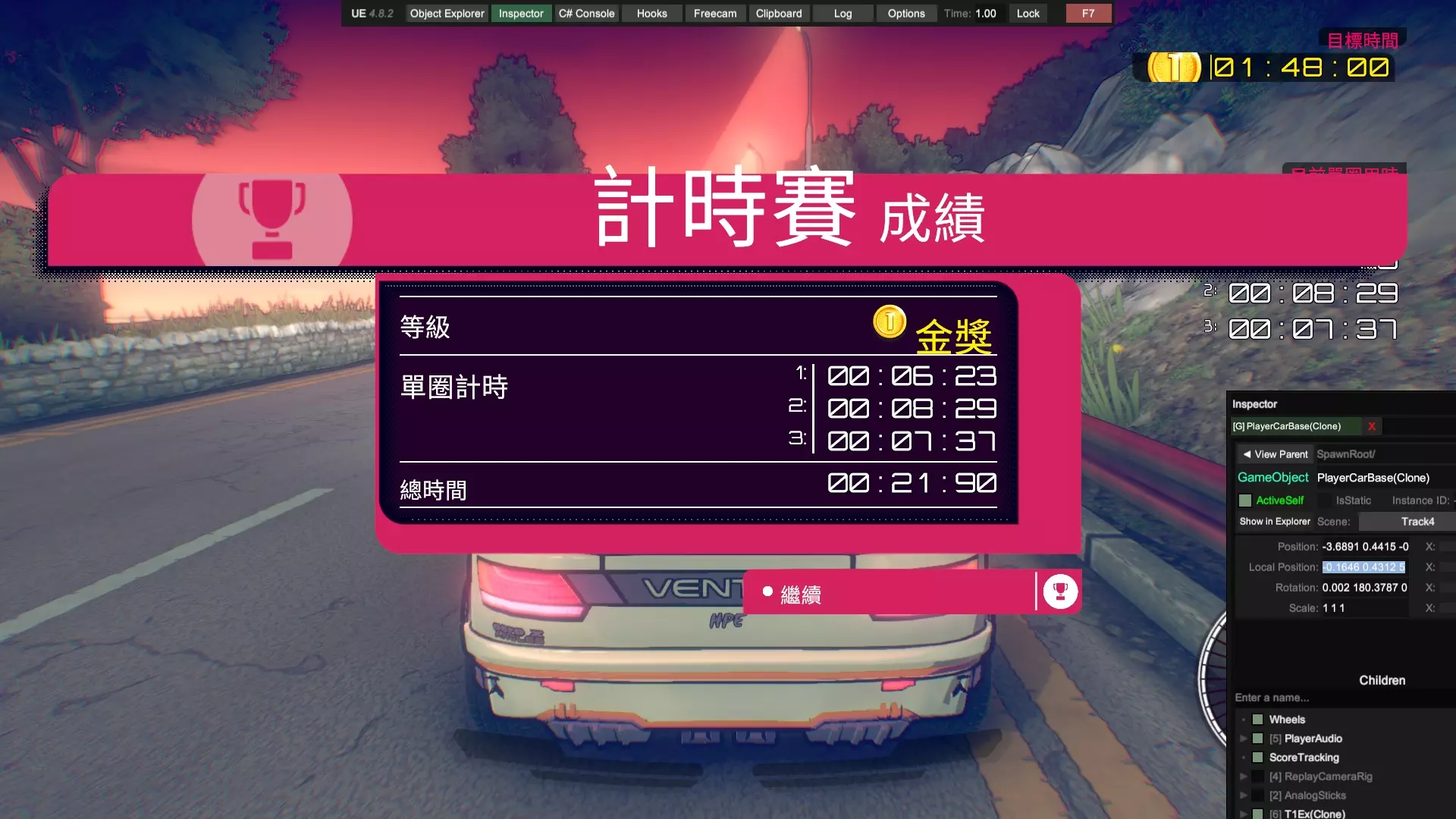 通过本指南,你将学会如何用Unity Explorer软件对本游戏进行改善,使你可以更容易地完成游戏中的一些困难要求,包括但不限于:Viv的计时赛,全游戏本体(不含DLC)车辆的大奖赛。 !!!警告!!!本指南禁止用于所有联机用途!!! !!!警告!!!本指南禁止用于所有联机用途!!! !!!警告!!!本指南禁止用于所有联机用途!!! 前言 需要你操作的部分我会特别标注以示重点,比如这样,其余部分为解释说明,直奔重点的可以直接下拉找相关说明。相信很多玩家在通过剧情模式时对前两台车的操纵性比较满意,但到了第三台车体验感急转直下,这台操纵性酷似中里毅的车给普通玩家造成了困扰,不过还在接受范围以内。毕竟只要能在非对决模式混个铜牌,对决时哪怕跑得再慢,完成后也能拿到第二,推完剧情没什么难度。真正阻碍玩家的是第四台车,客观来说这台车的操纵性比第三台好,能在高速行驶时实现大角度漂移过弯,缺点是加速慢,因此需要玩家竭尽所能减少碰撞。薇芙的剧情和前三个不同,她没有XC(困难)模式,同时她的计时赛只要求金牌,正是这个要求让玩家痛苦不已。这个游戏缺点包括没有实时小地图,你不知道你现在在跑道的哪个位置;同时各种车辆操纵性能天差地别,就算是同一个弯道一台车可能蹭一下就过去了,另一台车需要提前降速刹车准备漂移,所以需要大量的背板。在我看来凡是需要过度背板的游戏都失去了娱乐的本质,这使得游戏枯燥乏味。因此,在我自己看了一些相关资料后,决定给你们介绍一种基于UnityExplorer的通关方法。 软件的准备:BepInEx,UnityExplorer 在一切开始之前,你需要适应性改造你的游戏,先得下载两个东西:BepInEx,UnityExplorer,你可以在相关平台上或者你想的到的其他渠道找到这两样东西。记住,这两个软件的版本号要相符,就这个游戏目前版本来说,bepinex5.4.23.2和unityexplorer4.8.2拟合的不错,也是我目前用的版本。在你下载好后,先把bepinex中的文件(通常包含一个文件夹bepinex和包括winhttp、doorstop在内几个文件)除了changelog外放到游戏根目录,游戏根目录的位置你在Steam中点击属性文件所在位置应该就能看到。接着,启动一次【惯性漂移】(可以跳过开场动画),等待游戏主菜单页面完整显示后退出,此时你的bepinex文件夹中会生成一些文件。把你下载好的unityexplorer文件夹(通常包含几个dll和其他文件)直接放到plugins文件夹中。注意,你要把整个文件夹放进去而不是那些零碎的文件。此时,再打开游戏,你的页面应该类似于这样: