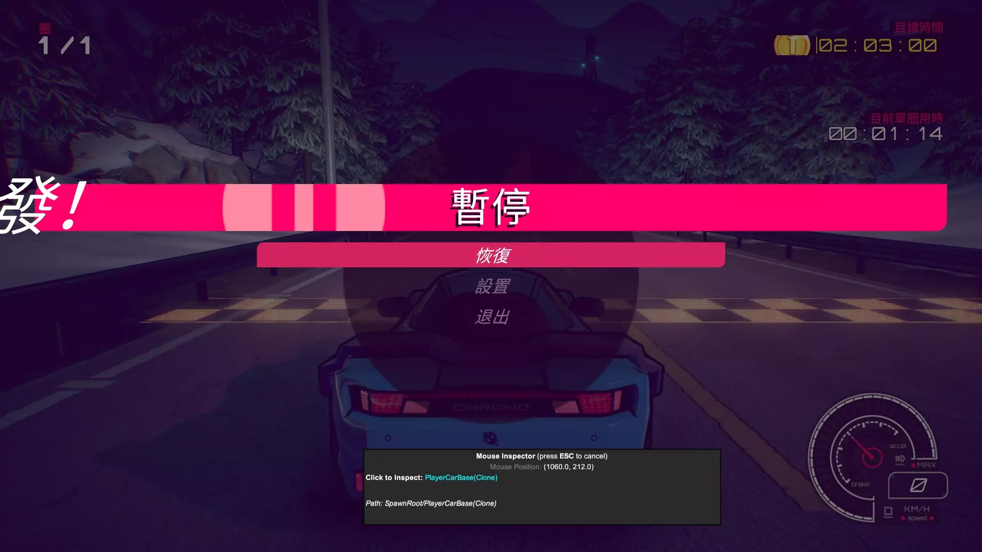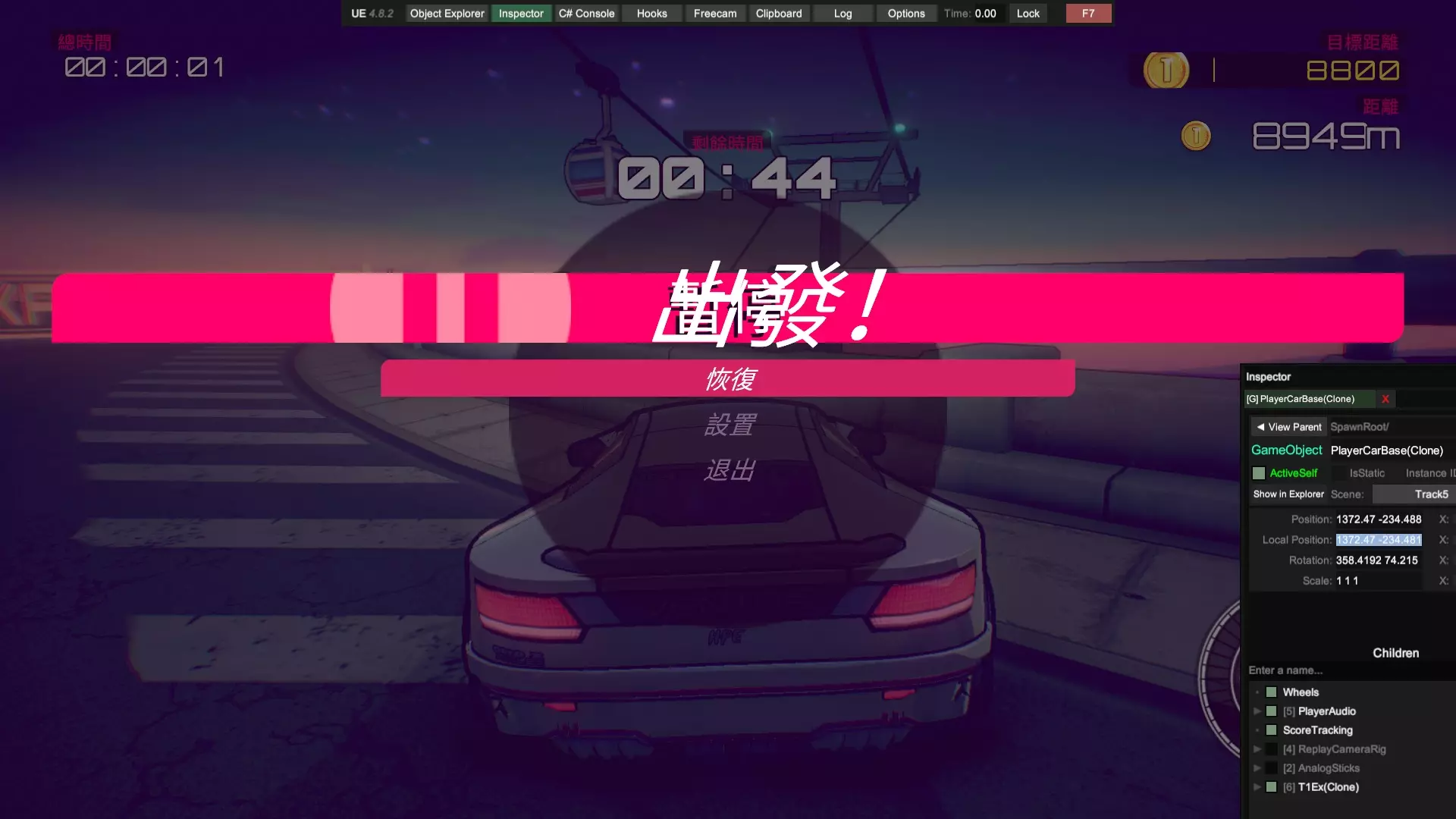 包含了大奖赛所有赛事类型,我们以此为例说明,首先是计时赛,按照我们之前的方式,开一小段后调出检查器点击车子输入终点坐标