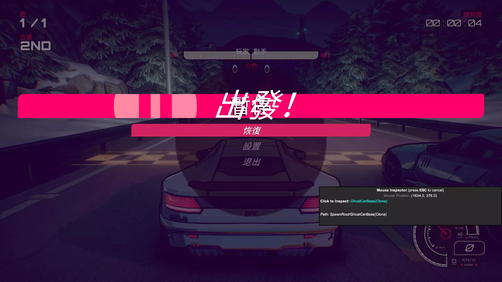 现在你可以恢复游戏玩会手机等待任务完成了。第四关雪山对决,对决这个比赛类型比较特殊,你需要领先对手足够距离时间获胜,用前述瞬移操作也可以完成,但是现在我给你一个更简单的方法。开局时先暂停,把【检查器】移动到敌人的车辆上去,像这样,注意注释:ghostcarbase