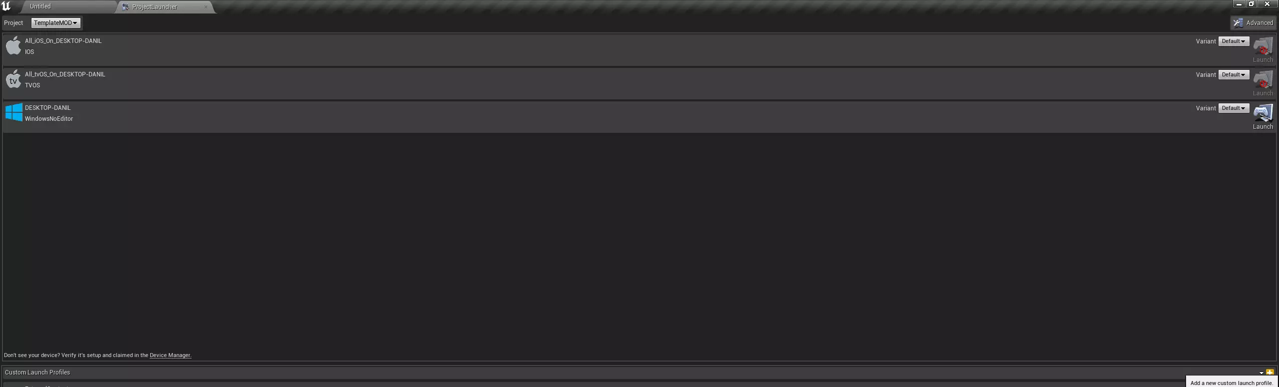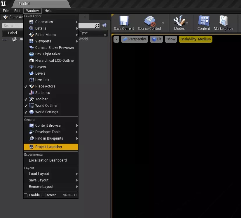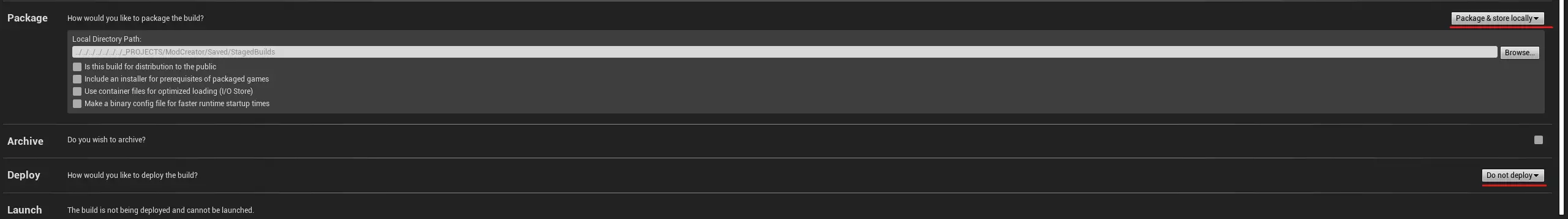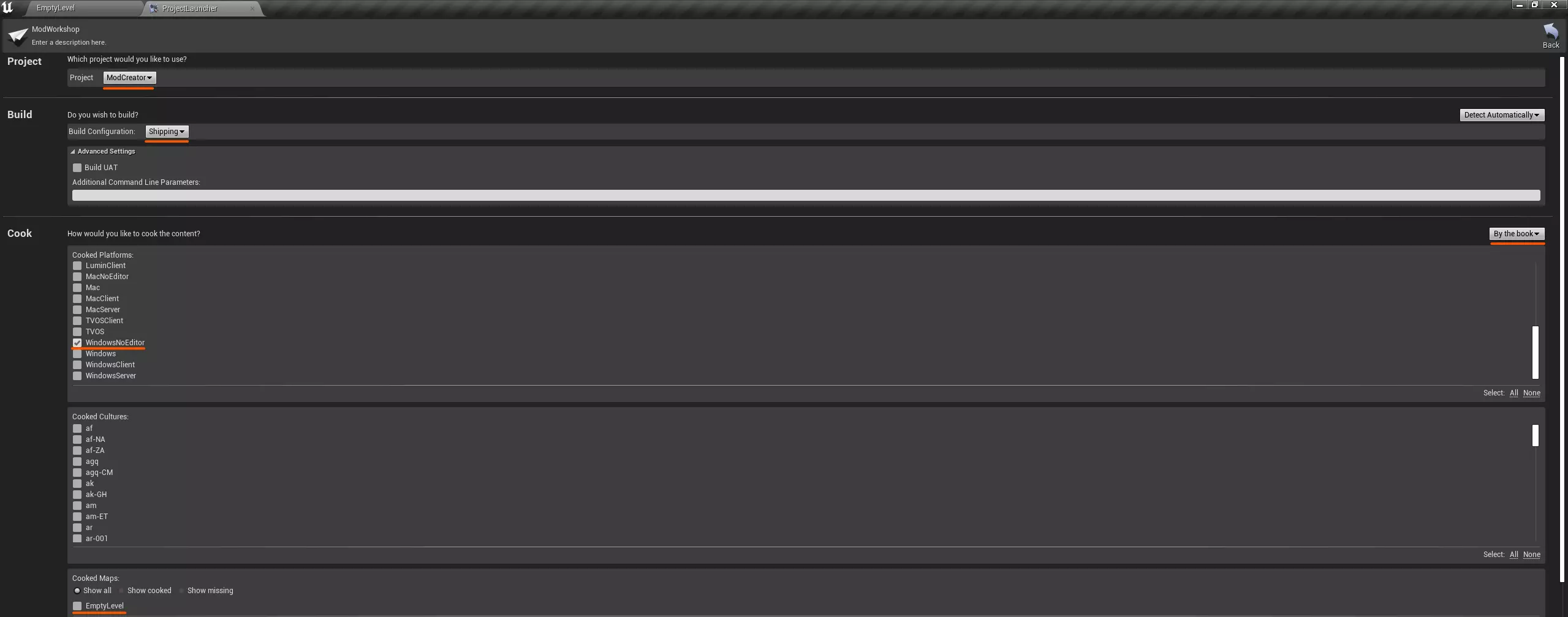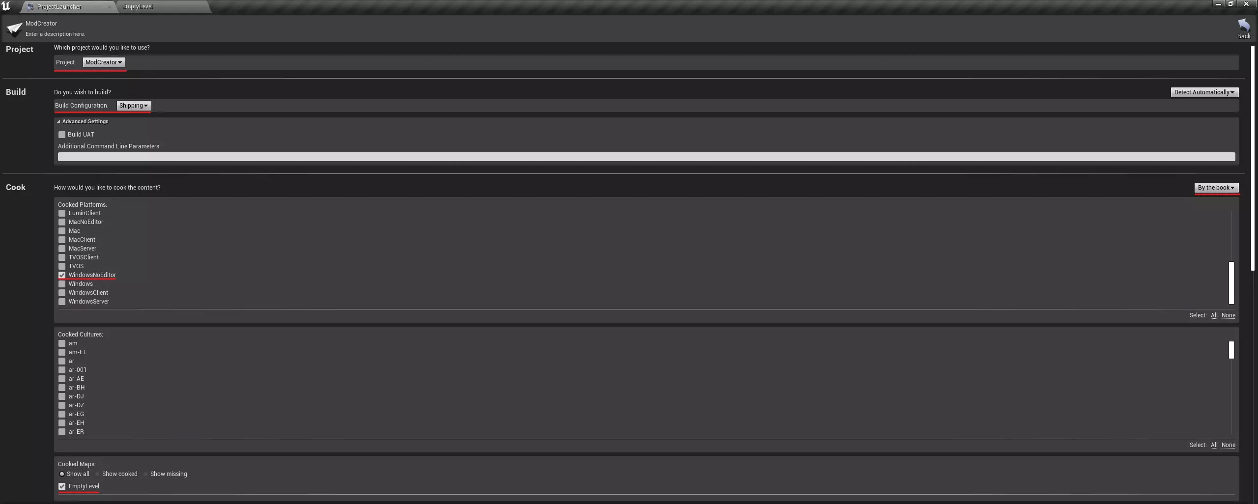 接下来,我们可以开始打包模组(详见模组打包)。 附:同样地,其他设置也需创建,例如,对于武器,需要基于BP_WeaponSettingsData创建一个数据资产。 模组打包 在添加内容并创建模组后,我们就可以进行打包了。为此,我们需要在项目启动器中创建几个配置文件。首先,我们要为项目本身添加一个配置文件(没有它,插件无法打包),然后再专门为插件(在我们的例子中就是模组)添加一个配置文件。 那么,让我们开始: • 首先,如果你的项目中没有关卡,需要创建一个(在我们的示例中是EmptyLevel)。 文件 -> 另存为...或按Ctrl + Shift + S 输入名称,选择位置,然后点击保存 • 打开项目启动器
