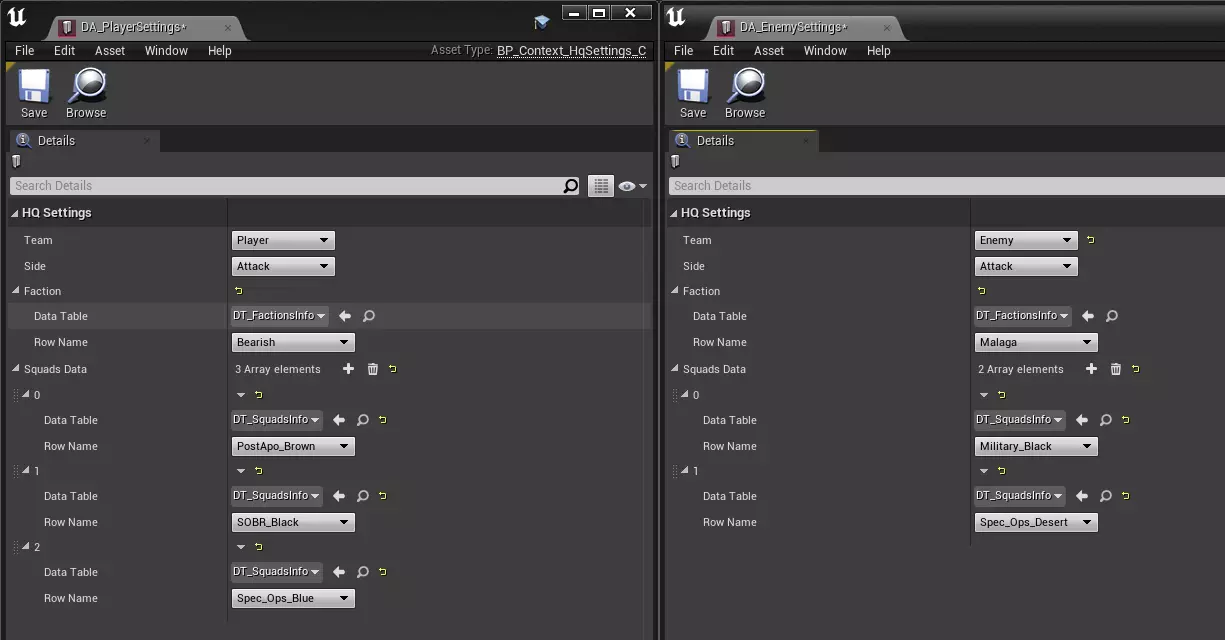 接下来,我们需要填写玩家和敌人的数据。为此,请使用BP_Context_HqSettings。选择队伍、阵营,为他们设置派系以及小队。为双方队伍都执行此操作。