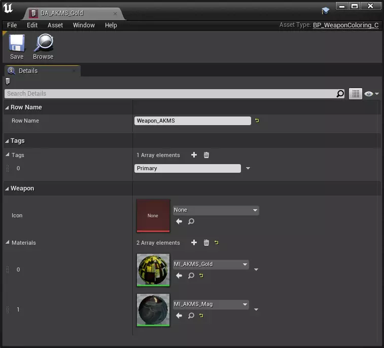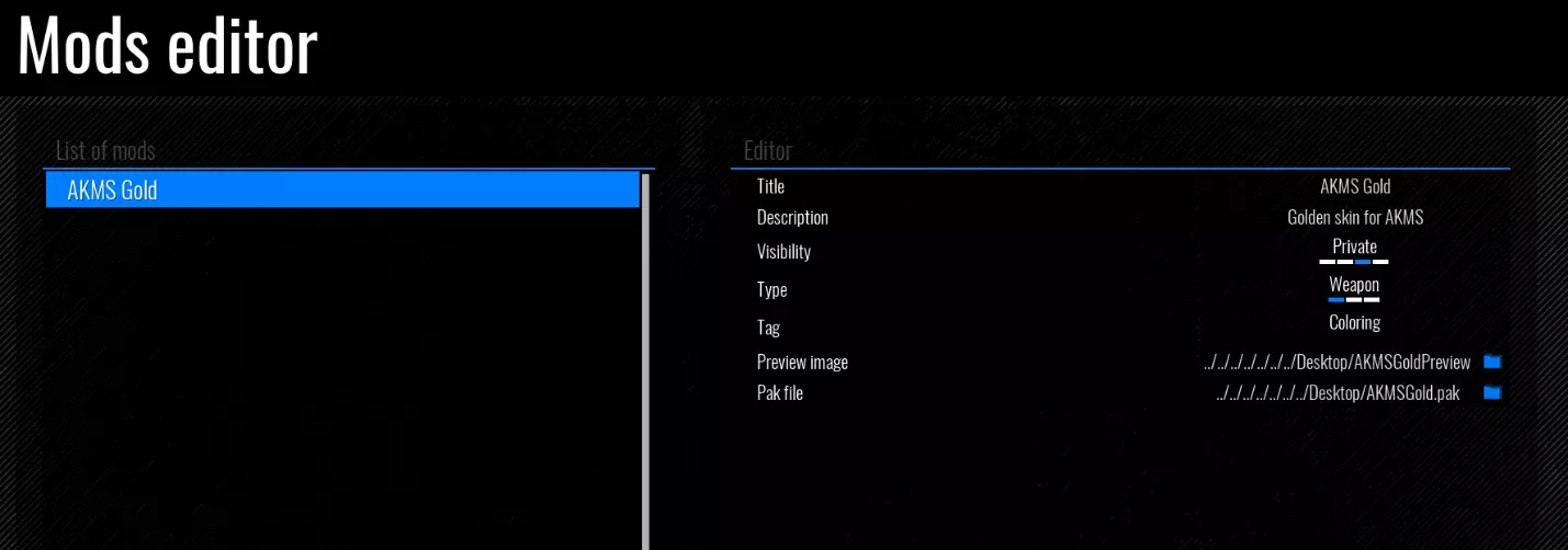 补充说明:如果不想使用某些字段,可以跳过。游戏将使用默认参数(注意:【图标】参数,请参见武器染色)。编辑器表格名称说明 标题:将在Steam上显示的模组名称 描述:模组的说明 可见性:设置模组对其他玩家的可见性 类型:设置模组的类型 标签:为模组类型设置附加数据 预览路径:输入路径或选择模组的预览图 内容路径:输入路径或选择包含内容的文件夹 参数表格名称说明 行名称:允许从TCW的表格中设置字符串 标签:允许添加标签 标签表格名称说明 主要:表示此数据资产将是主要的。一旦找到带有此标签的数据资产,搜索将中断。这意味着,一个模组中只能有一个带有此标签的数据资产。图片尺寸表 名称 尺寸 格式 武器 256 x 256 .png 载具 256 x 256 .png 关卡 512 x 512 .jpg 派系旗帜 230 x 150 .jpg 派系领袖 210 x 290 .png 示例 武器上色 AKMS黄金皮肤示例: