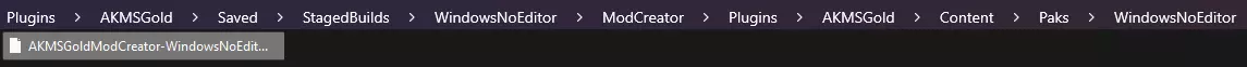 如果您的操作全部正确,构建过程应无错误。我们只需关注打包插件的pak文件。该文件位于以下目录路径中:/ModCreator/Plugins/AKMSGold/Saved/StagedBuilds/WindowsNoEditor/ModCreator/Plugins/AKMSGold/Content/Paks/WindowsNoEditor/AKMSGoldModCreator-WindowsNoEditor.pak