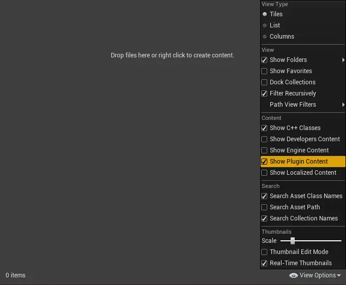 如果插件未显示,请检查您的内容显示设置。内容浏览器 -> 视图选项 -> 显示插件内容。