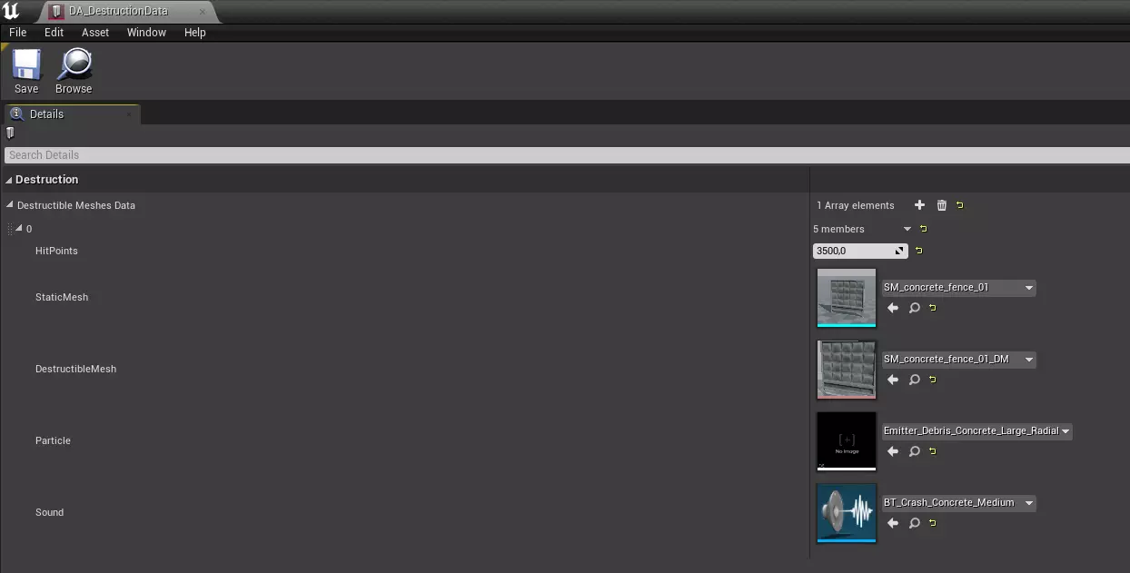接下来,如果我们想添加可破坏物体,需要将它们添加到BP_Context_Destruction中。在此之前,需创建所有必要内容(声音和效果可跳过,届时将使用默认效果)。对于破坏效果,我们使用【Apex Destruction】插件,该插件应已为你自动启用,若未启用,请在插件中添加。