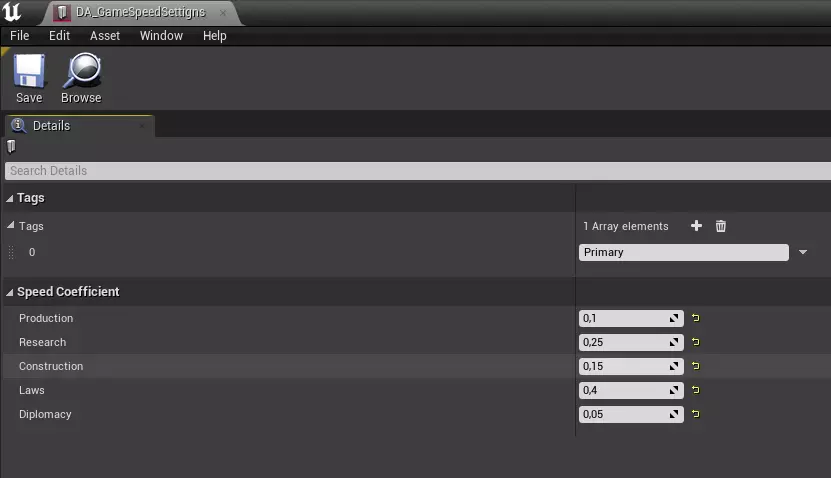 接下来,我们可以开始打包模组(详见模组打包)。 创建设置 • 基于BP_“设置类型”SettingsData创建数据资产(详见创建)。 我们以创建BP_GameSpeedSettingsData为例来讲解游戏速度设置。 • 填写基本参数(详见填充)。 • 设置所需系数。