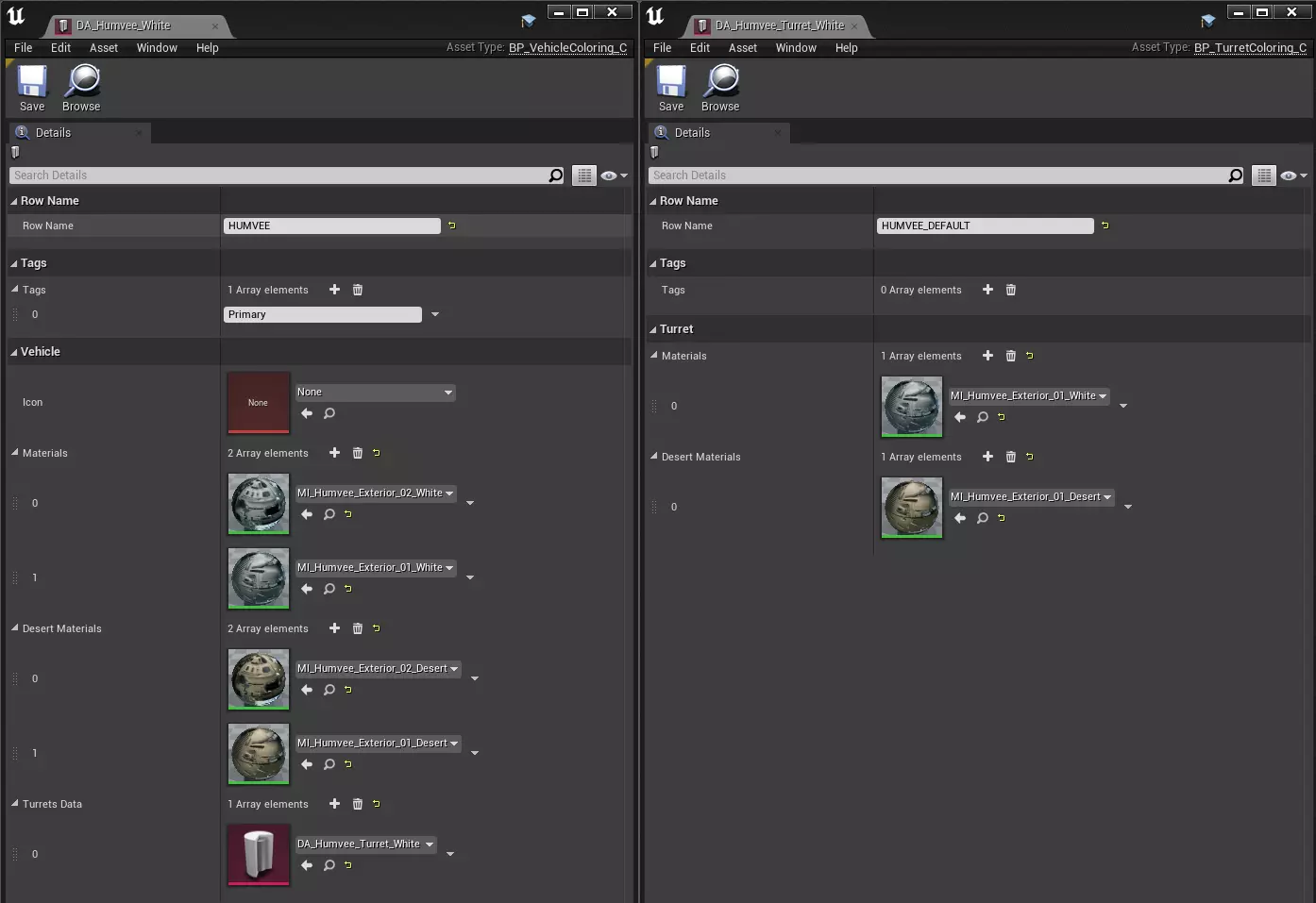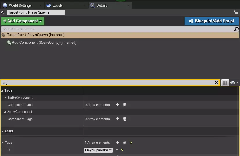 • 基于【BP_WeaponColoring】创建一个数据资产,并将其命名为【DA_AKMS_Gold】(参见创建部分)。 • 接下来,填写【DA_AKMS_Gold】的基本参数(参见填充部分)。 • 最后,按应用到模型的顺序添加之前创建的材质。如果想使用游戏内材质(例如车辆的玻璃材质),只需将数组元素留空。 • 接下来,我们可以开始打包模组(参见打包模组部分)。 创建模型 • 在任意3D编辑器中为模型创建模型和纹理(参见创建着色部分)。如果要制作骨骼网格体,请使用TCW中找到的“Skeleton”类型资产。 • 将内容导入UE(对于骨骼网格体,选择TCW中的骨架)。 静态网格体:链接骨骼网格体: • 基于基类创建一个数据资产,并添加后缀“Model”(参见创建)。 • 填充该数据资产(参见填充)。 • 填写附加字段。 • 接下来,我们可以开始打包模组(参见打包模组)。 创建关卡 • 创建新关卡或使用TCW中的某个生物群落。 • 设置光照。 • 设置导航。 • 在边界周围放置BP_DangerZone actor。它会警告并最终摧毁越界的玩家。• 在关卡中设置环境(树木、房屋、雾气等)。 在此阶段,我们的关卡在视觉上应已准备就绪,但游戏尚无法与之交互。为解决此问题,我们将使用标签。在任意 actor 的详情面板搜索栏中输入“tag”,并在数组中添加所需标签。 在此示例中,目标点已被分配【PlayerSpawnPoint】标签,该标签负责玩家的生成位置。