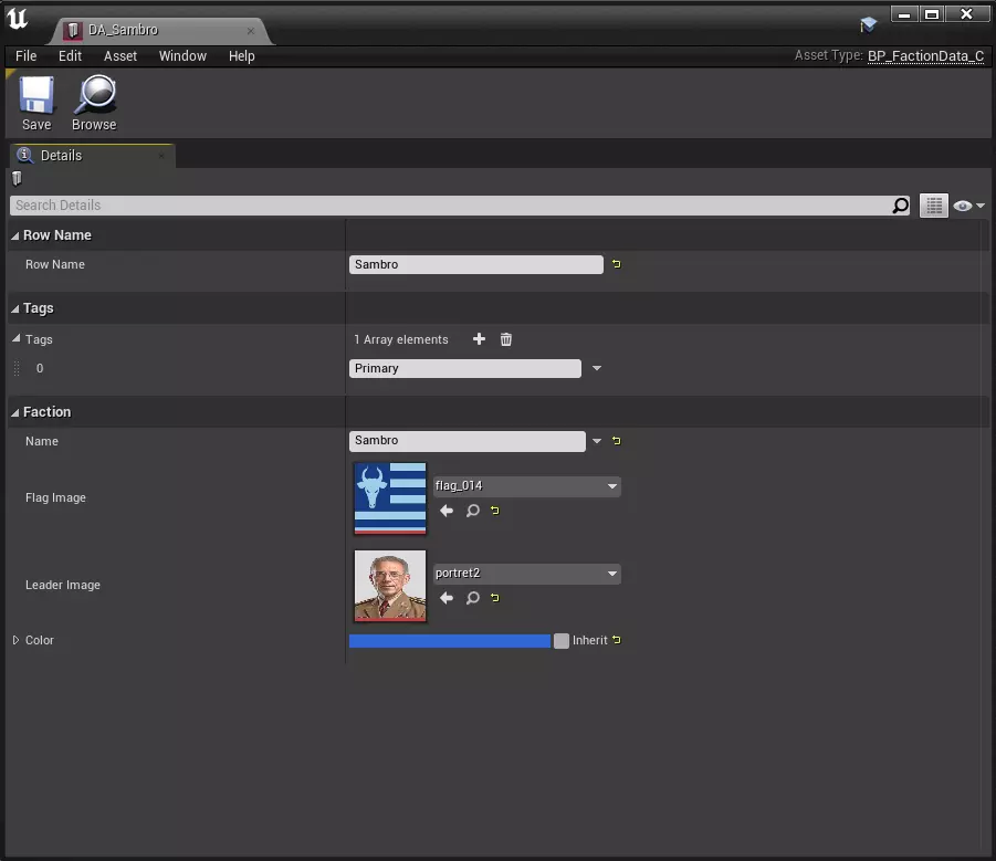 基于数据资产的模组选项: • 为派系创建旗帜和肖像图像。 • 基于BP_FactionData创建数据资产(参见创建)。 • 填写基本参数(参见填充)。 • 填写派系相关字段,插入图像、输入名称并选择颜色。
