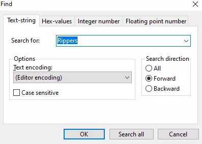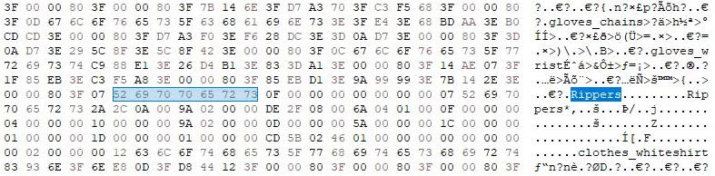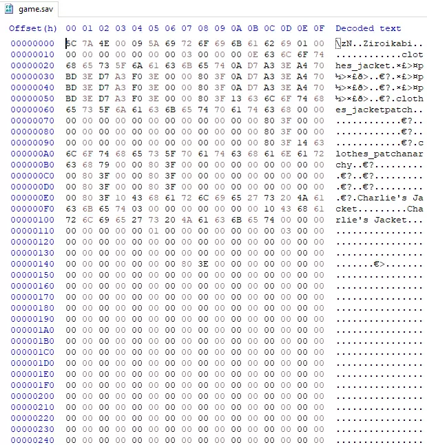 另一个警告:如果你还没有备份游戏存档,请务必进行备份,以防你弄错某些内容导致存档损坏。 如果你有很多角色的进度,可能很难找到你想要修改的确切内容。确定你正在操作哪个角色的最佳方法之一是保留他们带有名称的原始服装,这样你就可以向下滚动查看解码文本,当看到角色服装的相关内容时,你就知道自己找到了正确的位置。如果你出售或丢失了初始服装,角色对应的服装如下: 查理 - 狂战士 莱斯特 - 法师 汤米 - 萨满 雷克斯 - 坦克 凯莉 - 催眠师 查理 - 冰霜幽灵 莱斯特 - 巫妖 汤米 - 冰僧 雷克斯 - 半雪人 凯莉 - enchantress 查理 - 血法师 莱斯特 - 术士 汤米 - 圣骑士 雷克斯 - 死灵法师 凯莉 - 塞壬 查理 - 蝙蝠 莱斯特 - 稻草人 汤米 - 骷髅 雷克斯 - 尸体 凯莉 - 白狼 每一组后续角色都是你使用黄金票从秘密 boss 处解锁的角色。 另一种查找物品的方法是使用搜索功能,点击查找,然后输入名称,这样应该能带你找到物品的大致位置,例如: