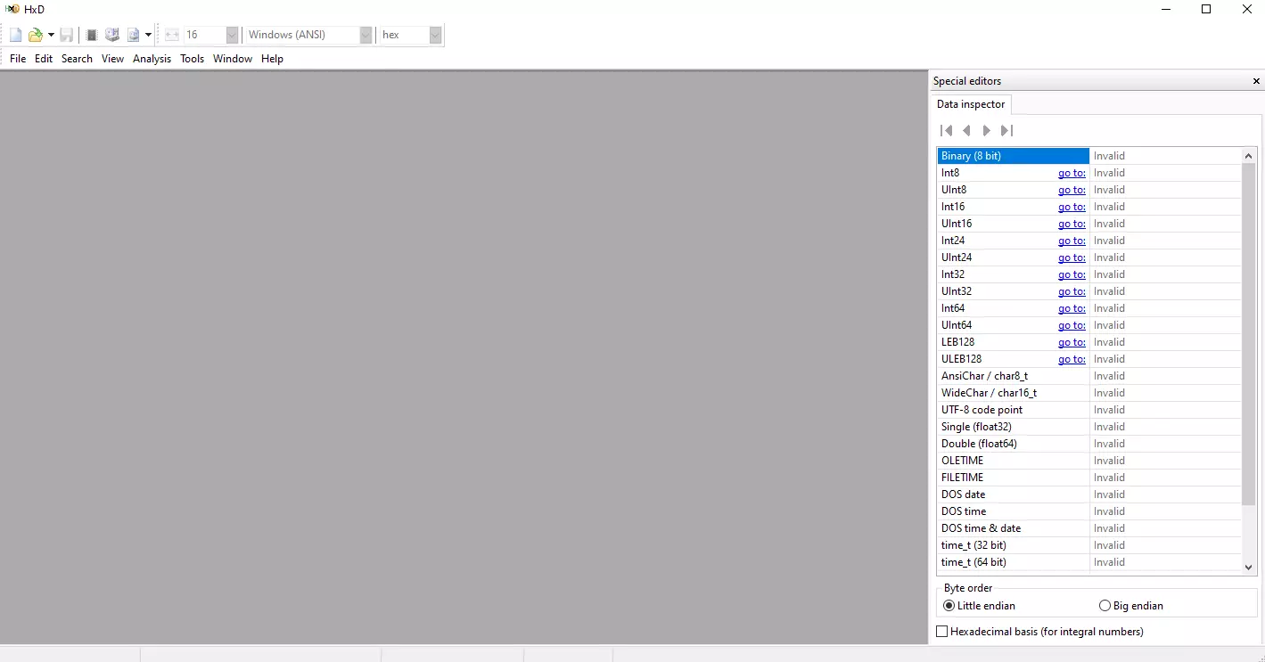 点击下载按钮,它会带你进入一个可以选择任意语言的页面。页面会下载一个包含十六进制编辑器安装程序的压缩文件,打开该文件并安装十六进制编辑器,之后你会看到一个空白的十六进制编辑器,界面如下。