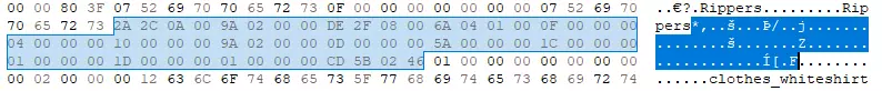 如果你有多个角色装备了相同的物品,可能很难区分他们谁是谁,但就我个人而言,我没有遇到过任何问题。 为了让内容更容易查看,我将每行的字节数从默认的16更改为24。这样做只是为了让后续内容的排版更清晰。 在我的示例中,我将使用【撕裂者】。物品的属性直接从服装名称结束后开始。我会在解码文本中突出显示【撕裂者】中字母“s”之后的部分,然后拖动选择,直到突出显示的长度达到3C(即60字节),这会显示在十六进制编辑器的最底部。