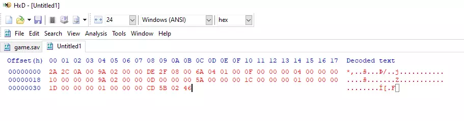 一种检查你是否选中了正确区域的方法是,末尾的4个字节应始终包含内容,因为这是服装的数值。并且,如果你的物品有任何黄色效果(如停滞),应该会有一组像“01 00 00 00”这样的4字节排列,由于该效果没有等级,这组4字节只是告诉游戏它处于激活状态。 为了操作更简便,首先复制选中的字节,然后点击左上角的新建按钮创建一个新页面,这样你就可以将字节粘贴到单独的区域,不必担心弄乱其他内容。 为了提升使用体验,请确保在这个新页面中再次将每行字节数设置为24。