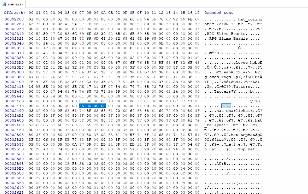 成功了! :) 目前我们还没有办法为装备添加其他遗物属性加成,比如稀有战利品掉落率,但如果有重要发现,我会更新本指南。 另外,有一种方法可以获取任意想要的遗物,包括因 bug 导致无法通过正常途径获得的宝石十字架。不过,你无法直接将它们添加到 inventory(背包)中,只能将已有的遗物替换成其他种类。我发现最好的方法是:购买一个例如钻石鳞片之类的遗物,保存并退出游戏。将其修改为你想要的任意遗物并保存。重新进入游戏后,你应该就能获得新的遗物了,之后只需再次购买钻石鳞片并重复上述操作,直到集齐所有遗物。下面我会简要说明如何找到并修改遗物。使用十六进制编辑器修改遗物 如果你打开十六进制编辑器并像往常一样找到你的存档文件,你可能会发现一些零星的字符串,其第一个字节不大于36,后面跟着三个空字节,显示为00 00 00。这些就是你的遗物,可能比较难找到。不过,如果你再次使用搜索功能并切换到十六进制值,就能很容易地找到它们。