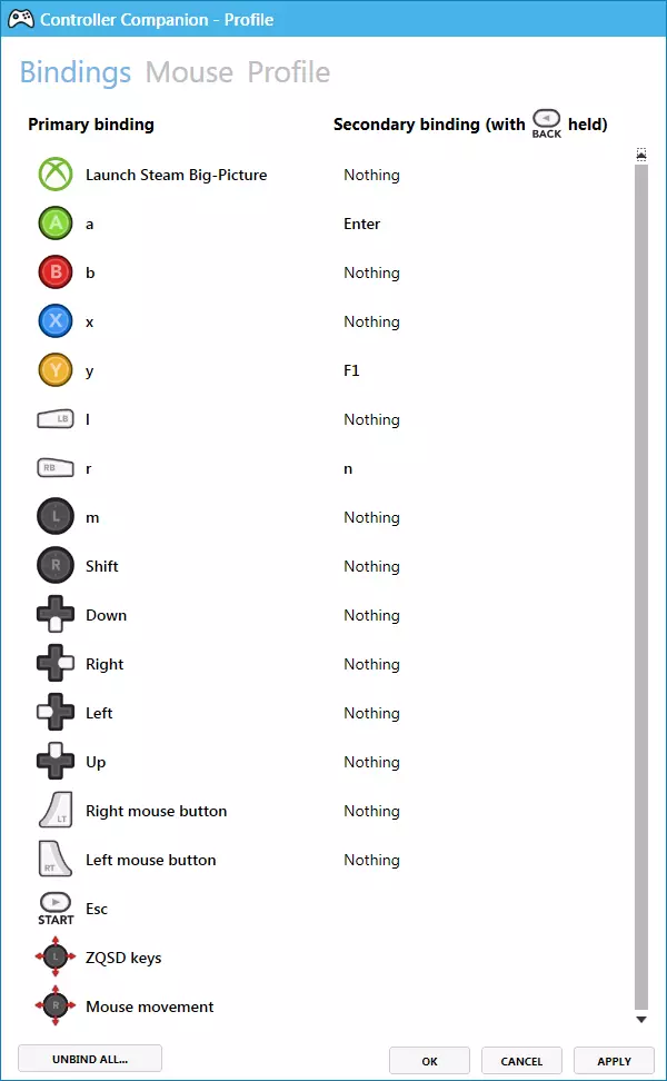 分配控制器按钮 第一步是点击左下角的【全部取消绑定】按钮。这样操作会更简便。 然后只需按照以下方式【精确】分配按钮。有些选择可能看起来很奇怪,但相信我。别问为什么,照做就行。:) 简而言之,游戏中有一些奇怪的用户界面功能,有时方向键可用,有时只有鼠标能用,再加上一些bug和不可避免的按键冲突,如果你完全按照下面的设置来,所有这些问题都可以避免。