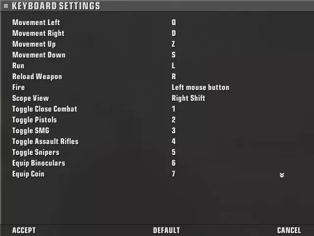 搞定。不客气。 向左移动 = Q 向右移动 = D 向上移动 = Z 向下移动 = S 奔跑 = L reload 武器 = R 开火 = 鼠标左键 瞄准镜视角 = 右 Shift 武器快捷键 = 1-7(在仅使用手柄的情况下,这些快捷键在游戏中无法真正使用;键盘上的这些快捷键非常好用,但今天我们要像在主机上一样游玩) 潜行 = 鼠标右键 丢弃/投掷 = Y 第一/第三人称 = F1 放大 = 上箭头 缩小 = 下箭头 物品栏菜单 = X 拾取 = B 动作 = A 游戏内菜单 = Esc 任务简报菜单 = N 地图 = M 菜单向下 = 下方向键* 菜单向上 = 上方向键* 菜单向左 = 左方向键* 菜单向右 = 右方向键* (*记住不要触碰这四个键,以免出现我提到的那个故障) 菜单返回 = B 菜单选择 = A