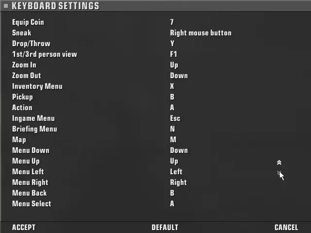 有几点需要注意……是的,左摇杆的移动按键对应ZQSD。不要选择WASD或方向键——出于稍后会说明的原因,这些按键无法用于角色移动。不过你用的是手柄,所以幕后设置的是什么按键其实无所谓,对吧?没错,它就是能正常工作。 另一个需要快速注意的是,左扳机键对应鼠标右键……而右扳机键对应鼠标左键。 此外,右侧列允许分配次要功能,通过按住手柄上的返回键来使用。(返回键的功能基本类似于“Shift”或修改键)。这是一个可以根据个人偏好重新分配按键的区域,不会产生什么实际不良影响。我会将第二列中的“A”键设置为“Enter”键,如图所示——在游戏任务之间,你必须按Enter键才能继续,没有其他办法。通常人们在游戏中按“A”键来浏览菜单界面,这样你就可以按“Shift+A”(即“后退键”+“A”键)来输入游戏所需的Enter键。 除此之外,键盘上的“n”键对应笔记本/任务简报,我将其设置为“后退键”+“RB”键——你也可以将“n”键分配给任何你喜欢的备用控制器按钮。“m”键对应地图,我选择将其映射到左摇杆,而切换第一人称和第三人称视角(“F1”键)则设置为“后退键”+“Y”键。你可以根据自己的喜好随意调整这些按键。 但其他大多数按键你最好保持默认设置。这是一种结合了原版主机版《杀手:血钱》控制方式、一些类似新《杀手》游戏的改动,以及为确保能在不使用键盘鼠标的情况下正常操作所有功能而必须保留的几项设置的组合。 设置好这些按键后,点击应用/确定,然后启动游戏。这样,每当启动《杀手:血钱》时,手柄就会自动加载我们在Controller Companion中创建的这个配置文件来使用这些控制方式。 在游戏内编辑控制设置 在《杀手:血钱》中,进入选项>控制,编辑你的键盘配置。 **务必严格按照所示内容进行设置!** 特别需要注意的是,确保将上下左右箭头键保留为列表底部的“菜单”键,不要将它们设置为其他任何功能。如果你更改这些设置,游戏可能会出现一个故障,即在游戏内菜单中上下点击选择项时会跳过每隔一个的选项。即使你编辑后再改回原样,该故障仍然存在,必须从头重新设置所有控制项。这是一个奇怪的漏洞,显然在Steam版本中从未被修复。不过,既然控制器伴侣中已经设置好了所有按钮,你应该没有什么理由要在这里更改这些控制设置。如果你出于个人偏好确实需要更改某些明显的设置,可以尝试编辑,但如果你这么做了,我无法提供帮助。游戏里有些奇怪的问题,经过大量测试,这个特定的配置涵盖了所有游戏功能,并避免了所有按键冲突和漏洞。再说一次,其中一些设置看起来可能很奇怪……甚至有些离谱……但请再次相信我。按我说的做,就不会有问题。先从移动按键说起——没错,这些设置是正确的。这是一种不常见的ZQSD布局,源自法语AZERTY键盘,我们已经在Controller Companion中将其设为左模拟摇杆功能。这样一来,方向键就可以解放出来用于菜单操作和游戏内物品选择,“A”键也能腾出来用于选择物品(这使得WASD键无法再用于移动),而且……最关键的是,这能让游戏内的HUD覆盖层显示在屏幕左上角,模拟Xbox手柄的Y-B-A按键布局。