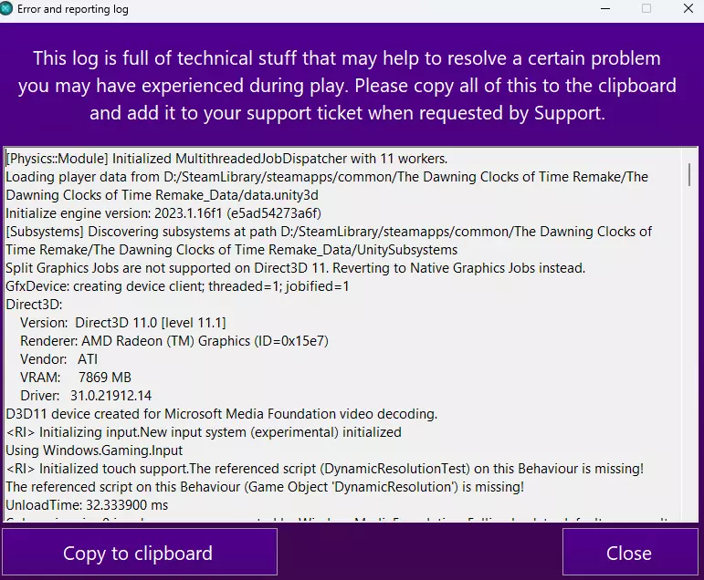 你可以使用此选项打开游戏的调试日志和错误报告,若有需要或认为有帮助,你可以将其复制到剪贴板并发送给技术支持。