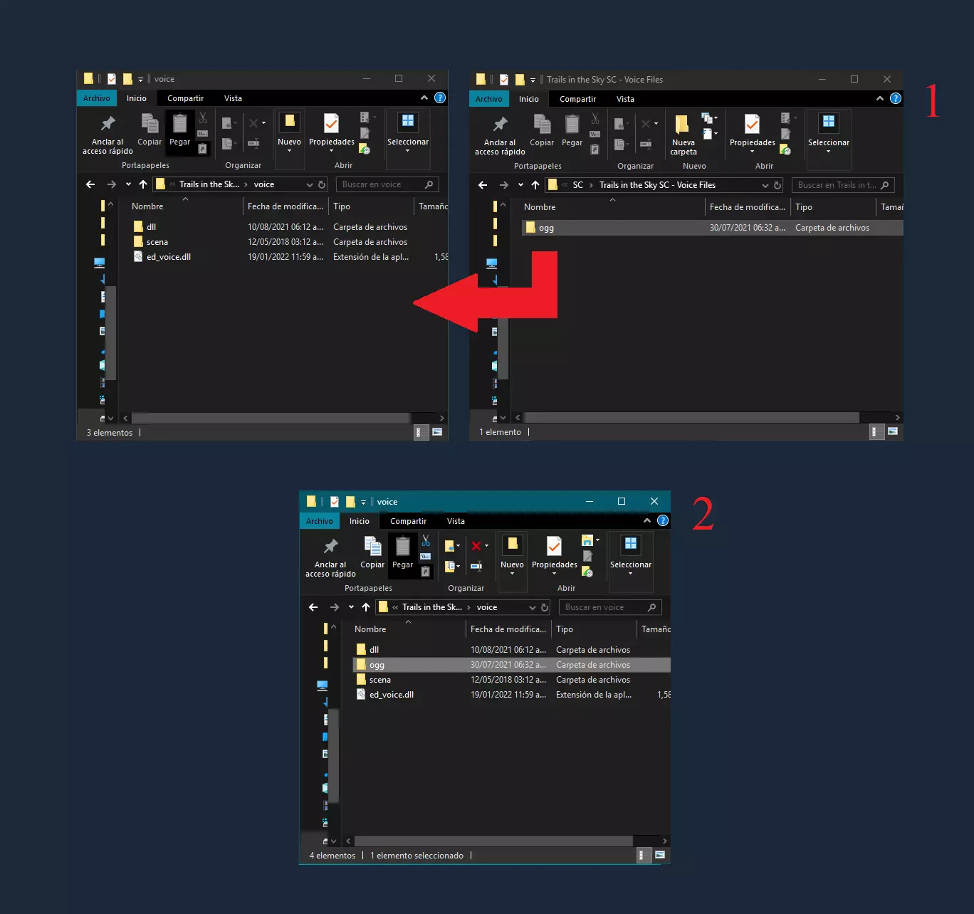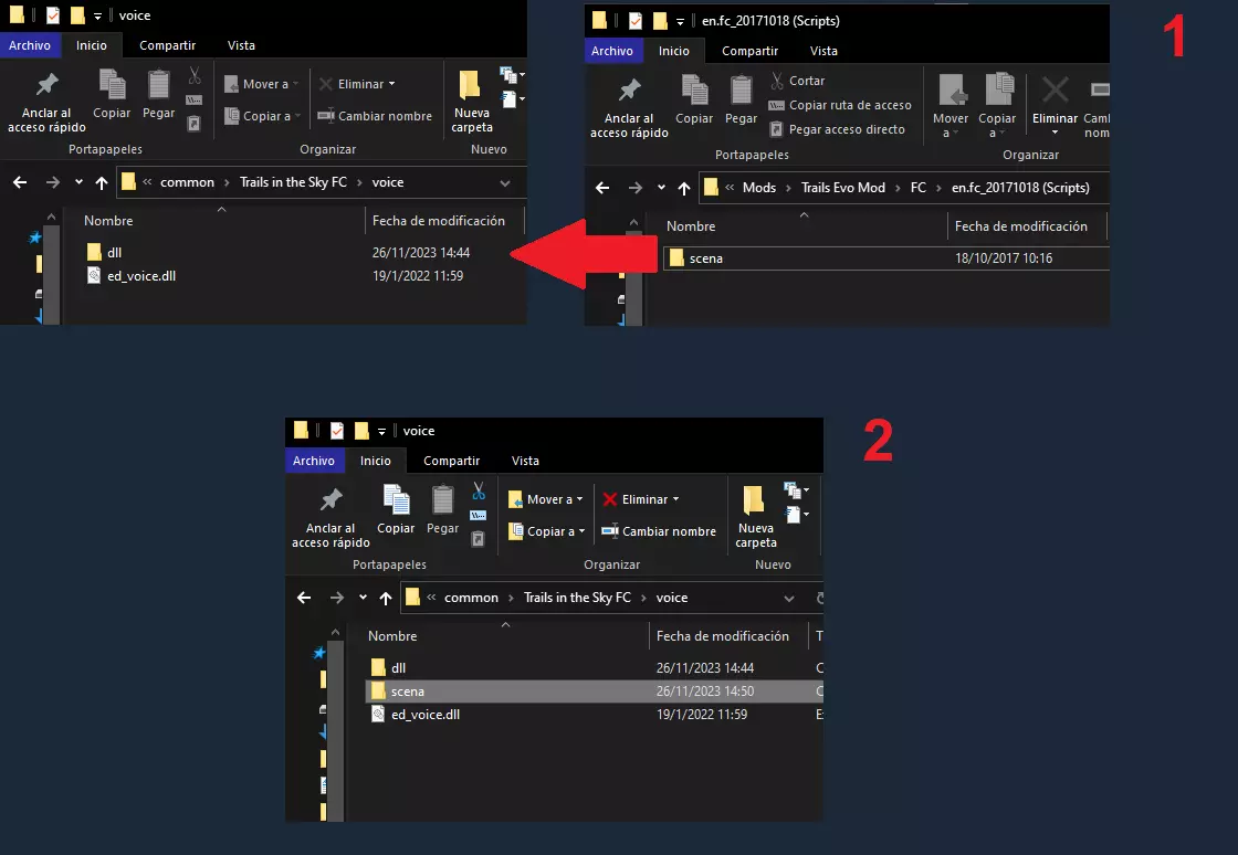 步骤/第二步 脚本 西班牙语 将对应游戏的文件解压到你要安装模组的位置: 《英雄传说:空之轨迹FC》对应文件为“en.fc_20171018.z7” 《英雄传说:空之轨迹SC》对应文件为“en.sc_20180512.z7” 《英雄传说:空之轨迹3rd》对应文件为“en,3rd:20180519.z7” 1. 每个文件应包含一个名为“scena”的文件夹,你需要将此文件夹粘贴到上一步复制的“Voice”文件夹中。 2. “voice”文件夹内的文件应与第二张图片所示一致。 英语 将对应游戏的文件解压到你要安装模组的位置: 《英雄传说:空之轨迹FC》对应文件为“en.fc_20171018.z7” 《英雄传说:空之轨迹SC》对应文件为“en.sc_20180512.z7” 《英雄传说:空之轨迹3rd》对应文件为“en,3rd:20180519.z7” 1.每个文件应包含一个名为【scene】的文件夹,此文件夹需粘贴到上一步复制的【Voice】文件夹中。 2. 【Voice】文件夹内的文件应与第二张图片所示一致。 示例