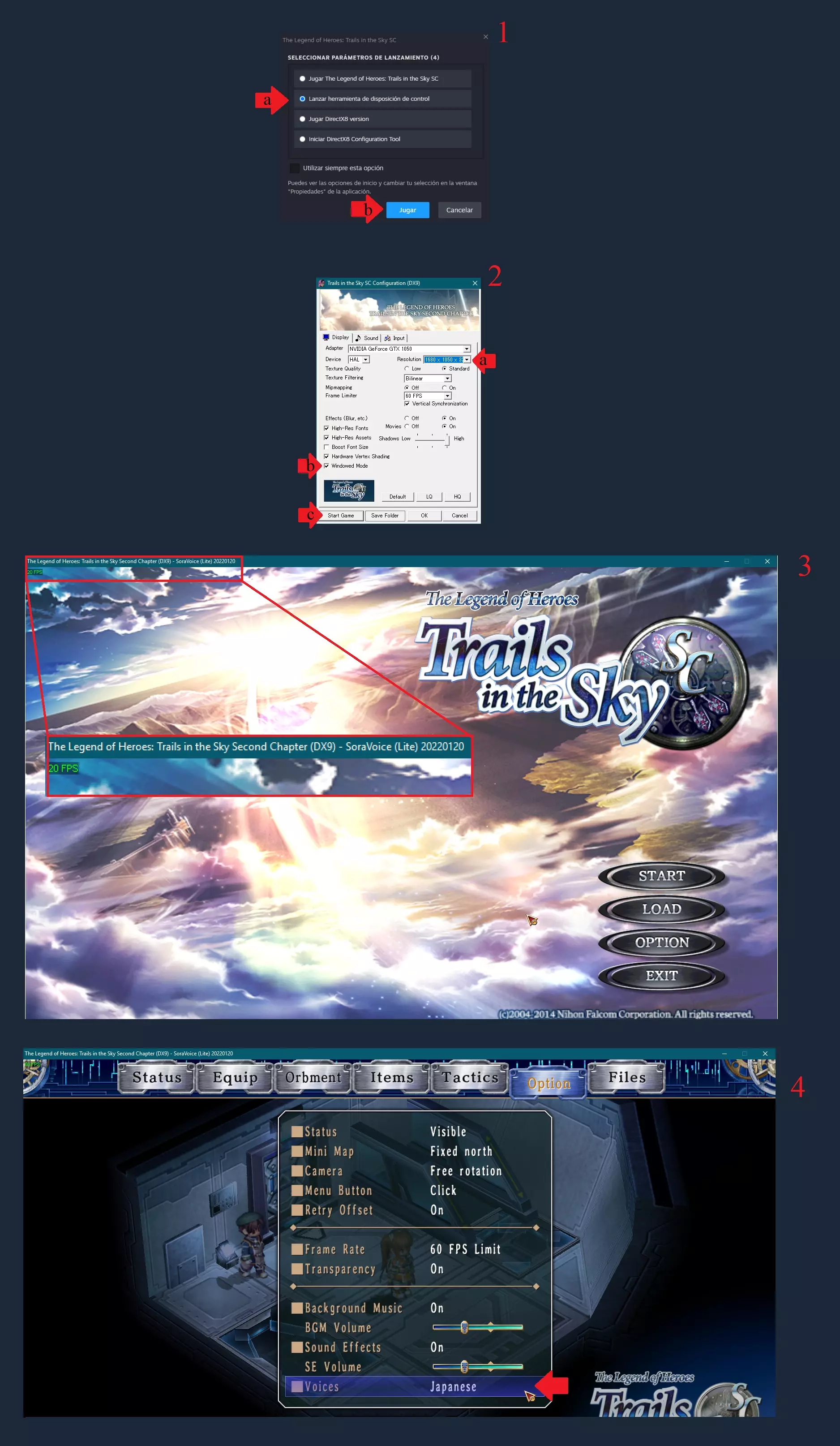 步骤5:测试 西班牙语 在这部分,你需要测试配音模组的运行情况。 注意:无需执行以下步骤(本步骤中的第四条指示除外),这些仅为验证模组是否正在运行的示例。如果你不想执行这些步骤,直接正常启动游戏即可。 无论如何,你都会发现模组是否正常运行 xD 以窗口模式启动游戏,方法是从你的Steam库启动游戏,而非游戏的快捷方式。 1. 在Steam启动窗口中选择第二个选项,打开游戏设置窗口。 2.a) 将游戏分辨率调整为低于显示器原生分辨率的数值。 b) 确认已勾选【窗口模式】选项。若使用显示器的完整分辨率,该选项将显示为【无边框窗口模式】。 c) 点击【开始游戏】按钮。 3. 若模组安装正确,屏幕顶部会显示【SoraVoiceLite】字样,这表明模组正在正常运行。开始游戏,并通过重要角色验证语音是否可正常播放。 4. 在游戏内打开选项,将【语音】设置更改为【日语】,这样战斗语音也将切换为日语。在本部分中,你需要测试配音模组。 注意:无需执行以下步骤(本步骤中的第四条指示除外),这些仅为验证模组是否运行的示例。如果你不想执行这些步骤,直接正常启动游戏即可。 无论如何,你都能发现模组是否正常工作。 以窗口模式启动游戏,操作方法是从你的Steam库启动游戏,而非游戏快捷方式。 1. 选择Steam启动框中的第二个选项,以打开游戏设置框。 2.按照以下说明操作: a) 将游戏分辨率调整为低于显示器原生分辨率的数值。 b) 确认已勾选【窗口模式】选项,若使用显示器的完整分辨率,该选项将显示为【无边框窗口模式】。 c) 点击【开始游戏】按钮。 3. 若模组安装正确,顶部会显示【SoraVoiceLite】文字,这表明模组正常运行。启动游戏后,与重要角色对话,检查是否能听到语音。 4. 打开游戏内选项,将【语音】设置更改为【日语】,这样战斗语音也将以日语播放。