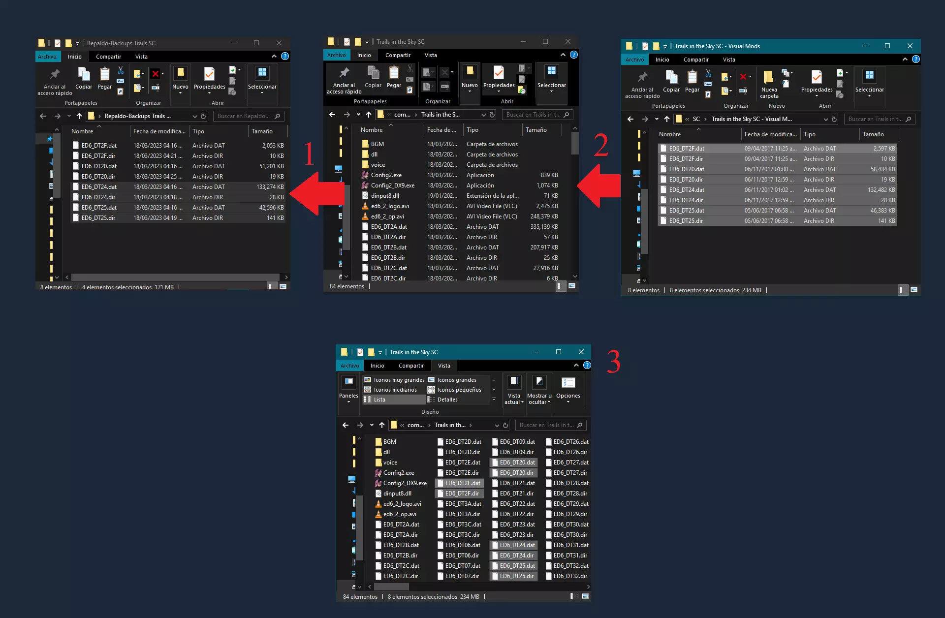 步骤7:视觉效果 解压与你的游戏对应的“视觉模组”文件,其中包含“.dat”和“.dir”格式的文件对,请注意这些文件的名称。 1. 首先,你需要在游戏根目录中找到这些文件,并将它们备份到另一个文件夹中,该文件夹也可用于备份其他文件。 2. 然后,将模组文件复制粘贴到游戏根目录,并替换所有文件。 3. 系统会标记出已替换的文件。 重新打开游戏,确认美术资源是否已更改。1. 首先,你需要在游戏的根文件夹中找到相关文件,并将它们备份到另一个文件夹中,该文件夹也可用于备份其他文件。 2. 然后,将模组文件复制粘贴到游戏根文件夹,并替换所有文件。 3. 文件夹会标记出已替换的文件。 重新打开游戏,确认美术资源是否已更改。 示例