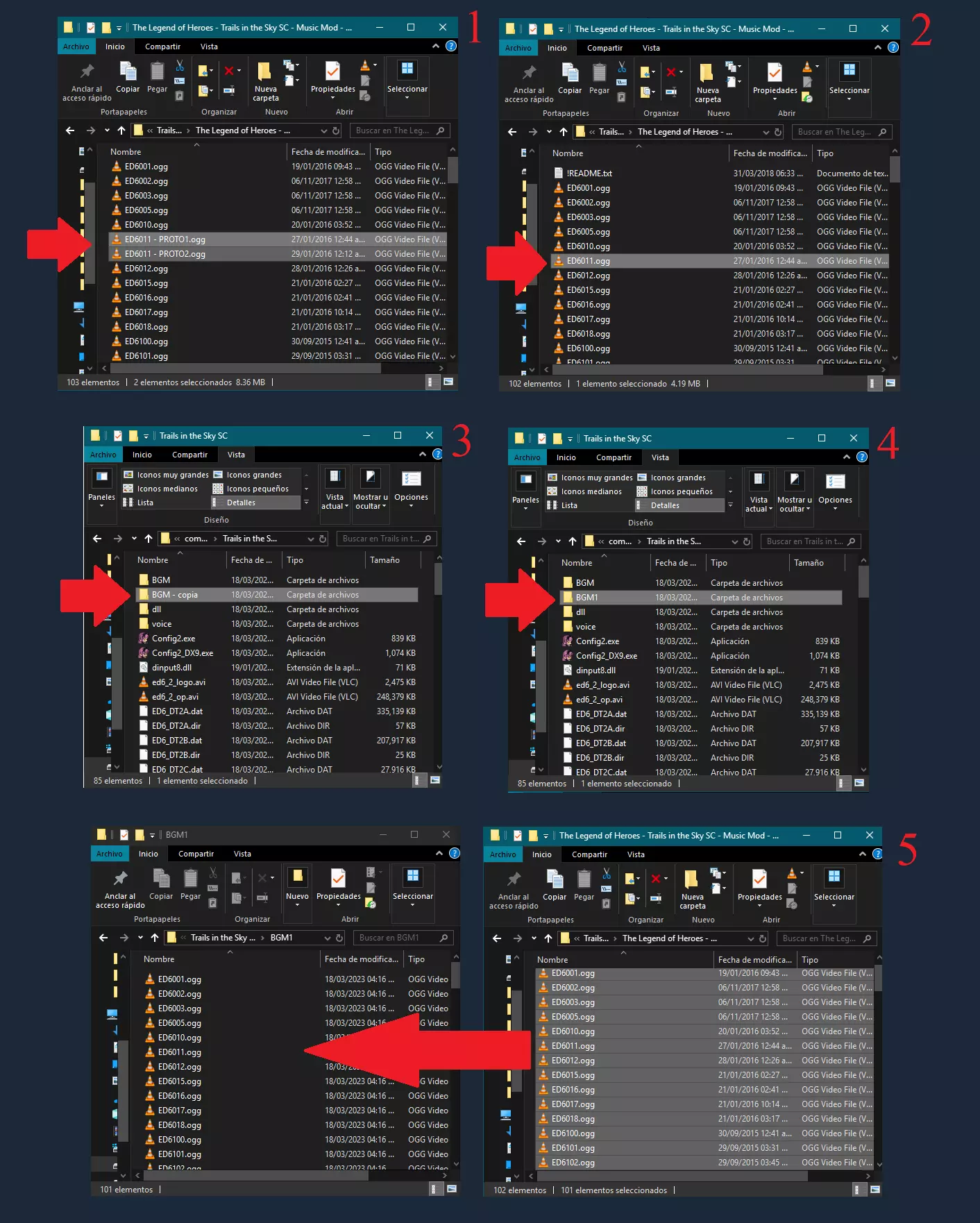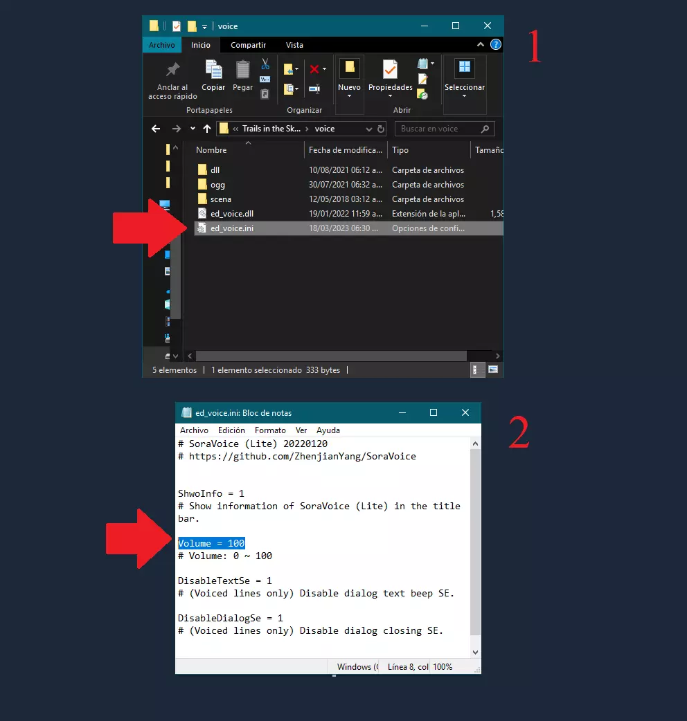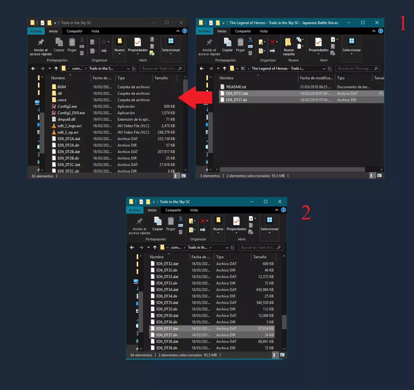步骤9:视频 示例图片将暂时缺失,直至找到解决黑屏问题的方法。 解压对应游戏的“Videos”文件夹,其中包含一些.dat、.avi和.ogg文件,记下它们的名称。 1. 备份原始文件,大部分可在游戏根目录找到,.ogg文件可在BGM文件夹中找到。 2. 将.dat文件和.avi视频复制到游戏根目录,并替换原始文件。 3. 将.ogg文件复制到“BGM”和“BGM1”文件夹并替换原始文件,这一点很重要,因为部分过场动画的音频是分离的,若不这样做,视频可能会出现音画不同步或无声音的情况。 4打开游戏,启动时你应该会看到重制版的Falcom标志。 如果打开游戏后出现黑屏,那么你需要安装一个程序来运行过场动画。 只需在你的电脑上安装该程序并尝试重新打开游戏,现在应该可以正常运行了。 不过在我遇到的情况中,有一个小问题,就是只有标志的开场动画没有正确匹配音频,听到的是原版开场的音轨,除此之外没有发现其他问题。 此步骤的示例图片将在我找到黑屏问题的解决方案后提供。 解压与你的游戏对应的“Videos”文件,里面会有一些文件。dat、avi和ogg,记住它们的名称。 1.1. 备份原始文件,大部分文件可在游戏根目录中找到,ogg文件则位于BGM文件夹内。 2. 将.dat文件和.avi视频复制到游戏根目录,并替换原始文件。 3. 将.ogg文件复制到BGM和BGM1文件夹中并替换原始文件,这一步很重要,因为部分过场动画有独立音频,若不执行此操作,视频可能会出现声音过时或无声音的情况。 4. 启动游戏,开始时应能看到高清重制的Falcom标志。 如果启动游戏后出现黑屏,则需要安装一个程序以确保过场动画正常运行。只需在您的电脑上安装该程序,然后重试打开游戏,现在应该可以正常运行了。 不过在我的情况中,我发现了一个小错误,那就是只有标志的开头部分没有与音频同步,并且能听到原始的开头音轨,除此之外我没有发现任何问题。 下一个链接包含我上传的文件,并且我已经验证了其功能。 适用于3款游戏的文件安装方法对于所有游戏几乎相同,仅文件名会有所变化。谷歌云端硬盘文件夹进度:《英雄传说:空之轨迹FC》,状态:可安装(100%)。SoraVoiceLite(SoraVoiceLite_20220120.7z)- 正常。脚本 - (en.fc_20171018.z7)- 正常。语音文件 - (Trails in the Sky FC - Voices Files..Z7)- 正常。战斗语音 - (Trails in the Sky FC - Battle Voices. Zip)- 正常。视觉模组 - (Trails in the Sky FC - Visual Mod..Zip)- 正常。视频模组 - (Trails in the Sky FC - Videos Mod.rar)- 正常。音乐模组 - (Trails in the Sky FC - Music Mod.)《英雄传说:空之轨迹 SC》:状态:可安装(100%) SoraVoiceLite(SoraVoiceLite_20180512.z7)- 正常 脚本 - (en.sc_20180512.z7)- 正常 语音文件 - (空之轨迹 SC - 语音文件.z7)- 正常 战斗语音 - (空之轨迹 SC - 日语战斗语音.Zip)- 正常 视觉模组 - (空之轨迹 SC - 视觉模组.rar)- 正常 视频模组 - (空之轨迹 SC - 视频.rar)- 正常 音乐模组 - (空之轨迹 SC - 音乐模组.rar)- 正常 《英雄传说:空之轨迹 3rd》:状态:可安装(90%) SoraVoiceLite(SoraVoiceLite_20220120.7z)- 正常 脚本 - (en.3rd_20180519.z7)- 正常 语音文件 - (空之轨迹 3rd - 语音文件.z7)- 正常 战斗语音 - (空之轨迹 3rd - 日语战斗语音)Zip) - 正常 视觉模组 - (《英雄传说:空之轨迹3rd》视觉模组..Zip)- 正常 视频模组 - 未上传 音乐模组 - (《英雄传说:空之轨迹3rd》音乐模组.zip)- 正常 这里提供一个MEGA的备用链接,你可以在其中找到相关文件,但这些文件的名称带有扩展名,使用前需要删除。例如:ed6_dt25_evov1.dir,你需要删除其中的“_evov1”。 该文件夹中还包含一些.bat文件,这是一种安装程序,不过说实话我并没有使用过。 ❗注意❗:MEGA文件夹并非我所有,若未来该链接失效,我无法提供帮助。 这里提供一个MEGA的备用链接,你可以在其中找到相关文件,但这些文件的名称带有扩展名,使用前需要删除。例如:ed6_dt25_evov1。请删除文件夹名称中的“_evov1”。该文件夹中还包含一些.bat文件,它们是一种我并未实际使用的安装程序。注意:MEGA文件夹并非我所有,若未来其丢失,我无法提供帮助。《英雄传说:空之轨迹FC》西班牙语翻译补丁终于在2022年1月版本中发布,不过情况并非尽如人意,该补丁在一定程度上仍与进化模组存在兼容性问题。 如果你想游玩带有日语配音的西班牙语版本,建议仅安装补丁至第四步。 但如果你希望体验完整的西班牙语进化版内容,恐怕无法实现。即使运气好能部分运行,由于翻译模组与进化模组使用部分相同文件,会导致冲突,使得游戏菜单显示为西班牙语,而所有对话仍为英语。此处内容包含外部链接,已按规则处理。