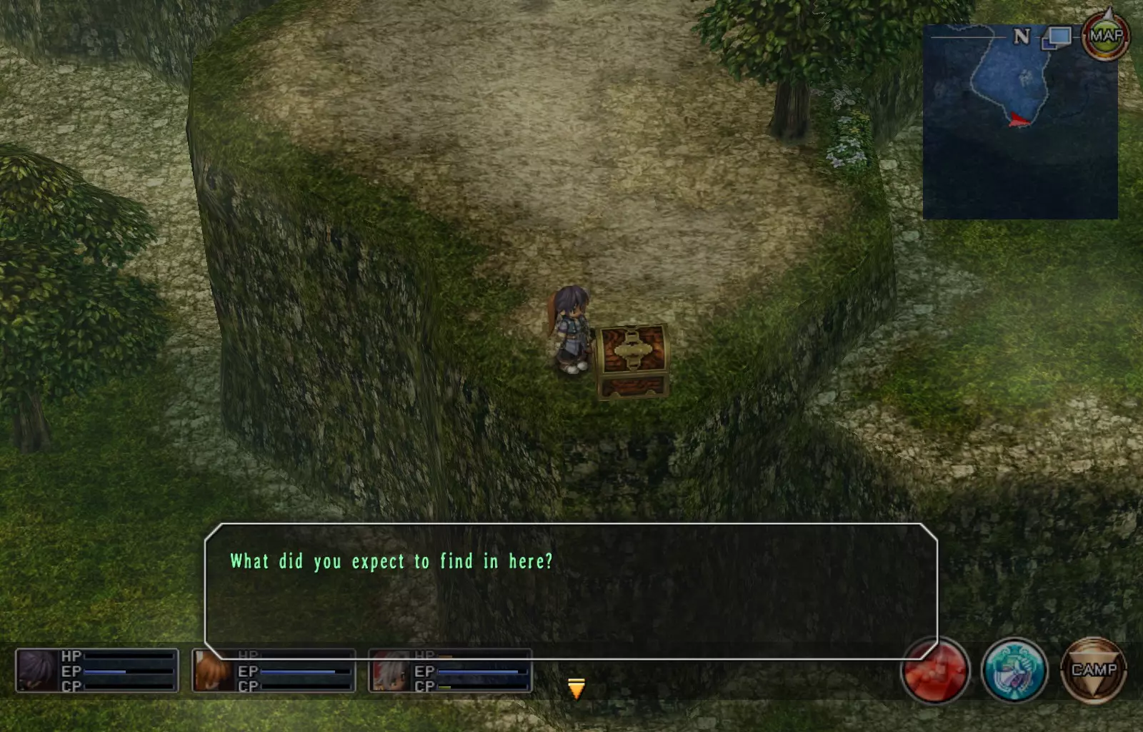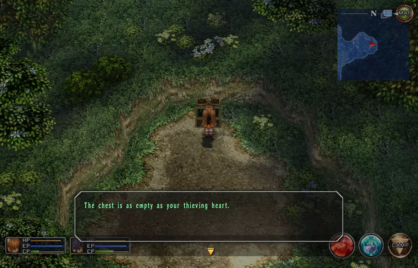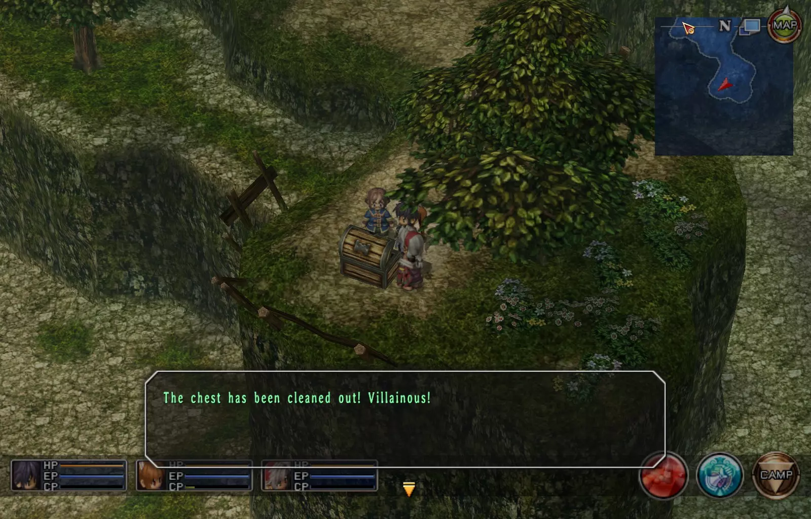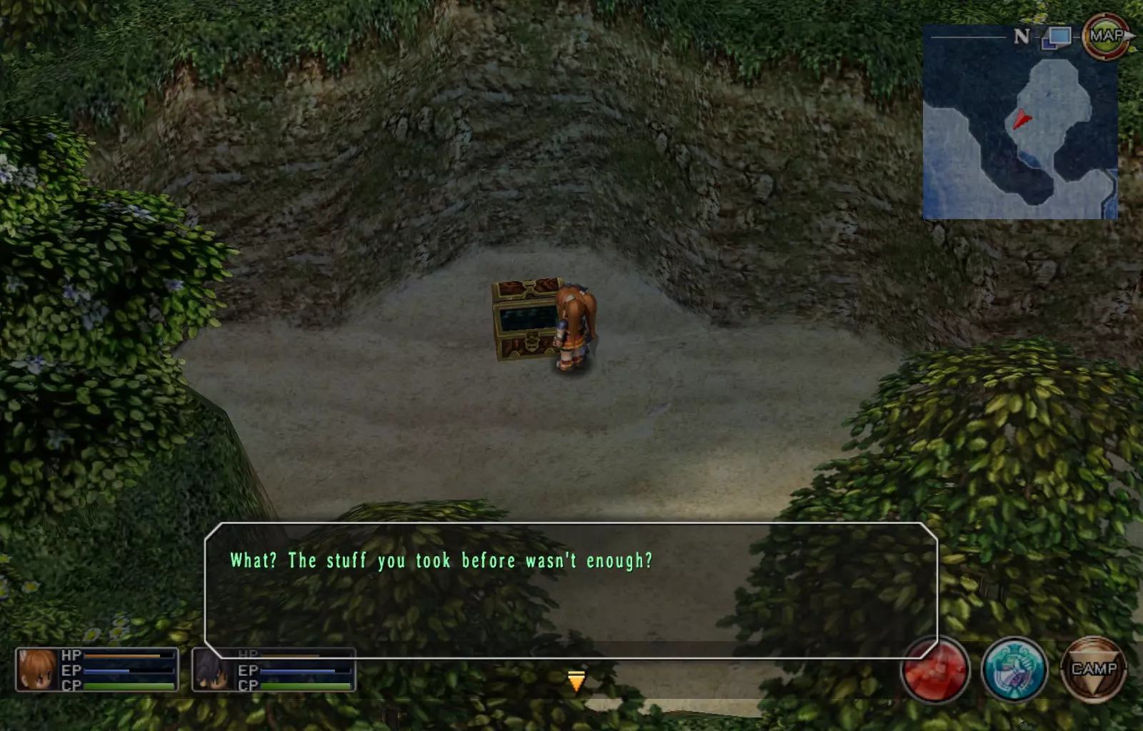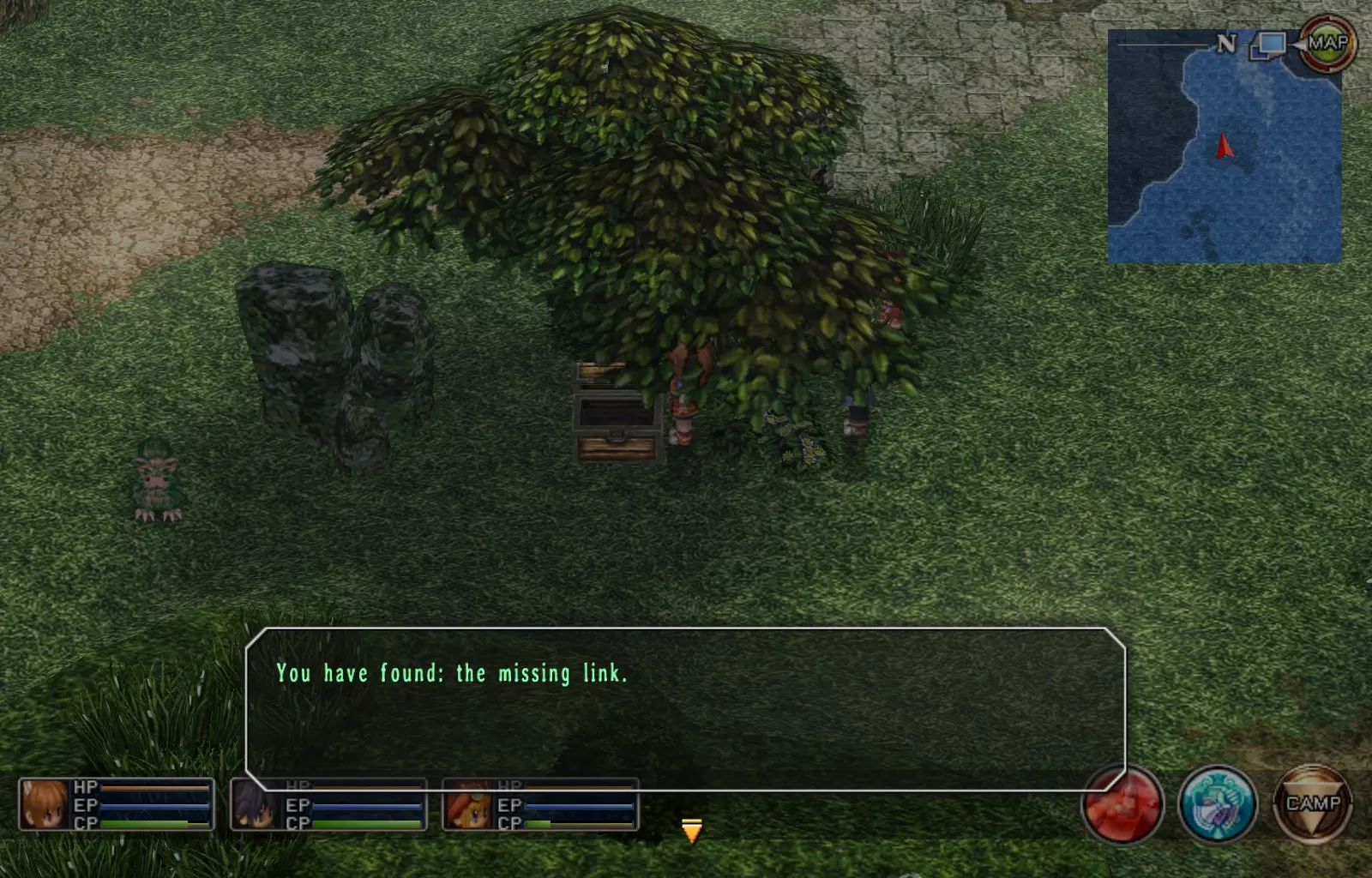 第一章结束结果:(33[+1][+3]/163个宝箱) 注意,这里又有3个宝箱不算数。我不知道是哪两个,因为检查完所有宝箱后,我显示的是33/163。 其中一个宝箱位于空贼要塞。另外两个,我不清楚。 第二章 克朗小径,卢安侧 [RKrTr] EP填充剂(38/163) 沿着小路走,你会看到小路分叉通向一些树木。宝箱就藏在这些树下面。